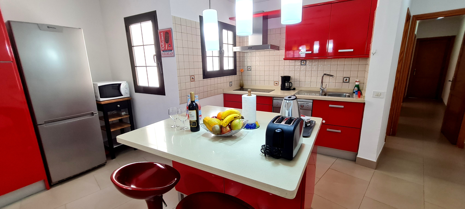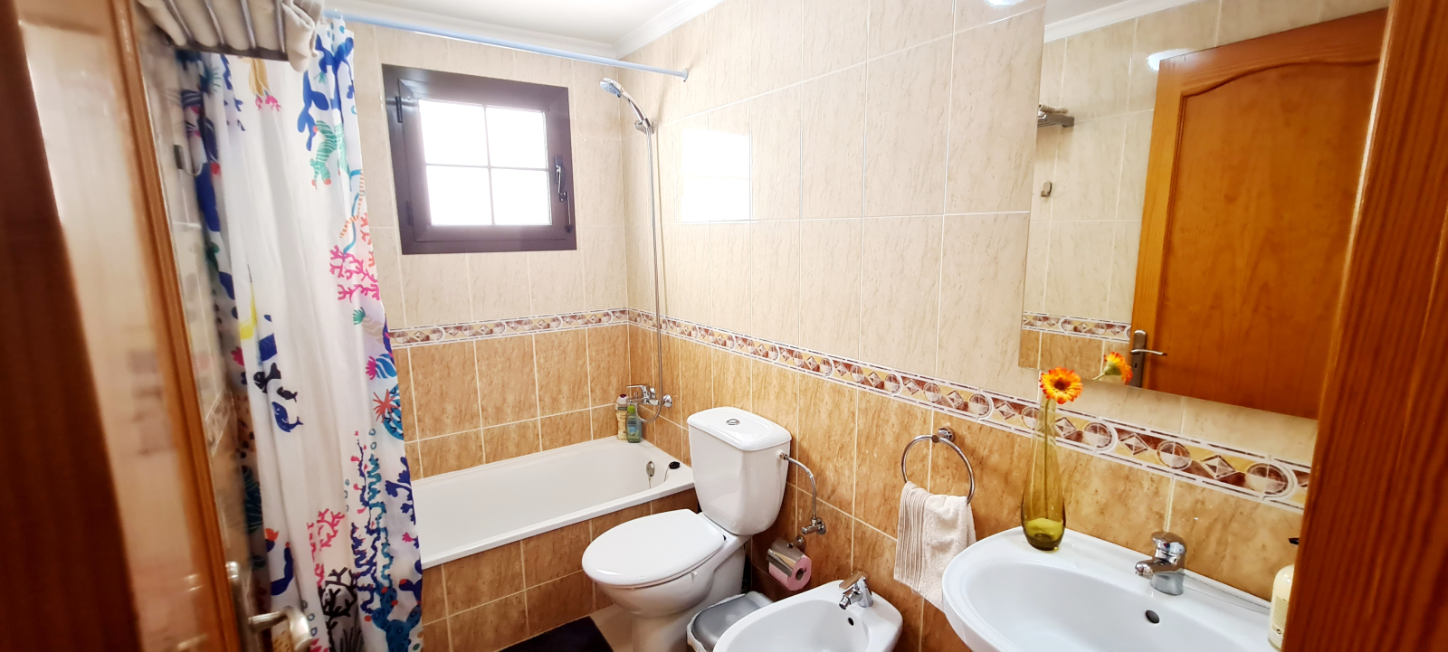 Si tratta di un appartamento ristrutturato di 100 m2, con vista sul mare da un piccolo balcone e a 20 metri da una lunga passeggiata. Dispone di 3 camere da letto, una matrimoniale con letto king size e le altre due rispettivamente con letto matrimoniale e letto singolo. 2 bagni (1 con bagno privato e camera da letto matrimoniale). Un soggiorno molto spazioso e una cucina ben attrezzata.