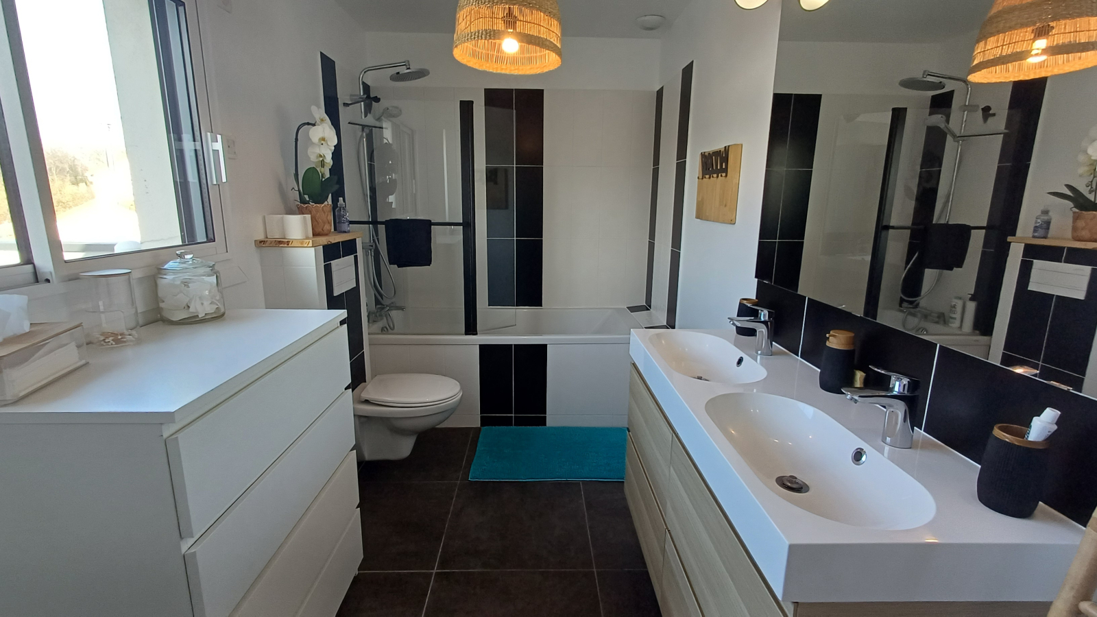 - 1 volledige badkamer boven met bad, dubbele wastafel en WC