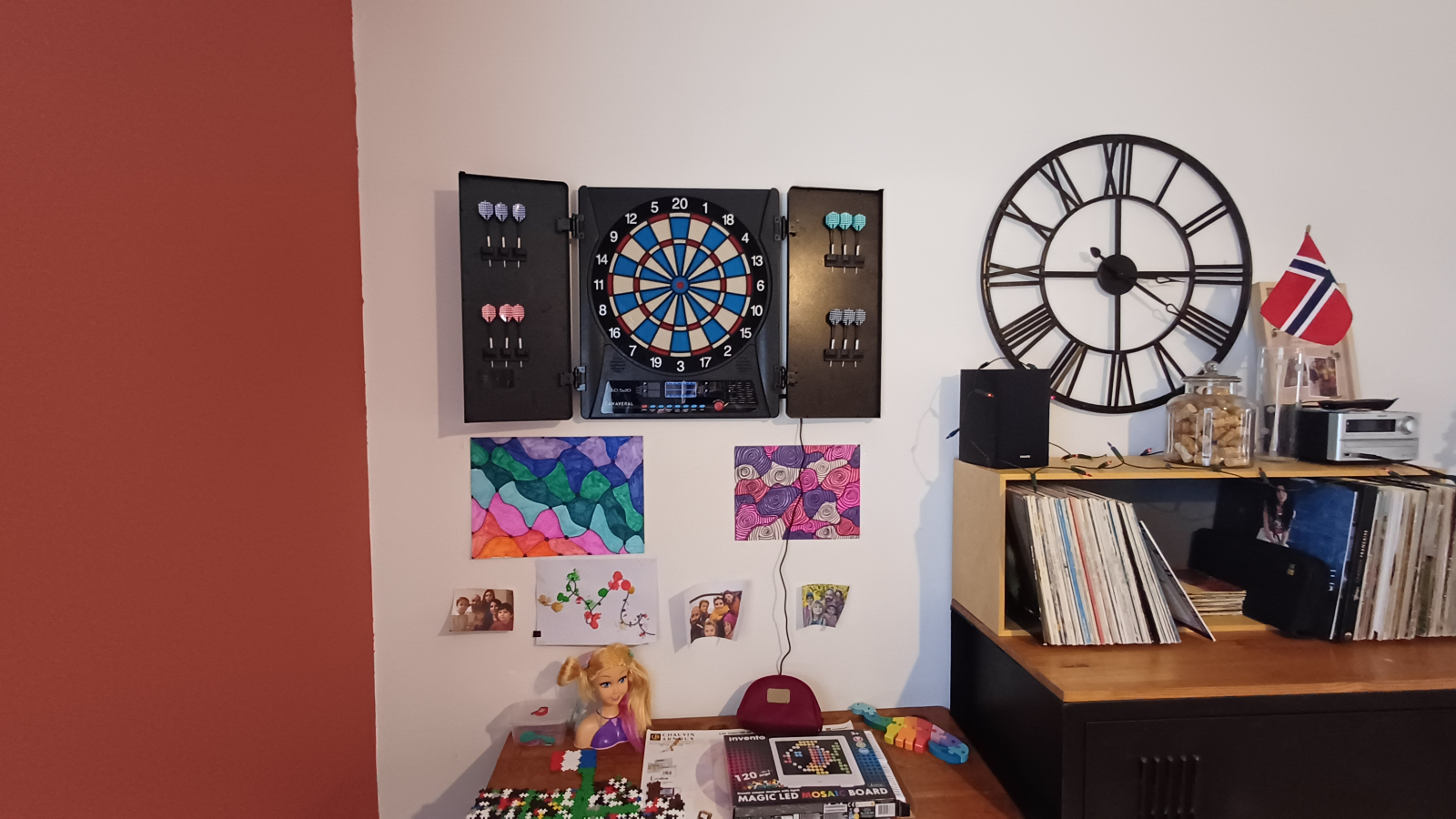 - Een grote woonkamer van 60 m², bestaande uit een woonkamer, een eetkamer en een speelkamer met een arcademachine en darts.
