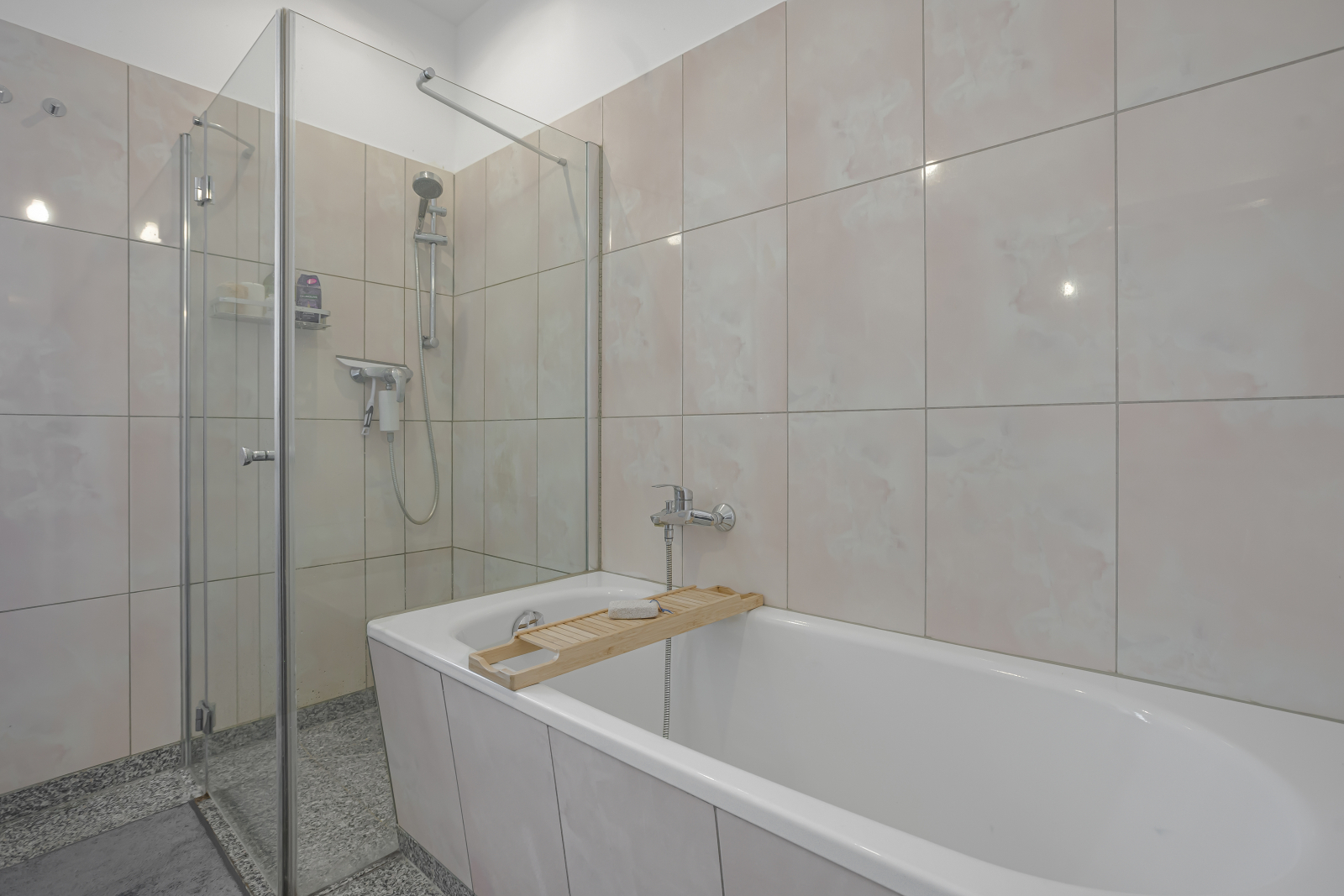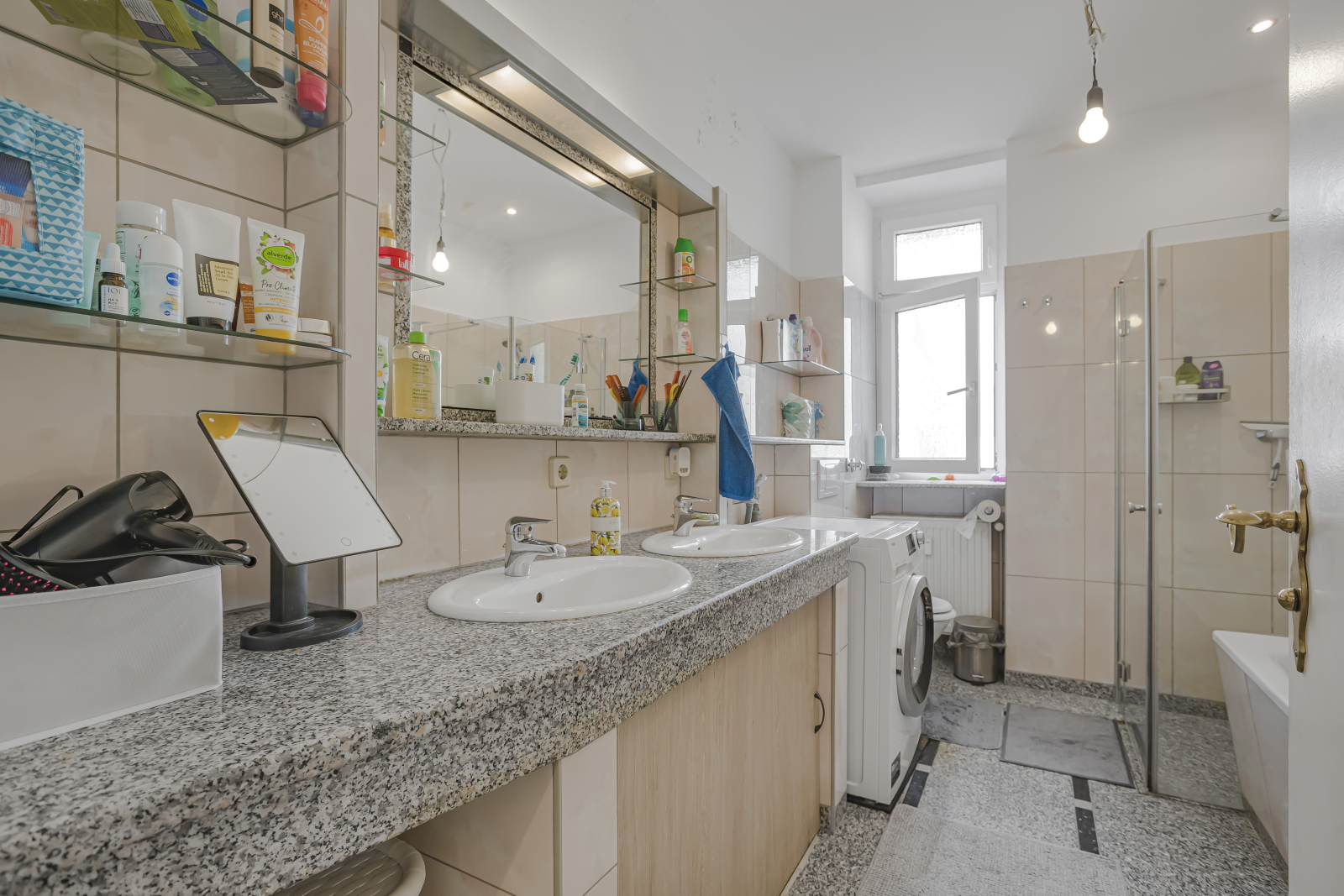 Badkamer is ook ruim en heeft een wasmachine, commode, ligbad en een douchecabine met 2 wastafels.