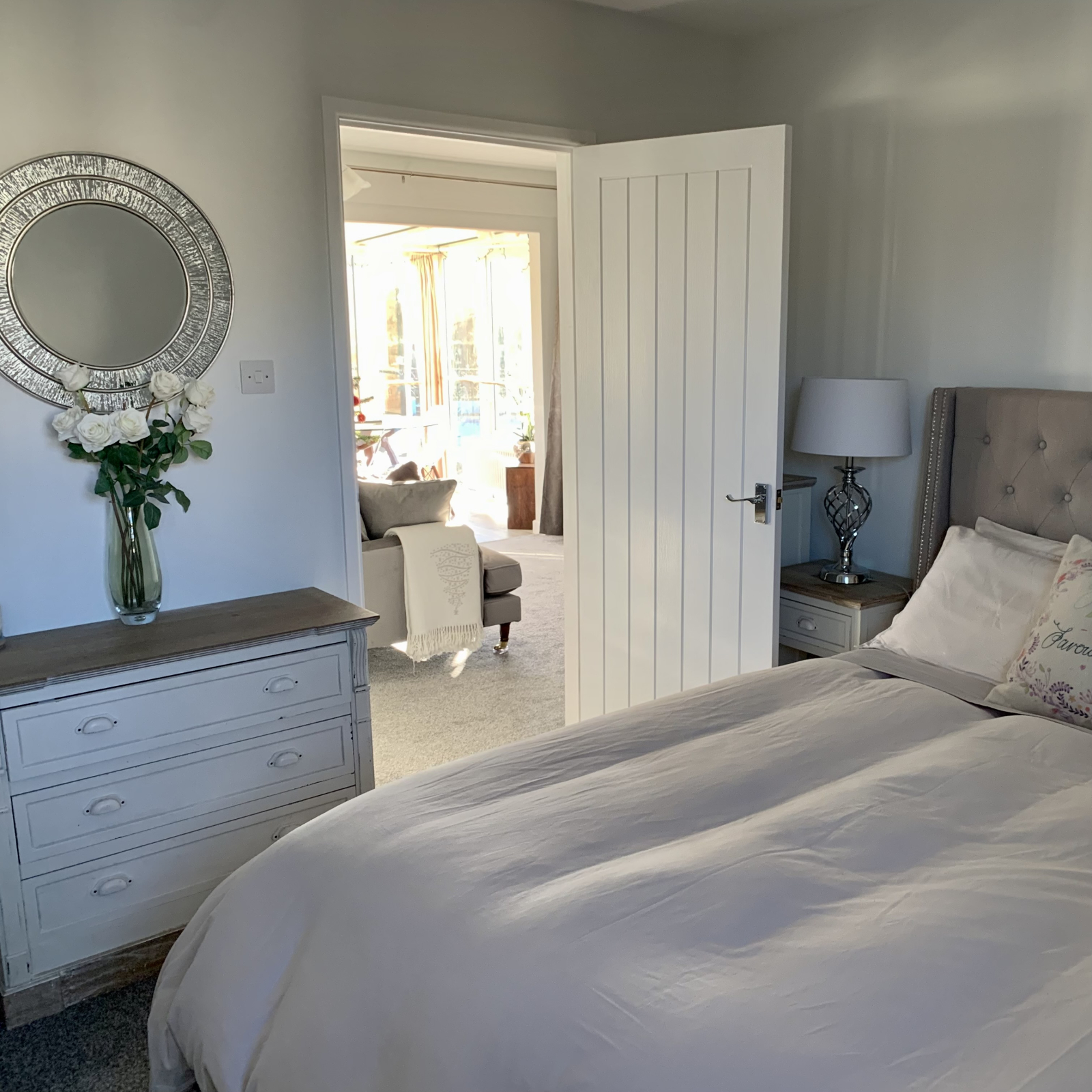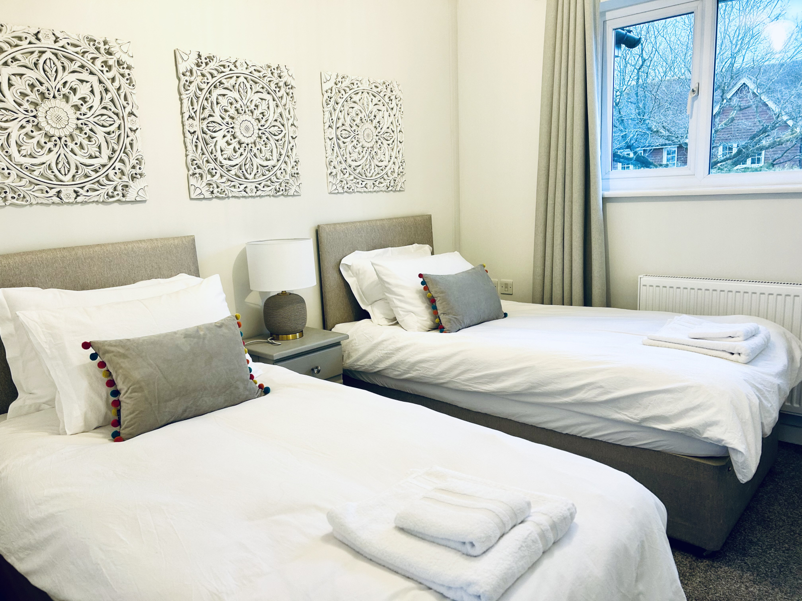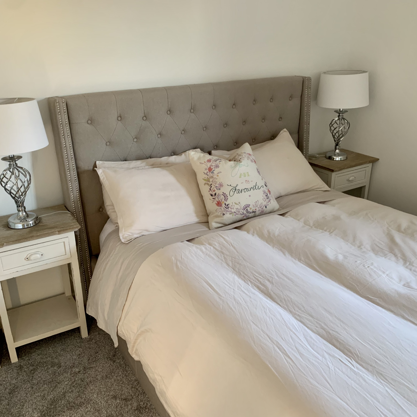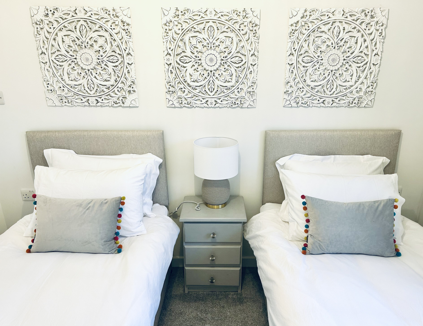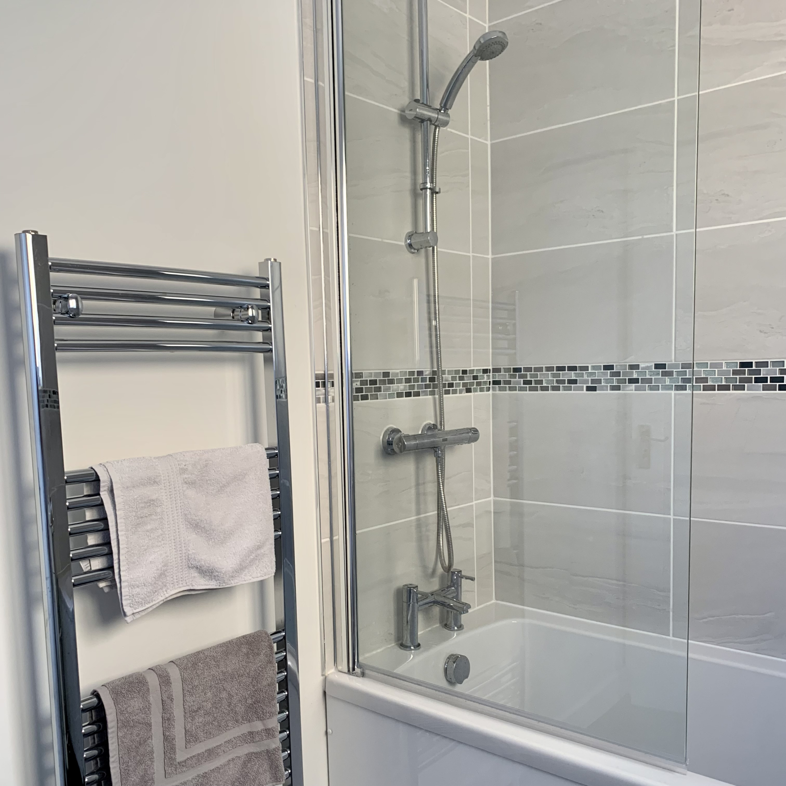 Er is een slaapkamer met een kingsize bed en twee eenpersoonsbedden die kunnen worden samengevoegd tot een super kingsize bed. De badkamer heeft een douche boven een bad.
