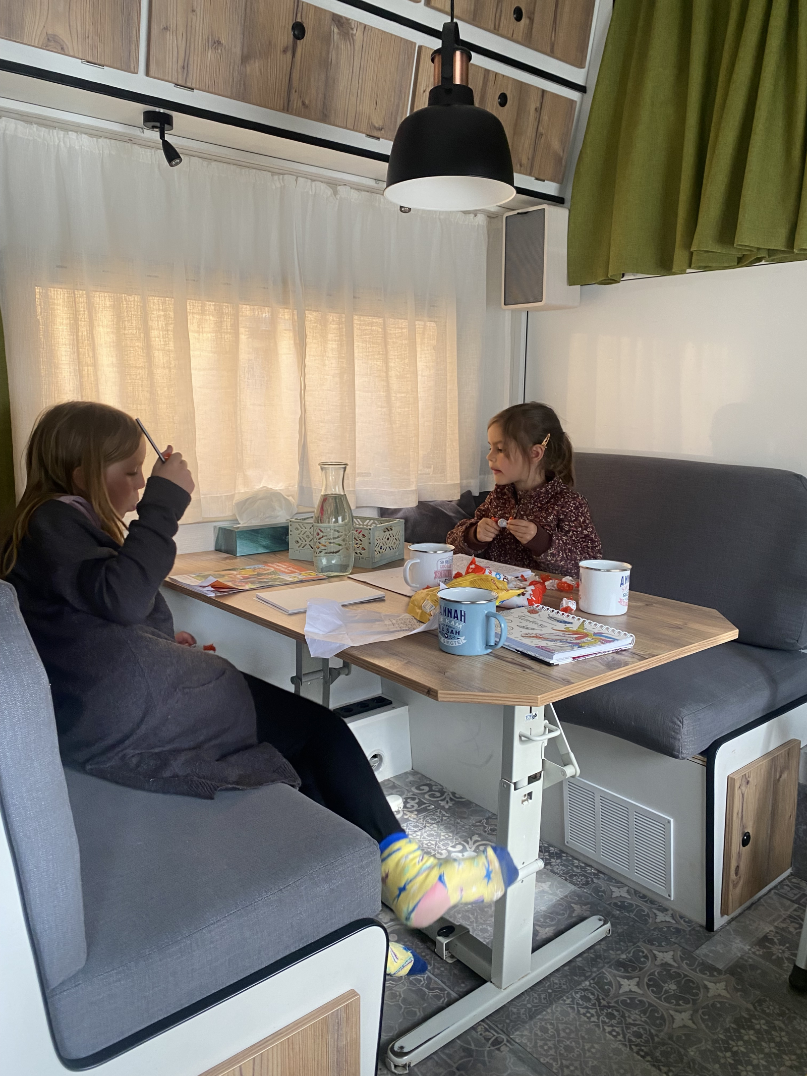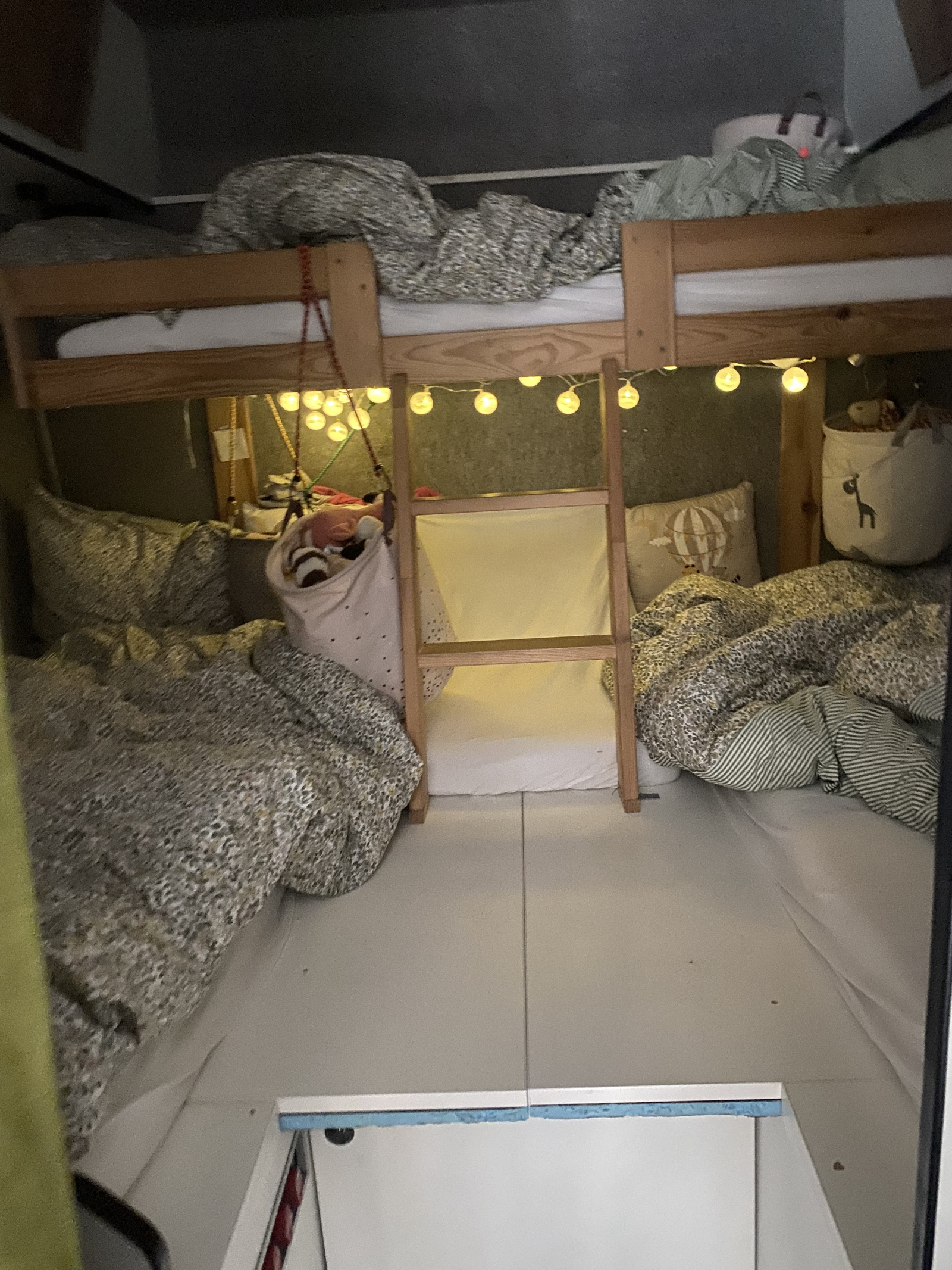 Volledig uitgerust met een keuken, badkamer, 3 kinderbedden en een tweepersoonsbed voor de ouders.