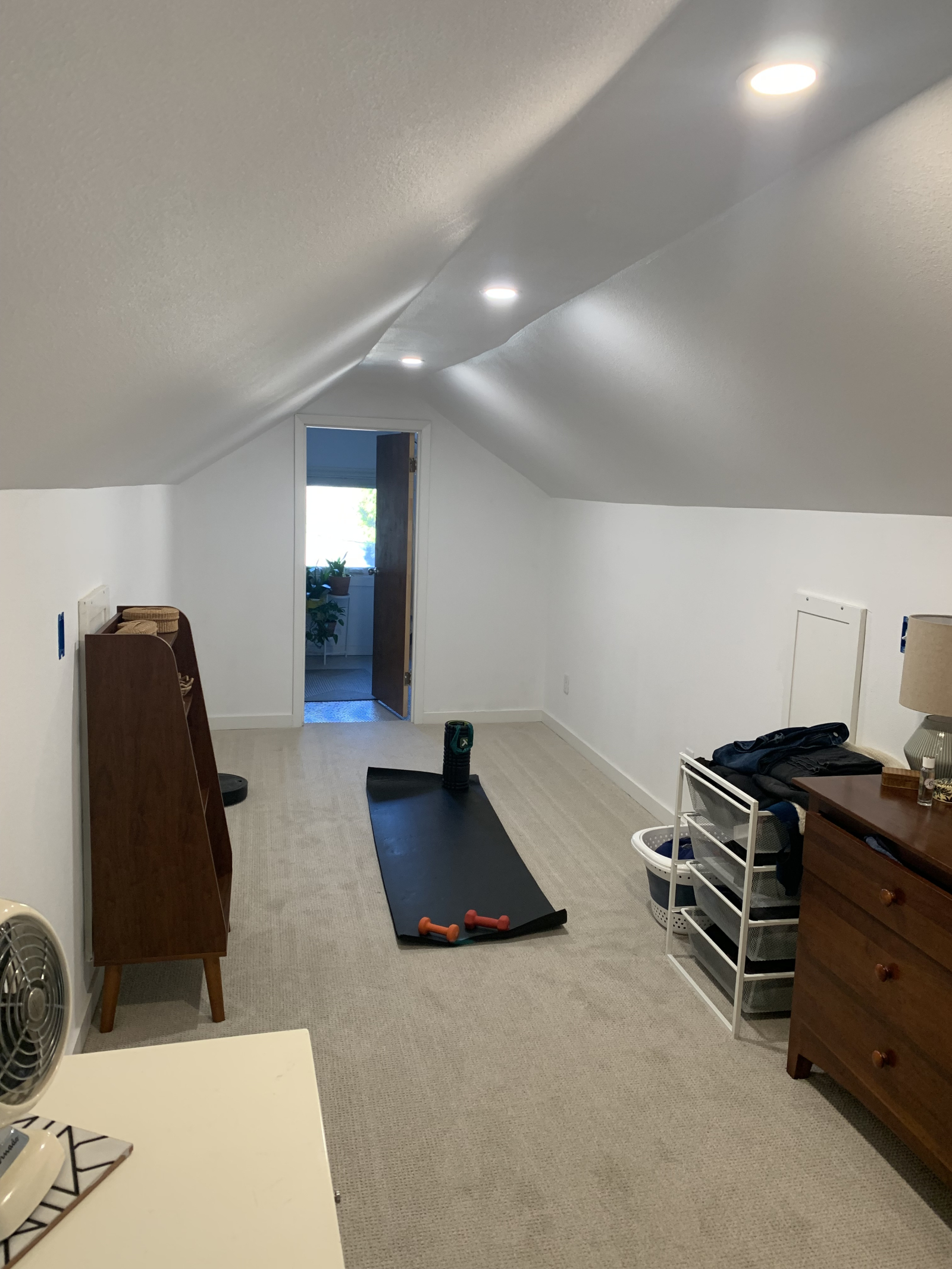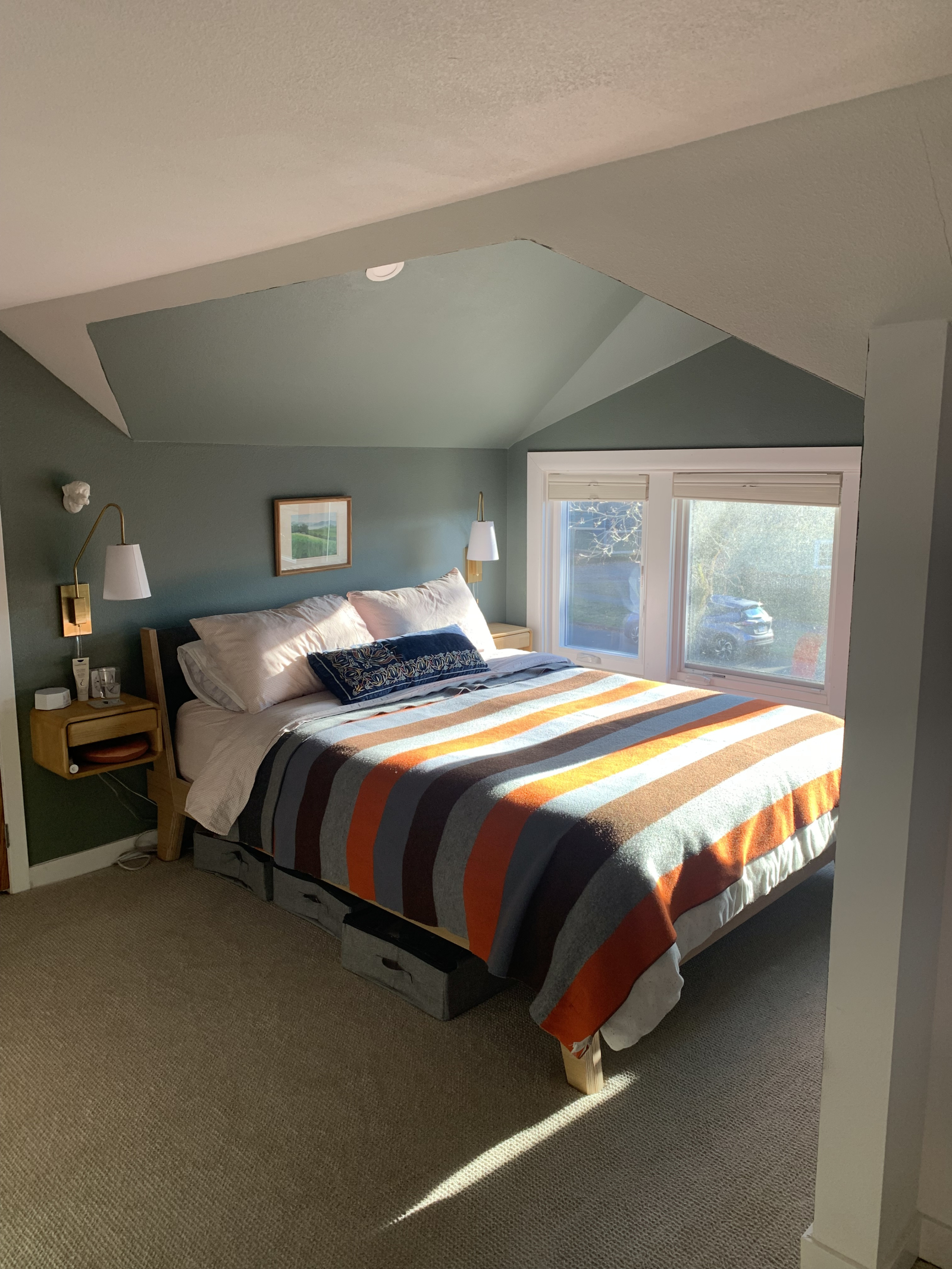 De hoofdslaapkamer is een verbouwde zolderruimte met een eigen badkamer, met een diep bad.