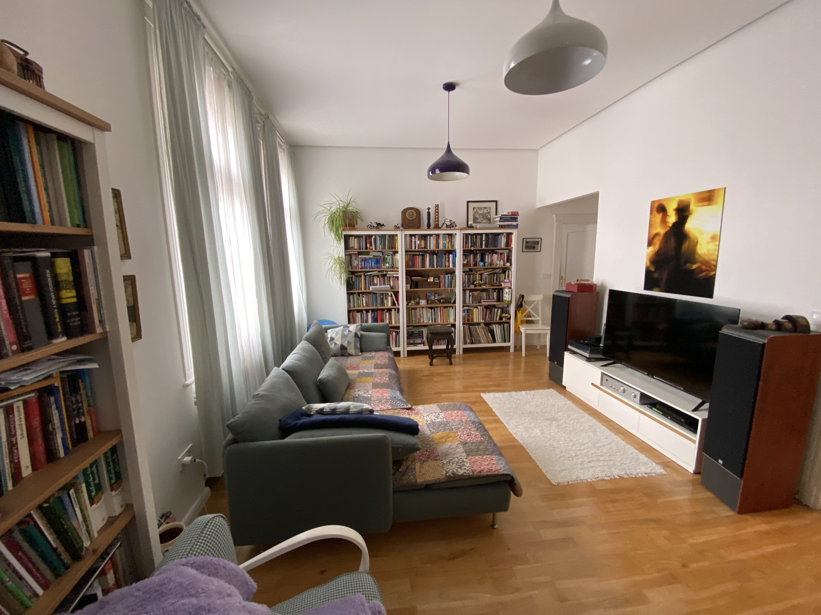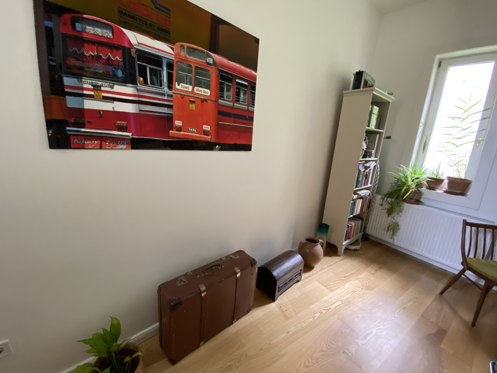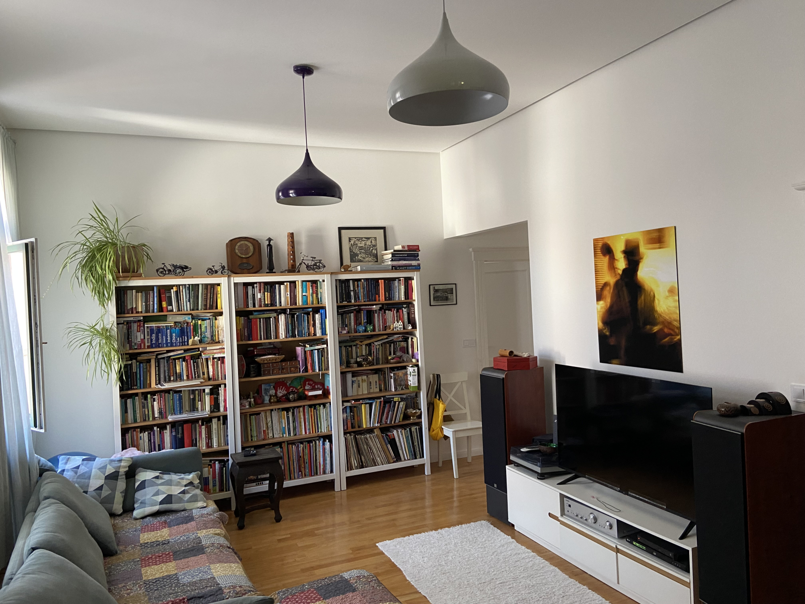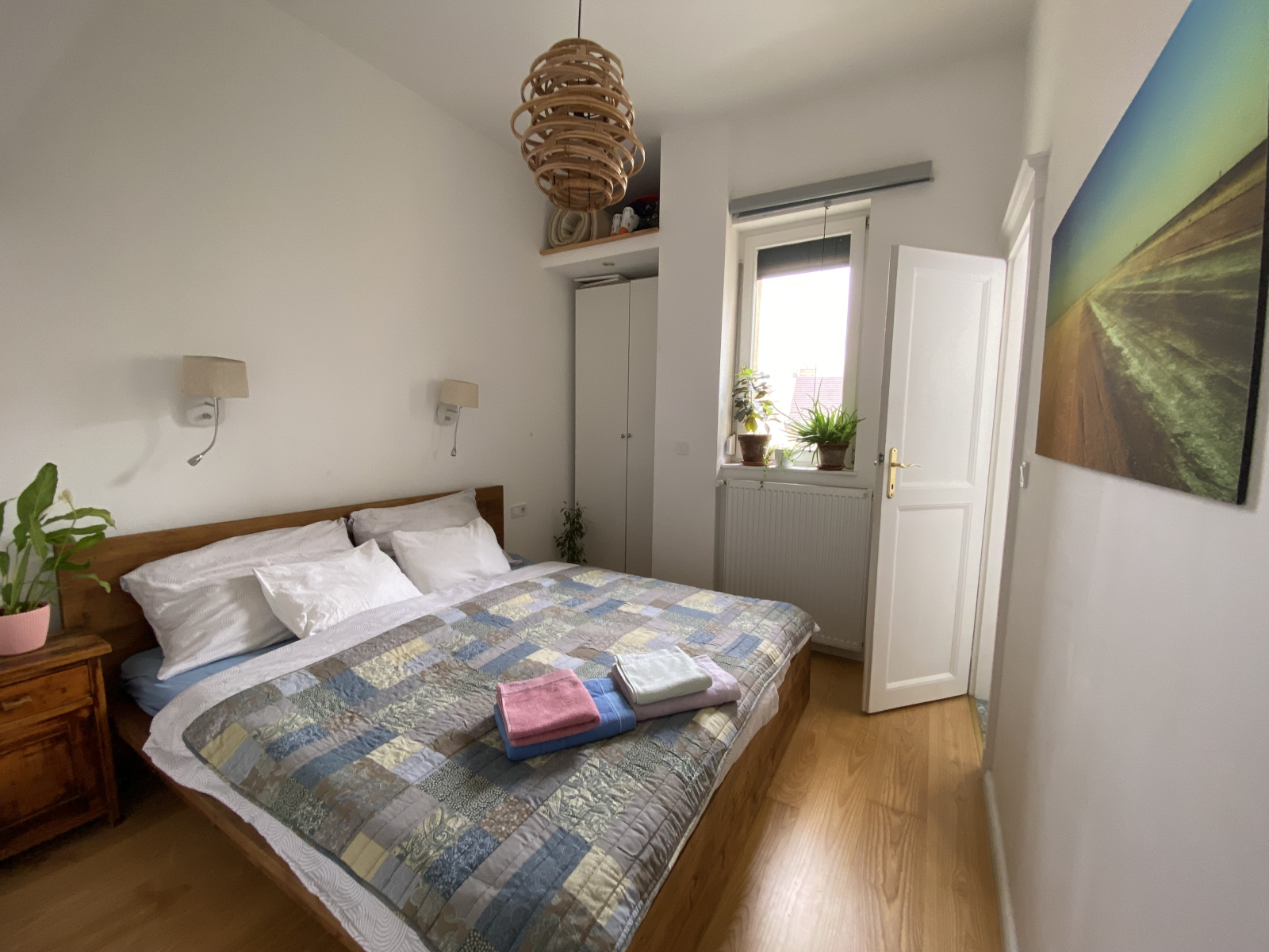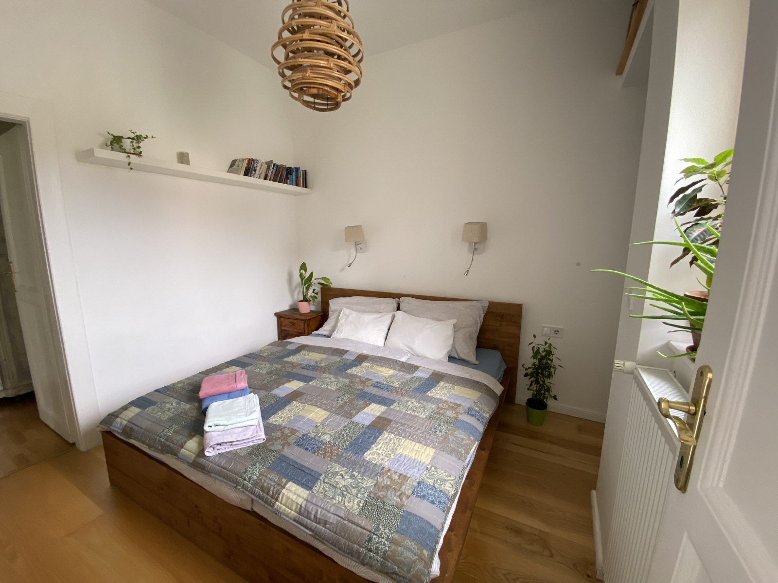 Het appartement is een burgerlijk appartement, maar modern ingericht, met foto's (genomen tijdens onze reizen) en schilderijen aan de muren, en grote boekenkasten. Het heeft 100 vierkante meter, een keuken, een woonkamer (met slaapbank), twee toiletten, een badkamer (douche en bad), een kinderkamer (met stapelbed, omlaag 200x160, omhoog 90x200), een slaapkamer (met tweepersoonsbed 200x200) en een logeerkamer (met 2 matrassen). Het is ideaal voor vier personen, maar kan er drie extra mensen op de bank en indien nodig twee matrassen worden gelaten. Er is een kinderkamer waar gasten met hun speelgoed kunnen spelen, en een speeltuin en sportspeeltuin in de buurt. Op de gang - de loopbrug is het het laatste appartement, dus niemand loopt voor het appartement, we hebben daar een klein tafeltje met twee stoelen gezet waar je kunt zitten. Vanaf daar zie je een vuurmuur met klimop en wilde druiven en een tuin.