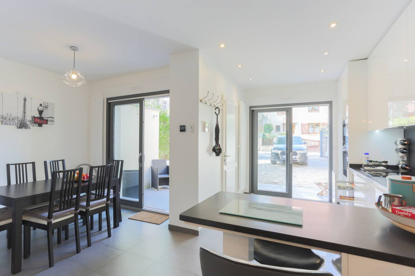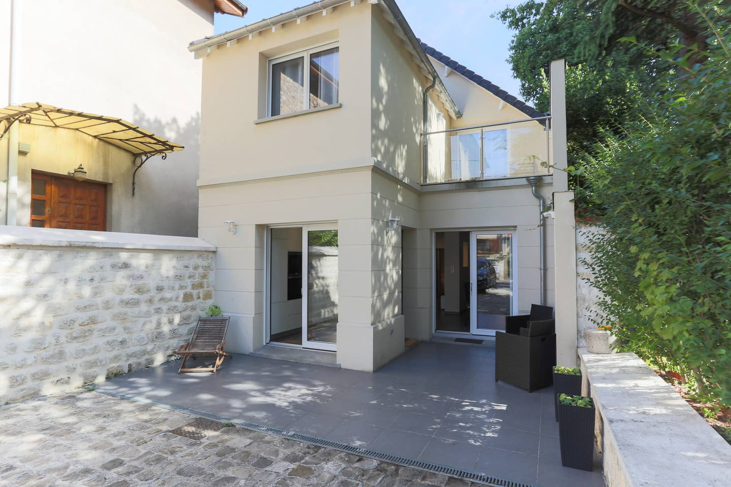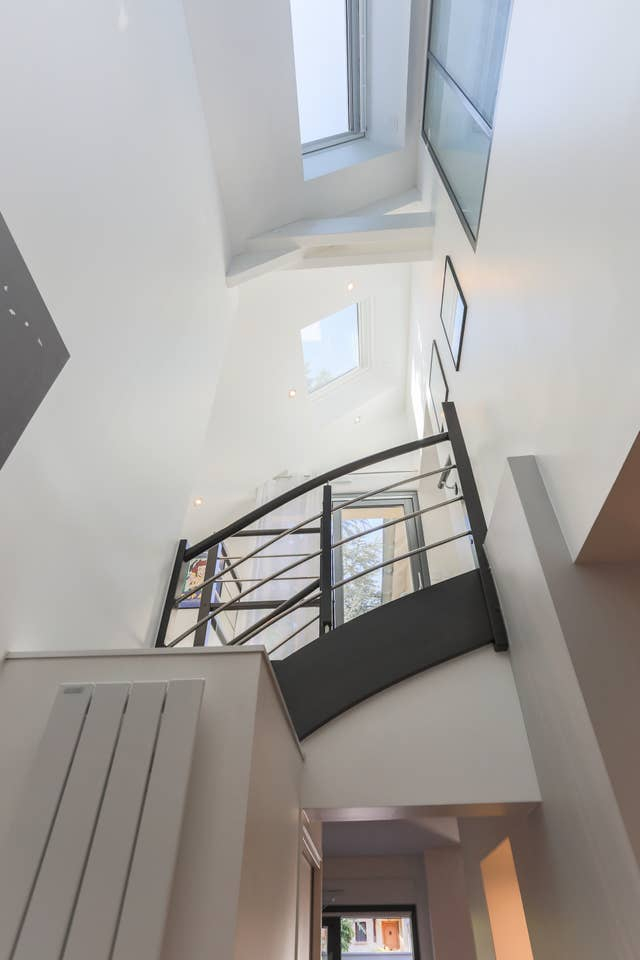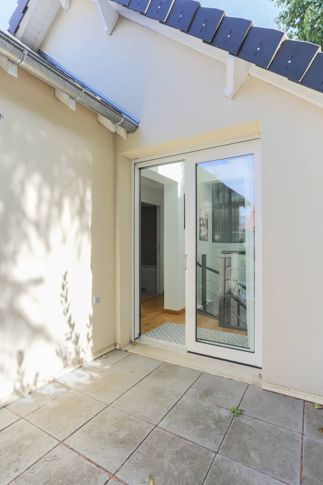 Recent huis, loftstijl, terras, binnenplaats en parkeerplaats