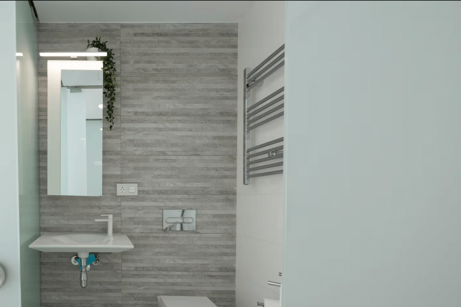 We zitten op de zesde verdieping. Er is een lift vanuit de hal en drie treden om vanaf het straatniveau binnen te komen.