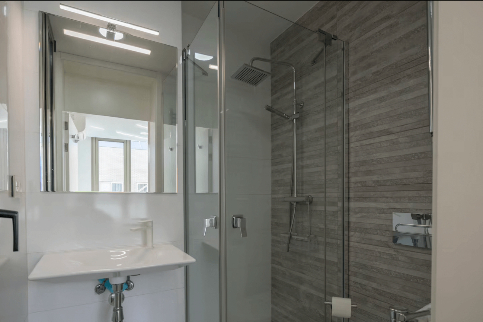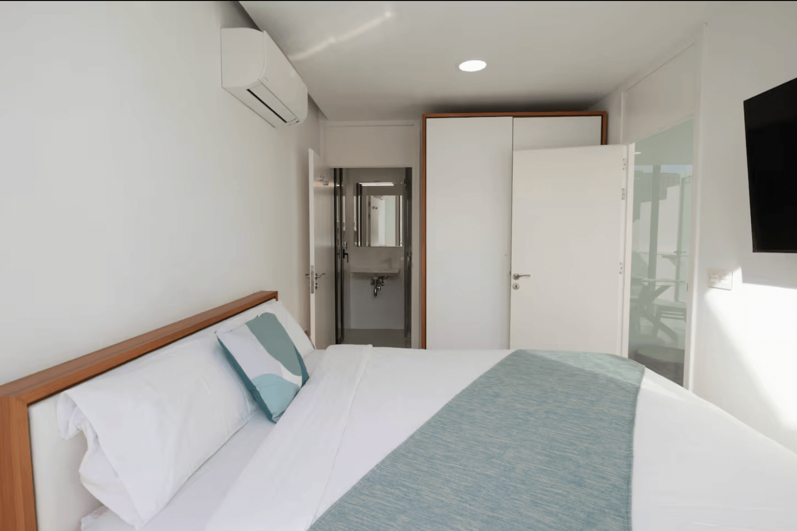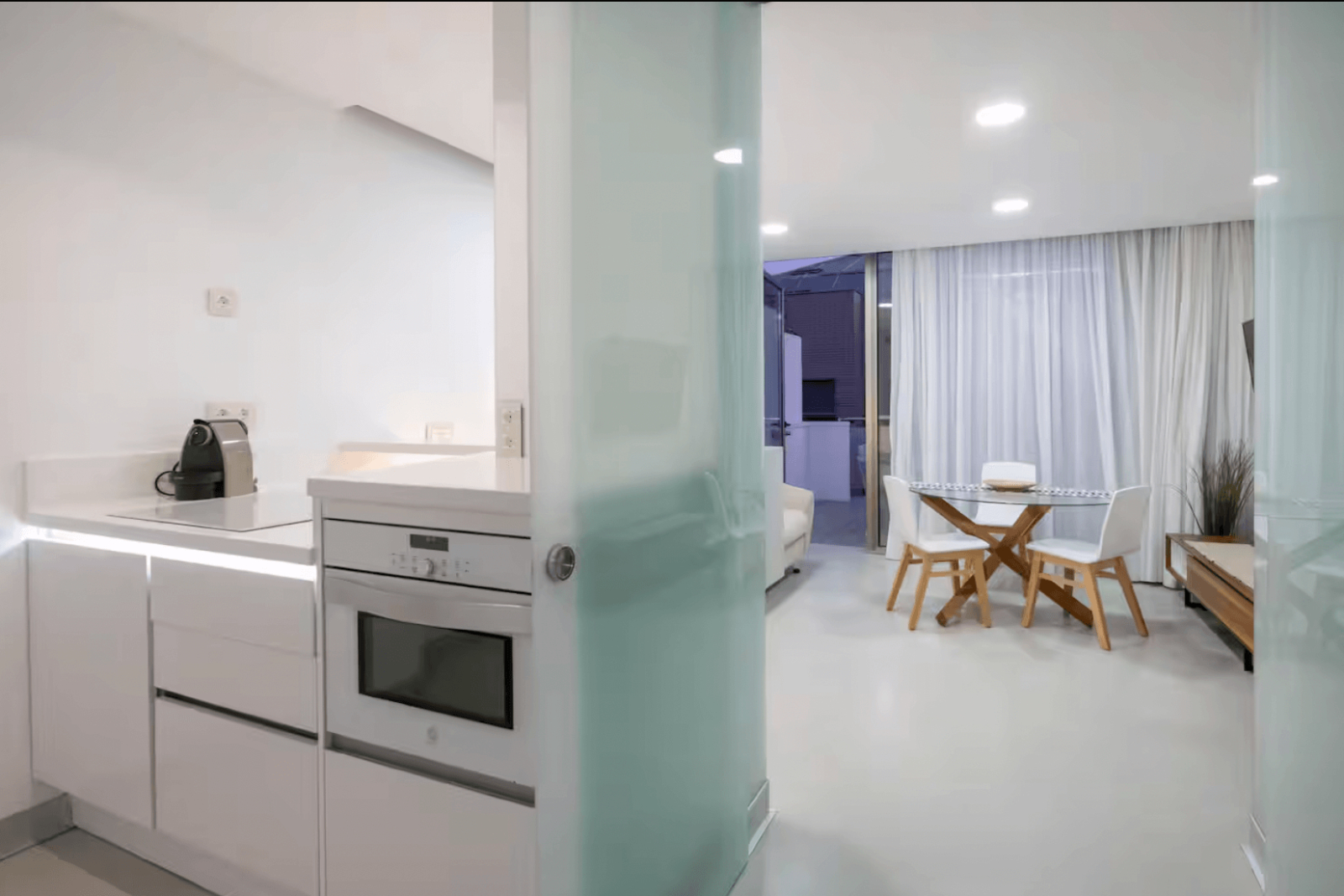 We hebben een woonkamer met een kitchenette die uitkomt op een groot balkon. Er is een slaapkamer met een ensuite badkamer die ook uitkomt op het balkon, en in de woonkamer staat een slaapbank en een tweede badkamer.