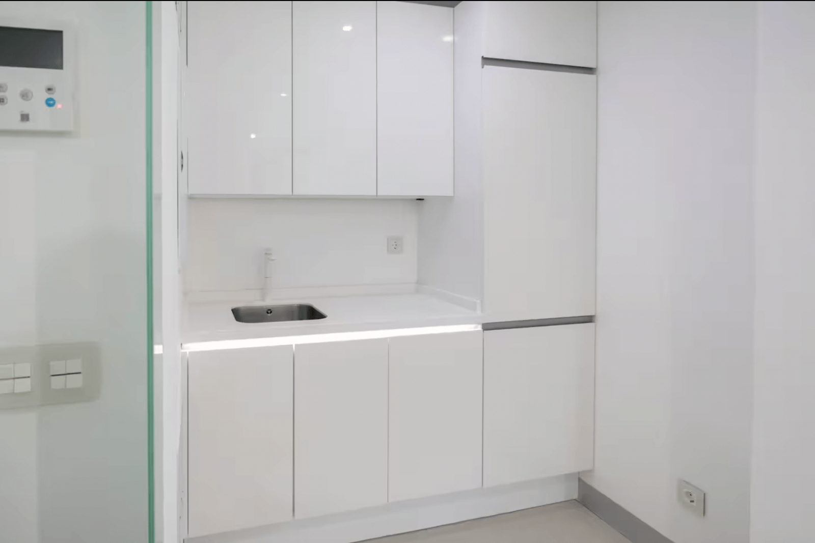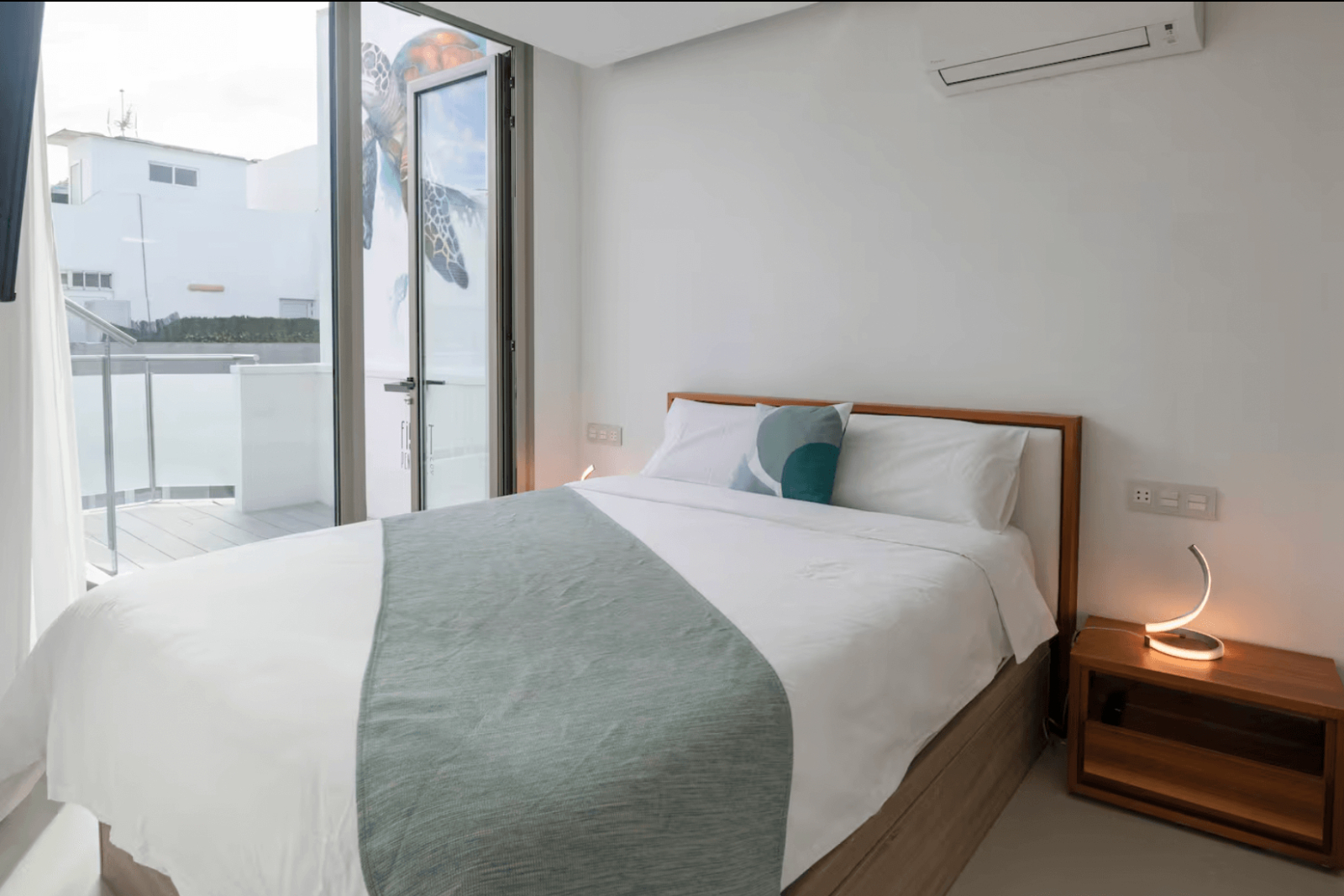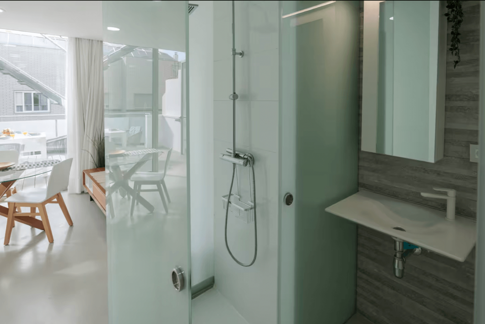 We hebben een woonkamer met een kitchenette die uitkomt op een groot balkon. Er is een slaapkamer met een ensuite badkamer die ook uitkomt op het balkon, en in de woonkamer staat een slaapbank en een tweede badkamer.