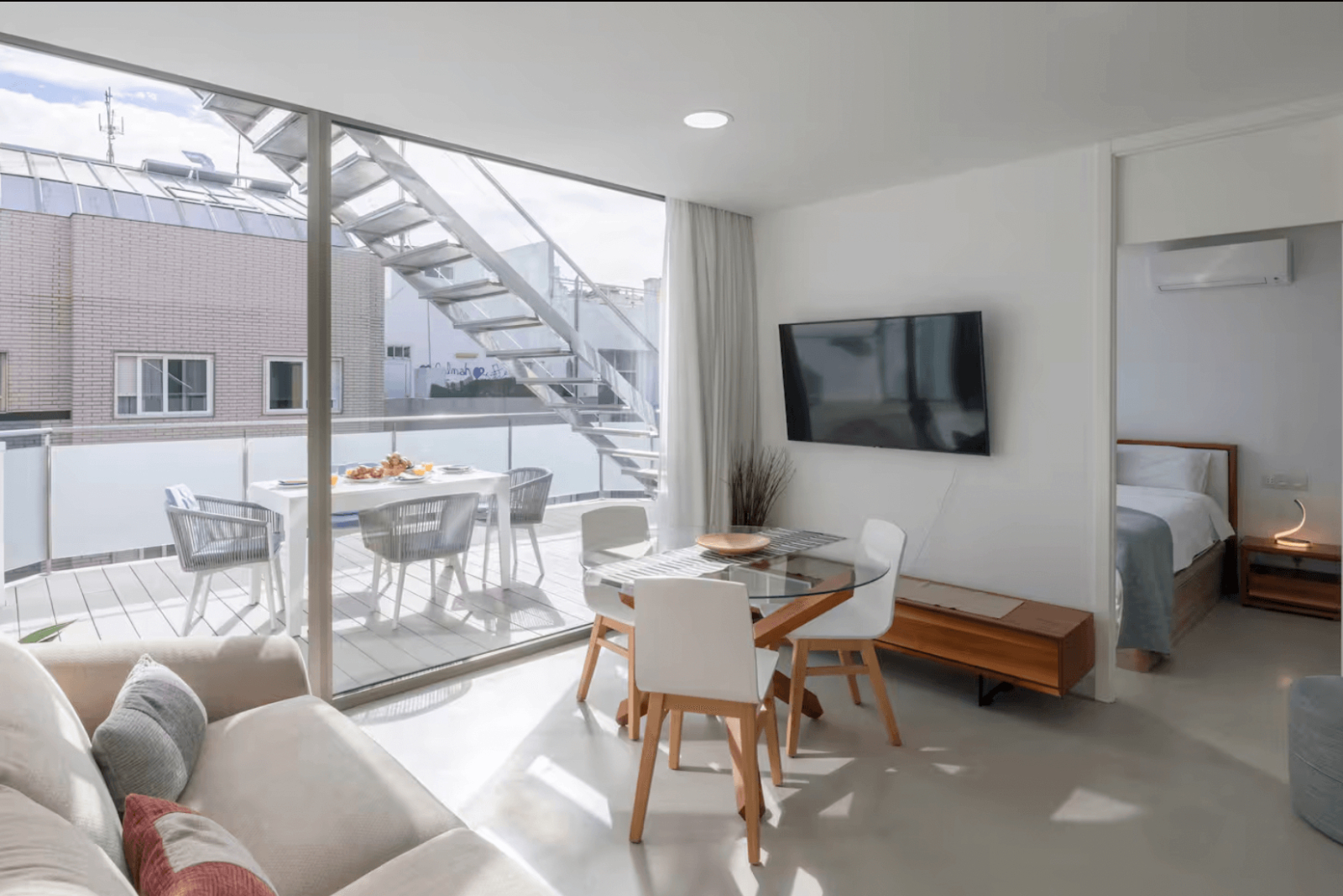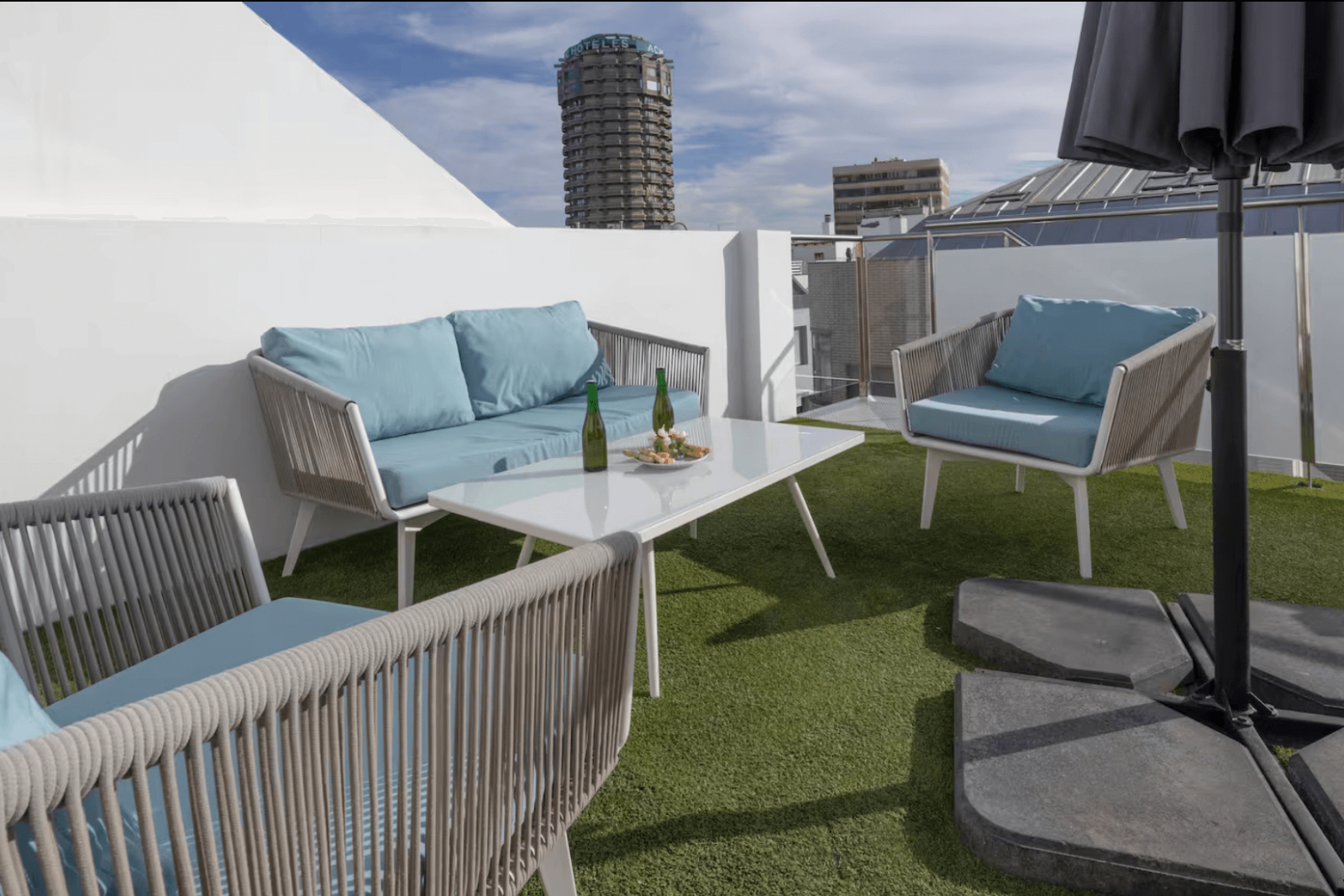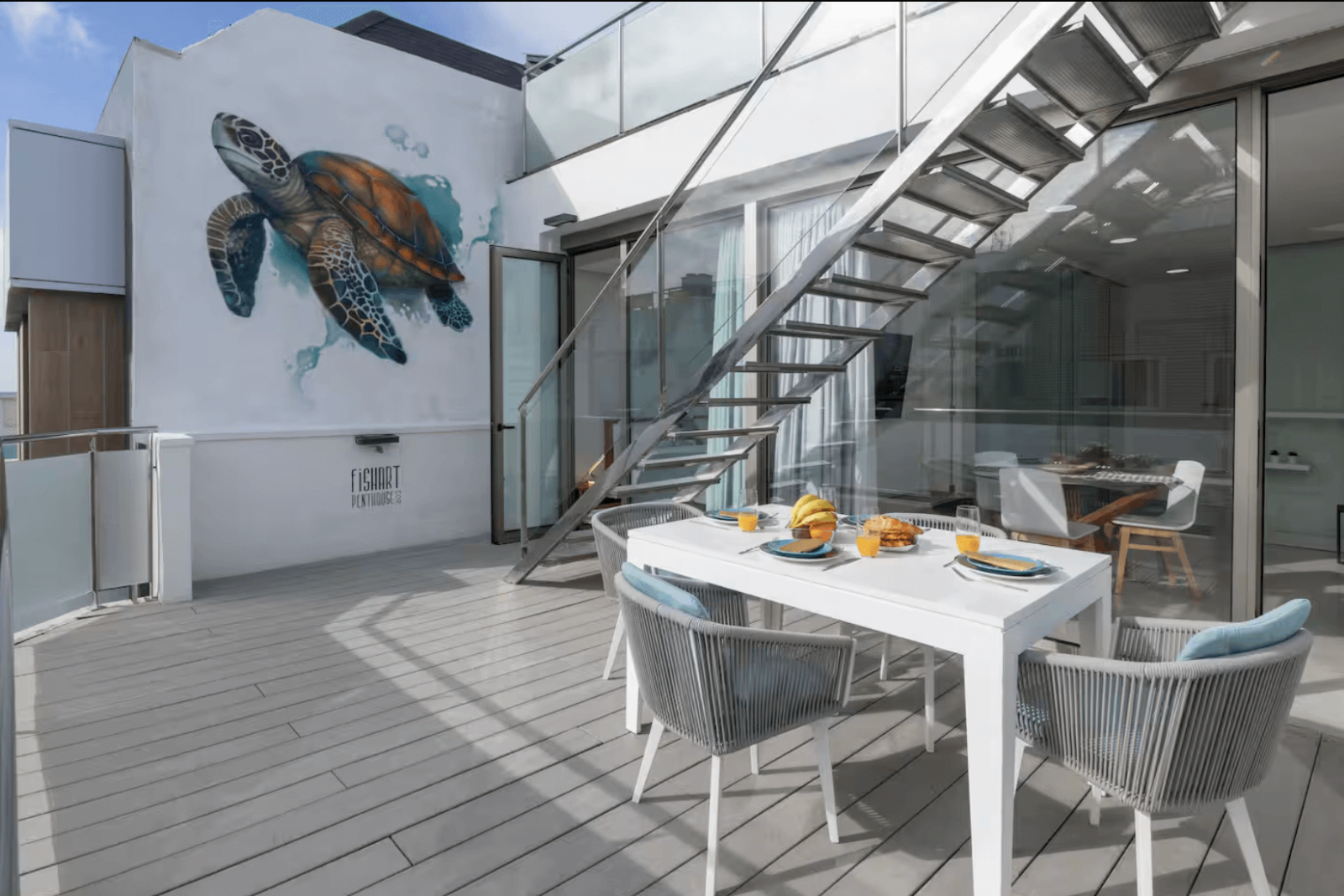 Ons huis is een penthouse met één slaapkamer op de 6e verdieping naast het strand. Het heeft veel buitenruimte en ligt op het zuiden.