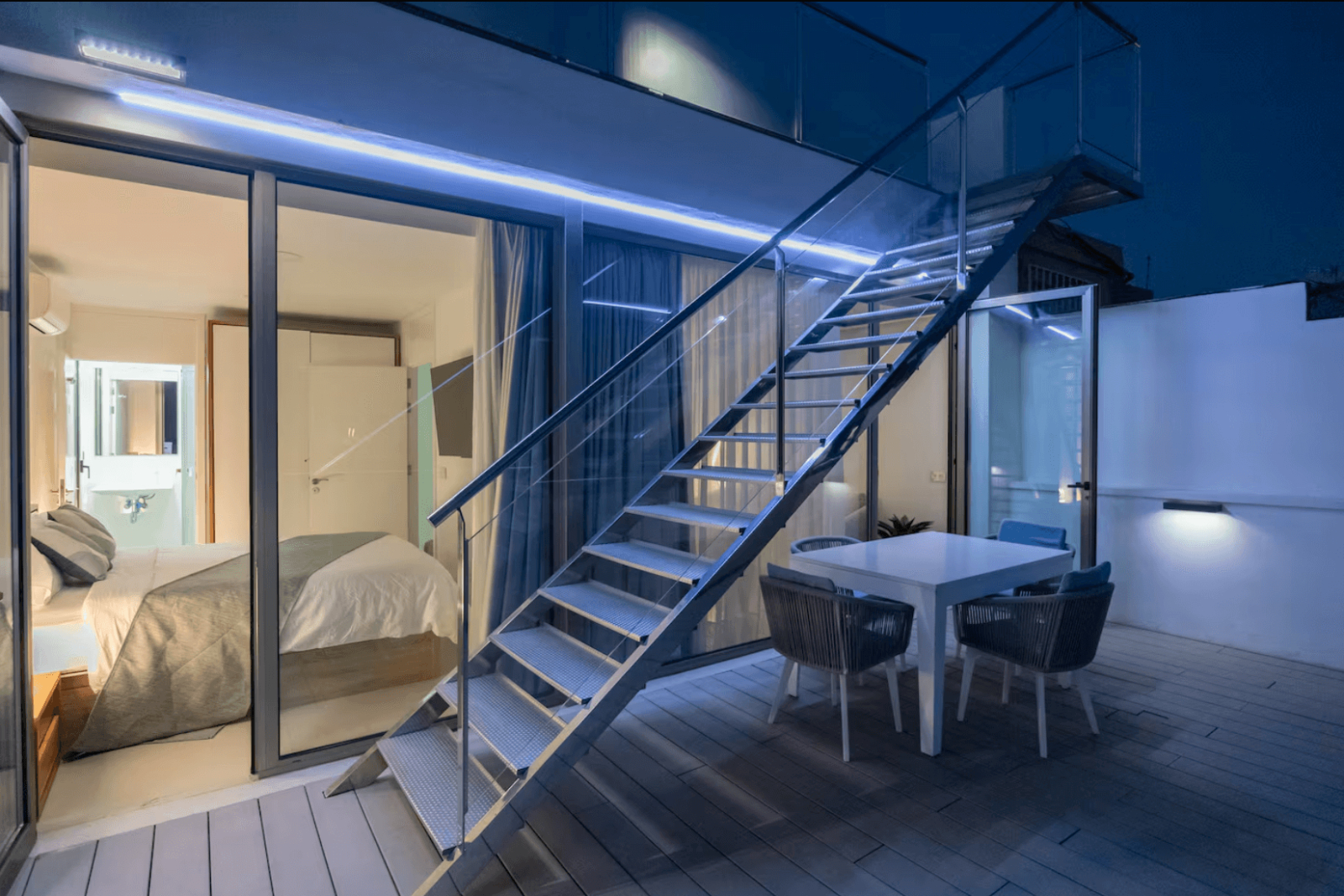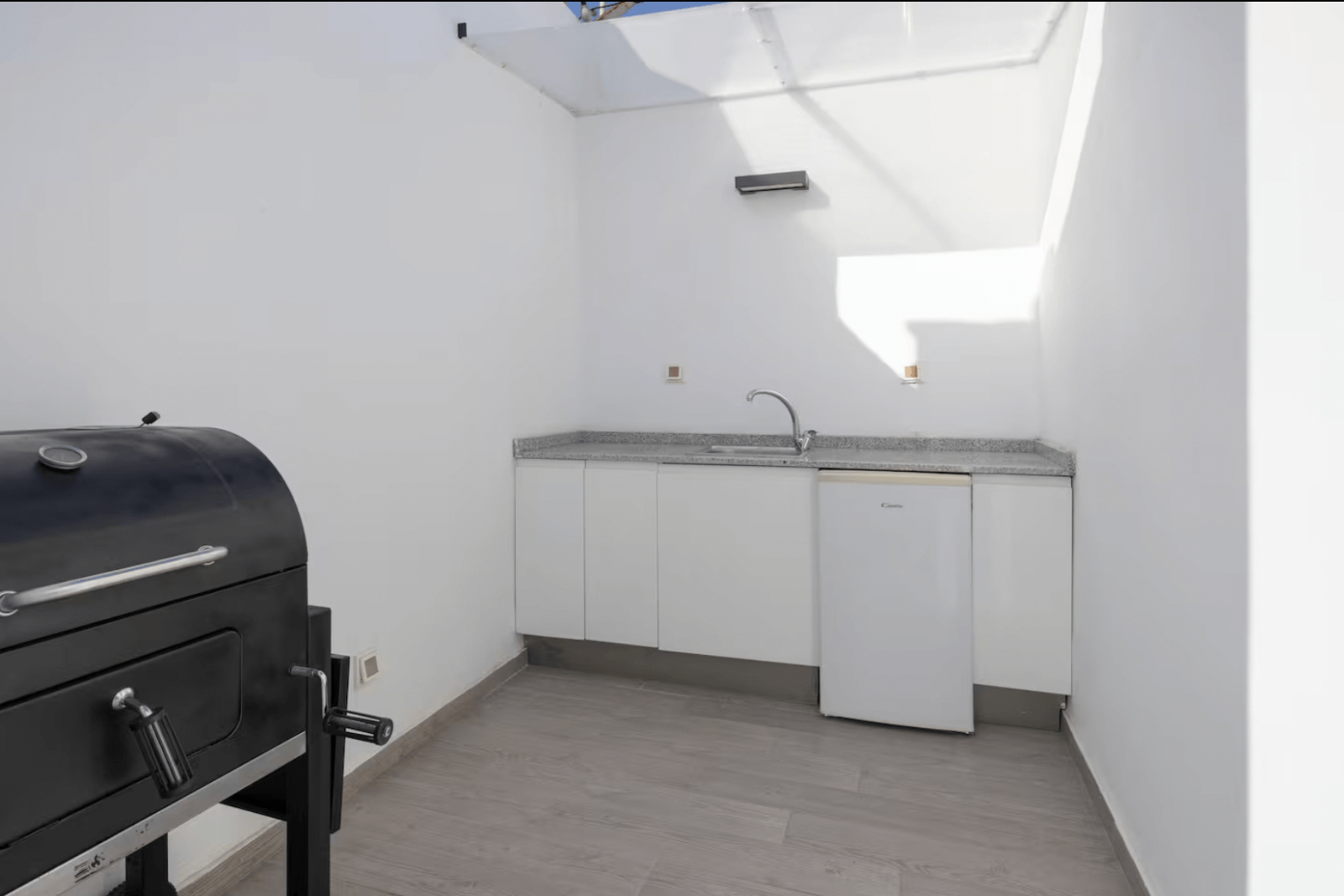 Boven is er een dakterras met een kleine buitenkeuken met een barbecue, een sauna en wat ruimte om te zitten of te zonnebaden. Er is ook een buitendouche op de bovenverdieping.