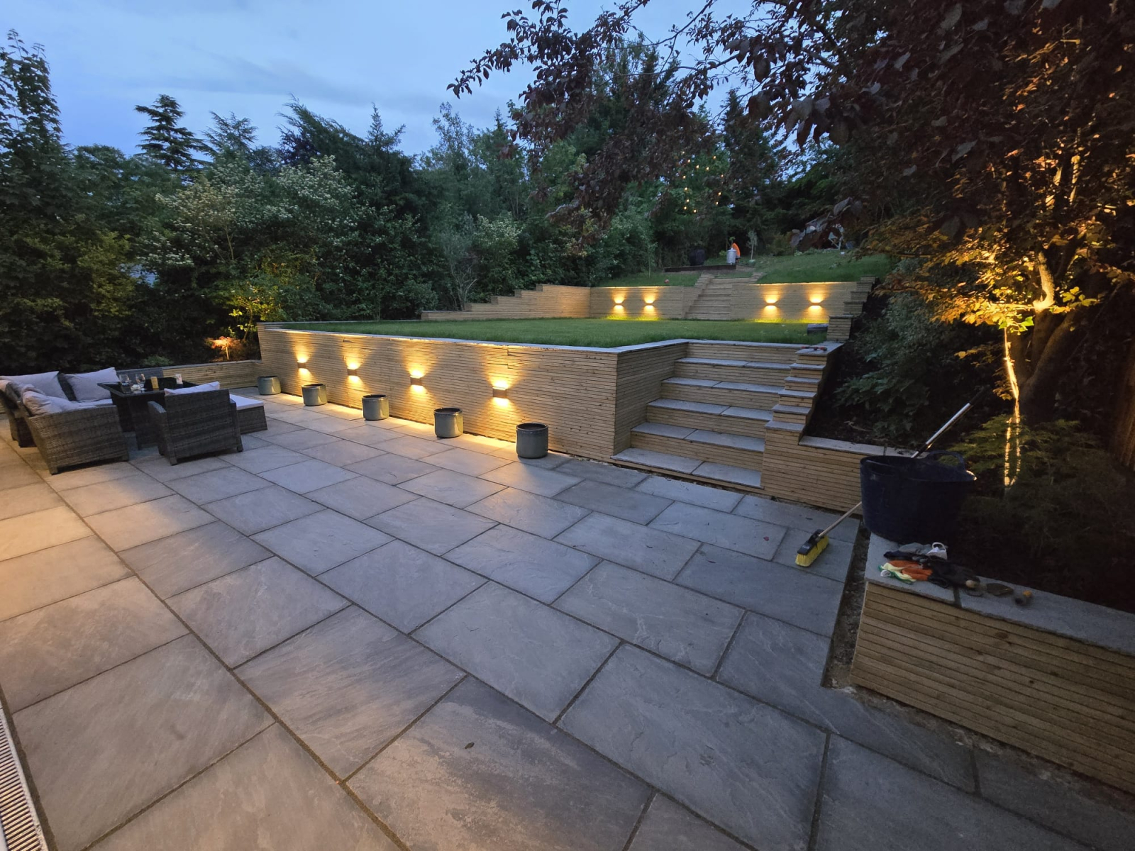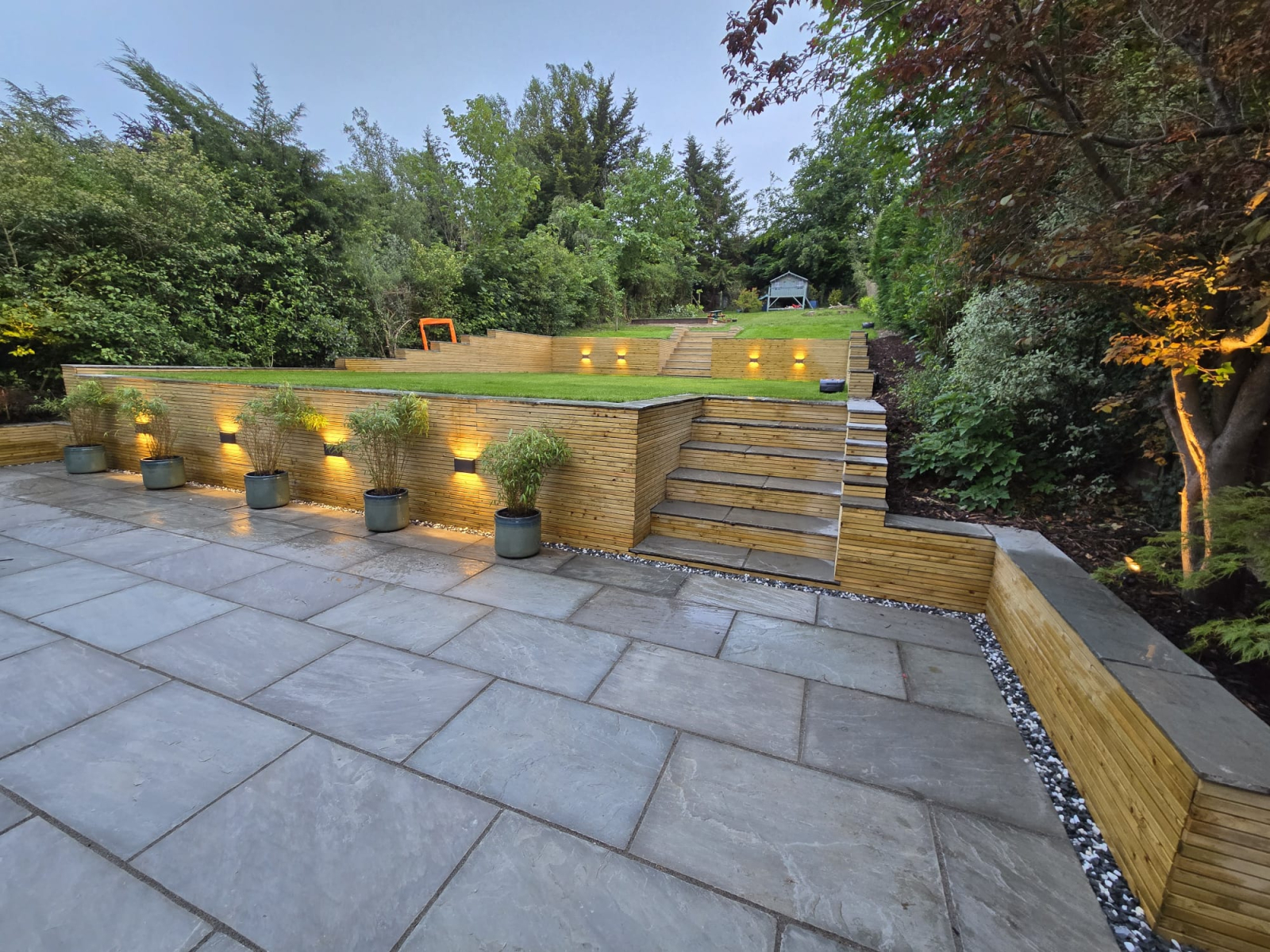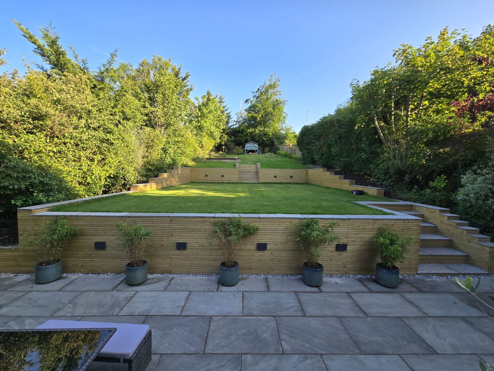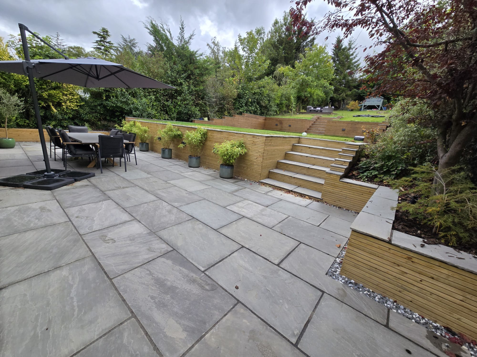 Huis met 2 verdiepingen met een trap naar de voordeur. De tuin heeft ook trappen erin.