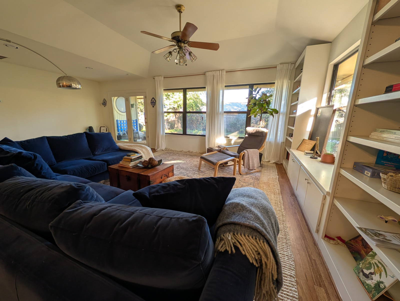 De gemeenschappelijke ruimte heeft een rustige woonkamer met uitzicht op de met bomen begroeide achtertuin en eetruimte.