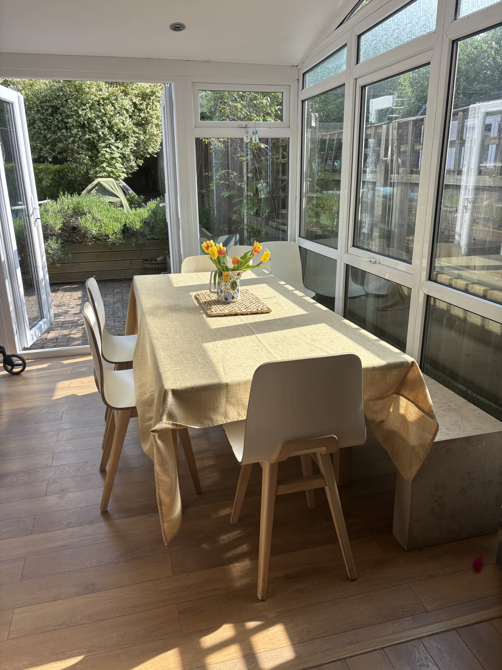 Nossa casa dos anos 1950 fica em um bairro tranquilo e amigável. Temos uma varanda e corredor que leva a um plano aberto, cozinha / sala de jantar que também tem uma área de sofá com TV, por isso é uma área comum real. As portas francesas do jardim de inverno com telhado de ardósia levam ao jardim, onde temos 3 áreas de estar; 1 mesa e cadeiras sombreadas, uma ao sol e uma grande área de estar para acomodar 8 +. Temos metas, estrutura de escalada, barras de ginástica, casinha, casa de insetos e muitos jogos ao ar livre!