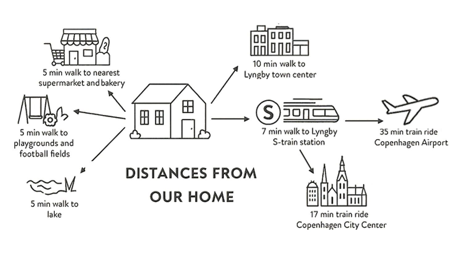 A casa está situada na cidade universitária de Kongens Lyngby, que fica no distrito norte da Grande Copenhague, aprox. 10 km do centro da cidade de Copenhaga. Os trens circulam aprox. a cada 5 minutos durante o dia e leva de 15 a 20 minutos para chegar ao centro de trem.