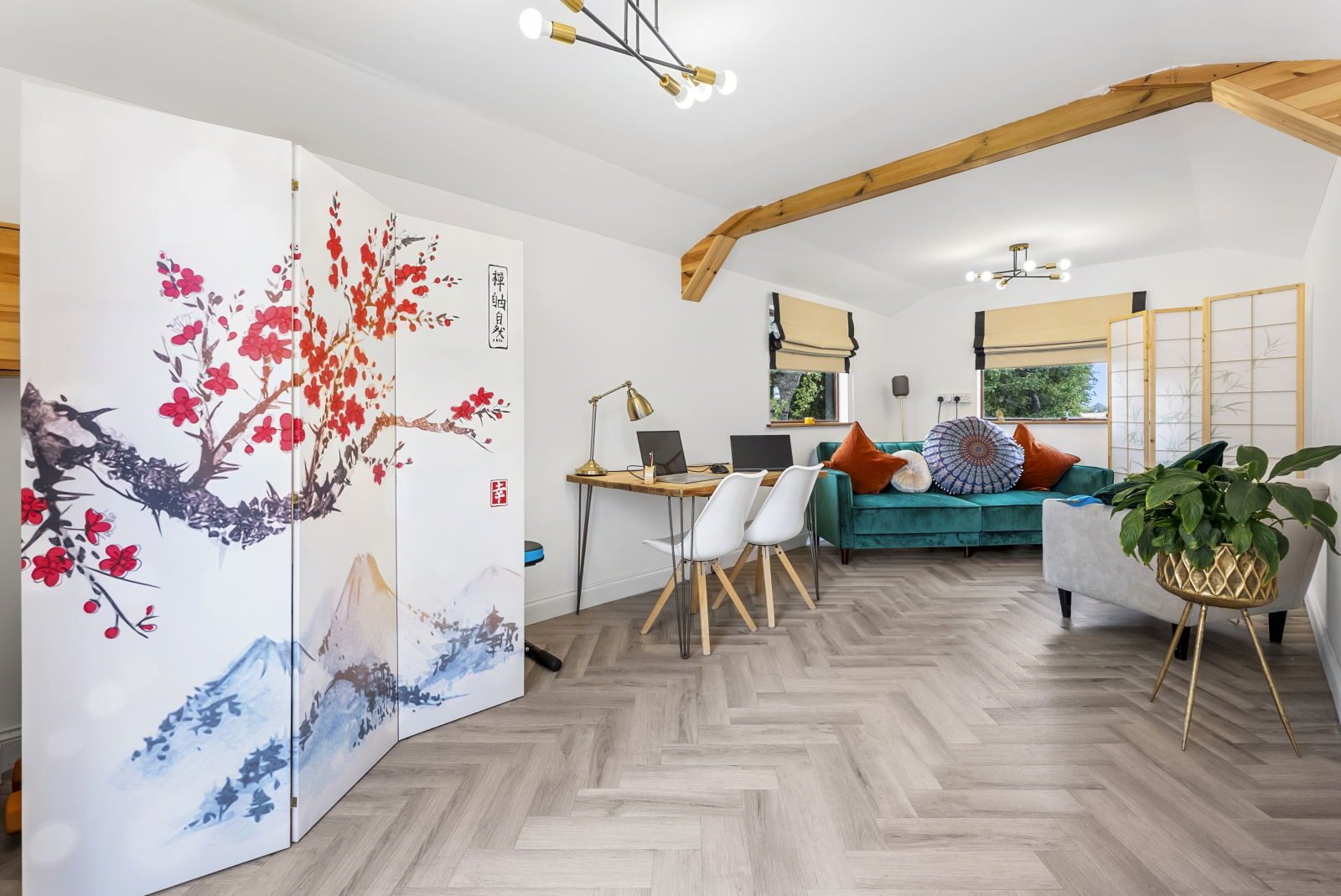 O quarto apresenta tectos inclinados e vigas de madeira expostas, acrescentando um toque rústico e arejado. Dois controles deslizantes dobráveis decorativos, um com uma pintura em estilo japonês de uma cerejeira florida e um delicado padrão de bambu no outro, oferecem opções de separação de áreas e dão um toque artístico ao ambiente.