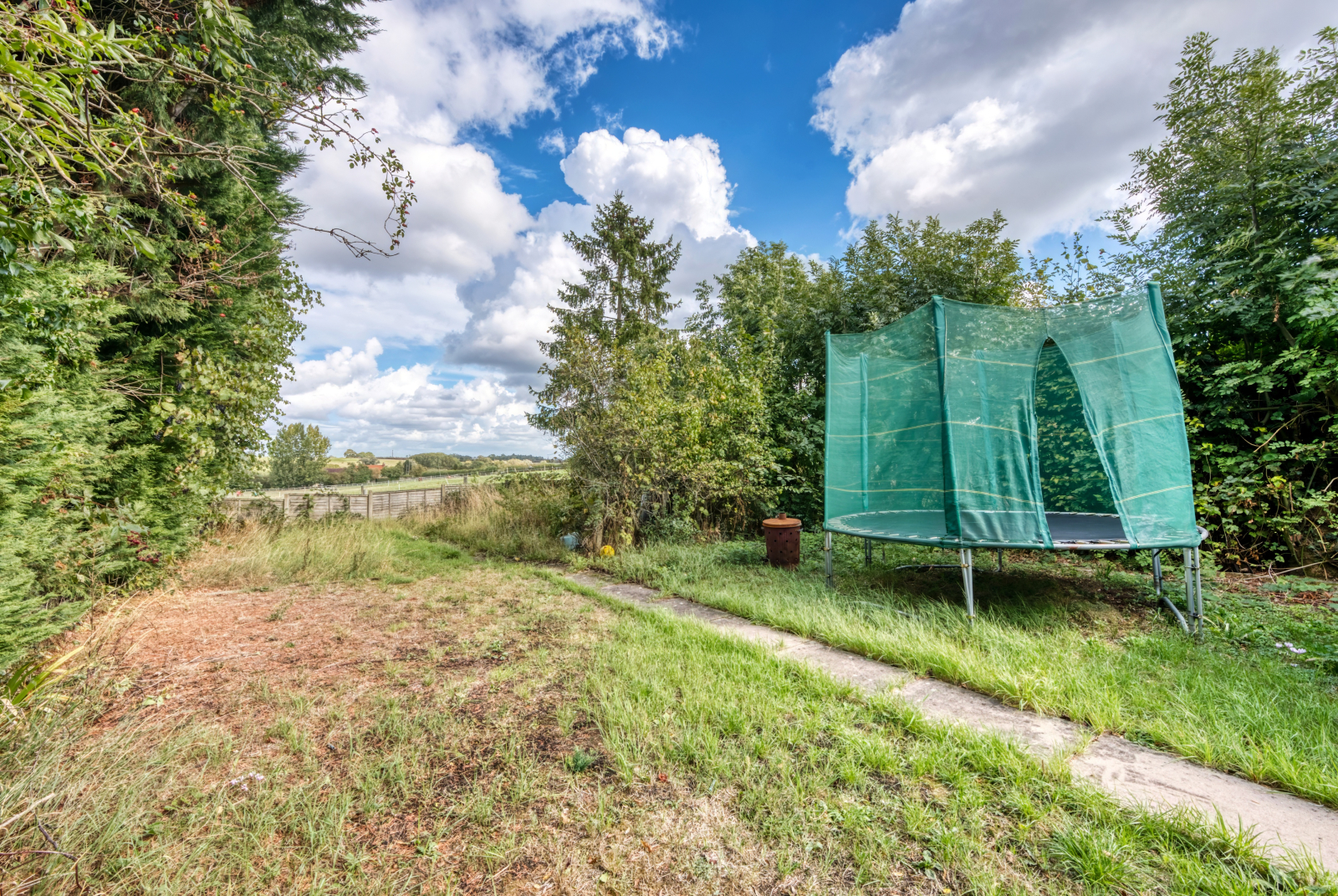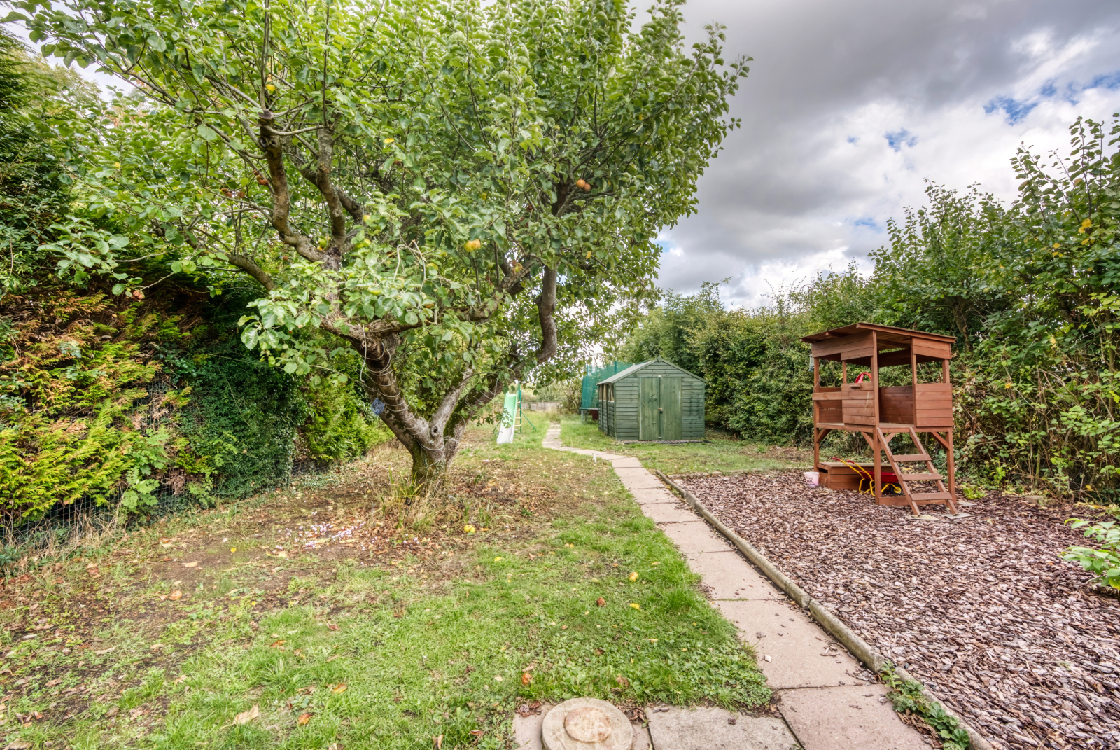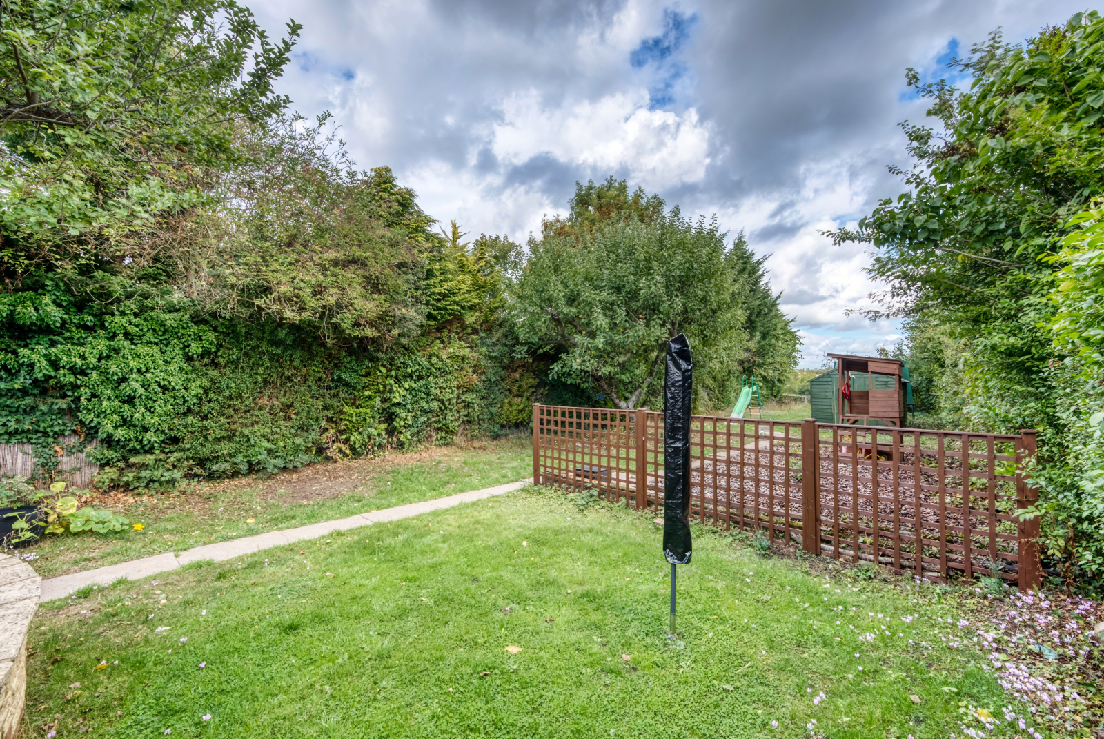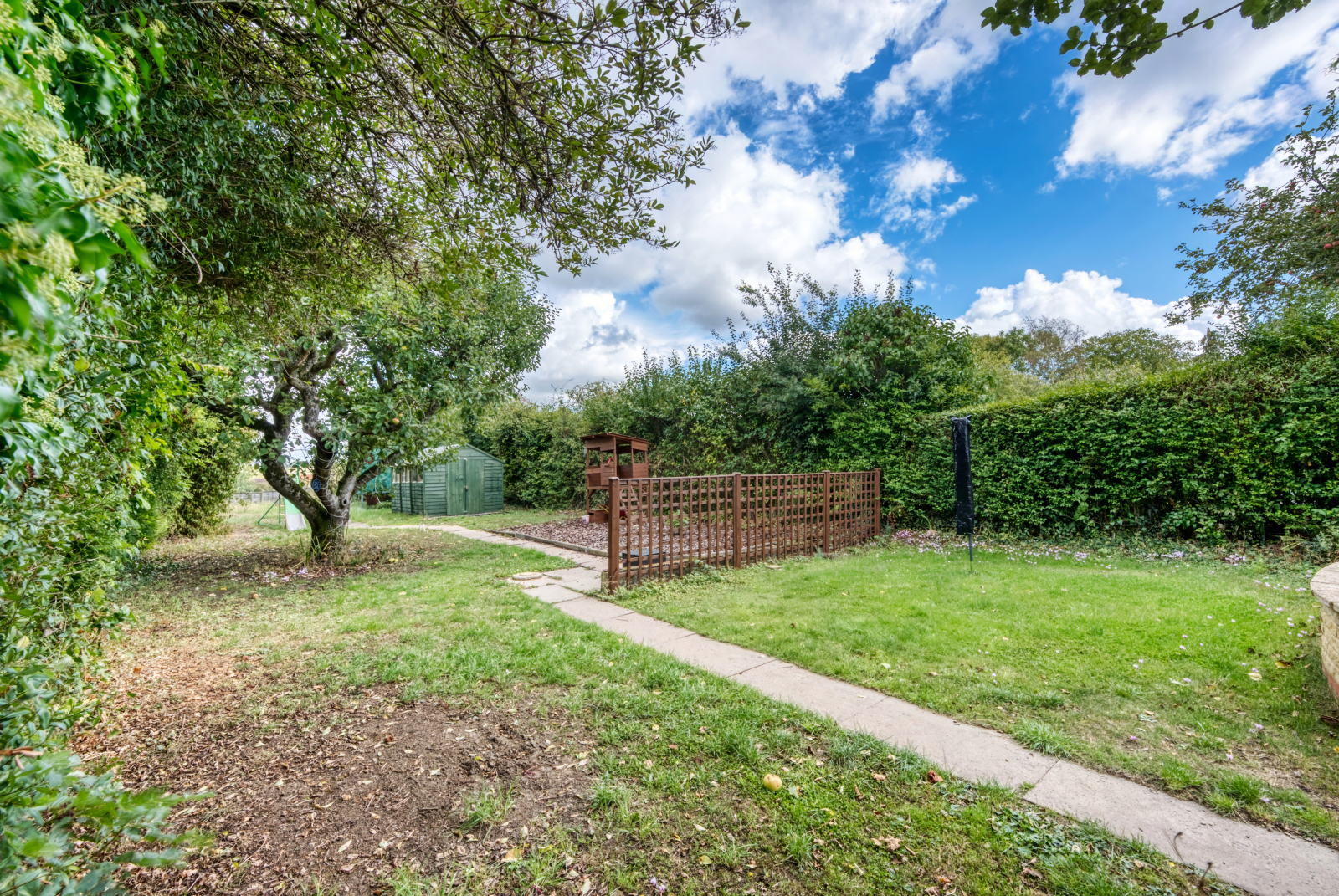 O jardim se estende por uma área grande e bem estabelecida, com caminhos de gramado e cascalho. A seção intermediária apresenta uma pequena área de recreação cercada com lascas de madeira, abrigando uma divertida estrutura de jogo de madeira / estrutura de escalada. Mais abaixo no jardim, você encontrará um grande trampolim fechado e um pequeno escorregador, garantindo que as crianças tenham muito espaço para brincar com segurança.