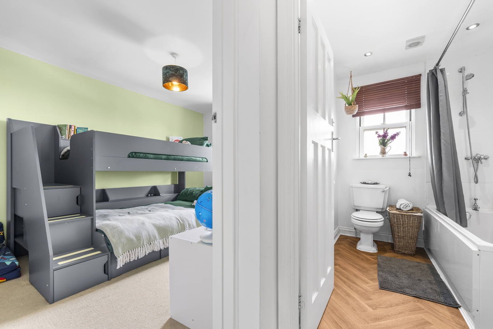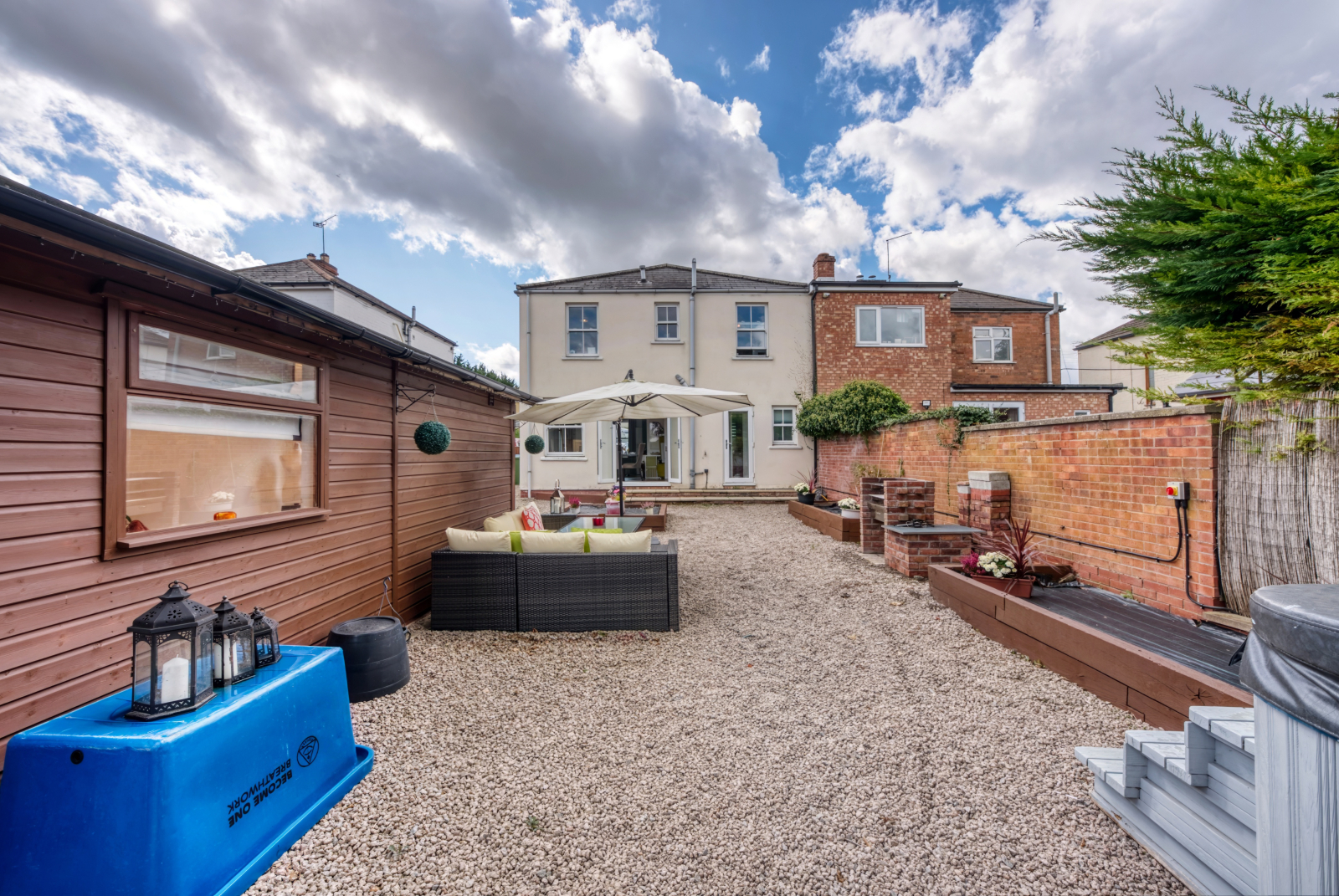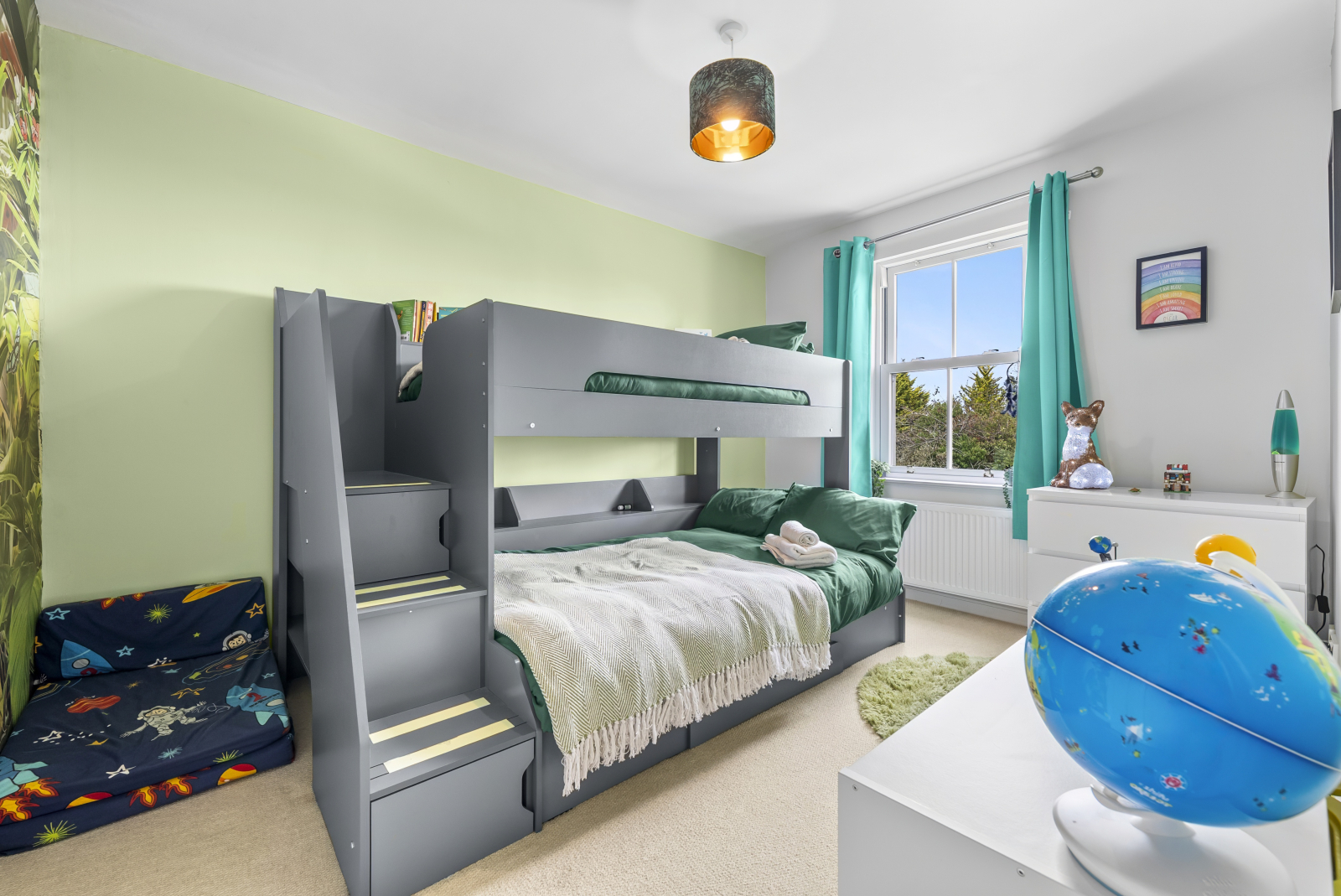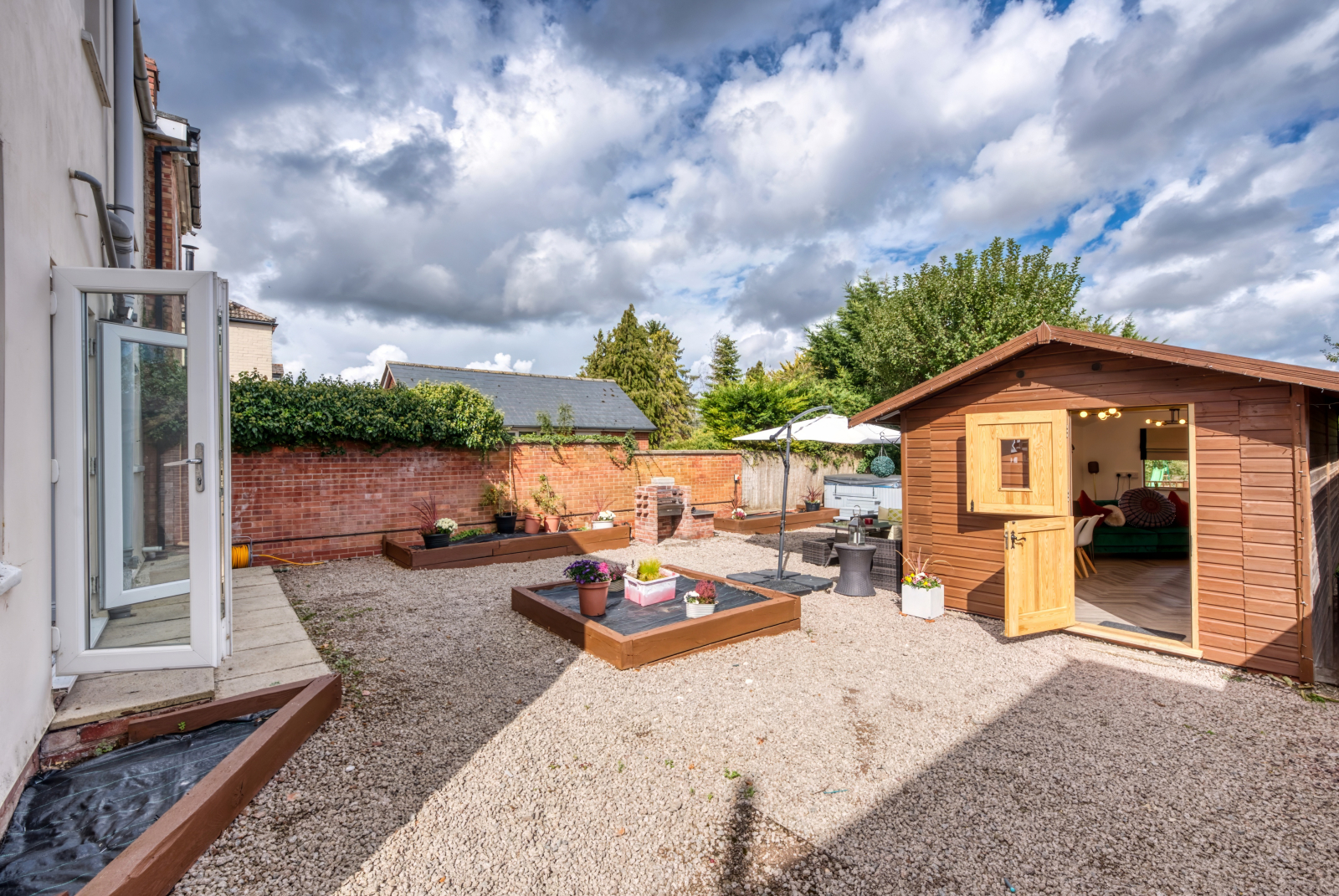 O jardim se estende por uma área grande e bem estabelecida, com caminhos de gramado e cascalho. A seção intermediária apresenta uma pequena área de recreação cercada com lascas de madeira, abrigando uma divertida estrutura de jogo de madeira / estrutura de escalada. Mais abaixo no jardim, você encontrará um grande trampolim fechado e um pequeno escorregador, garantindo que as crianças tenham muito espaço para brincar com segurança.