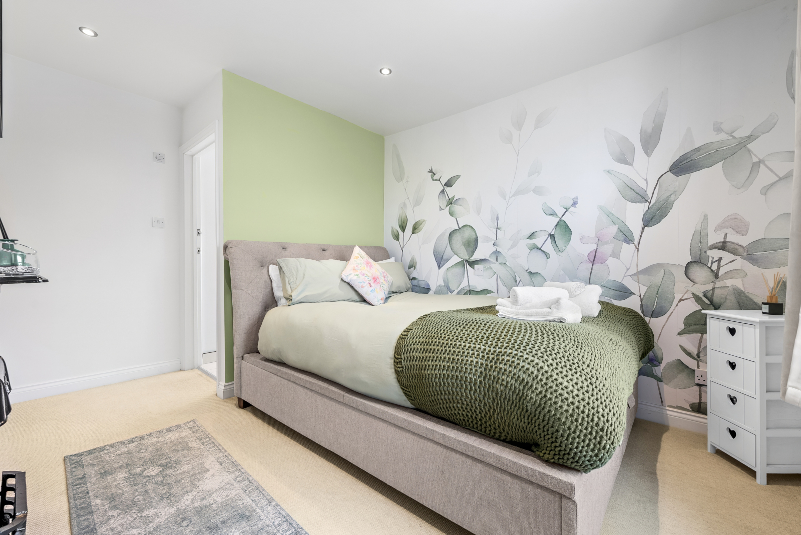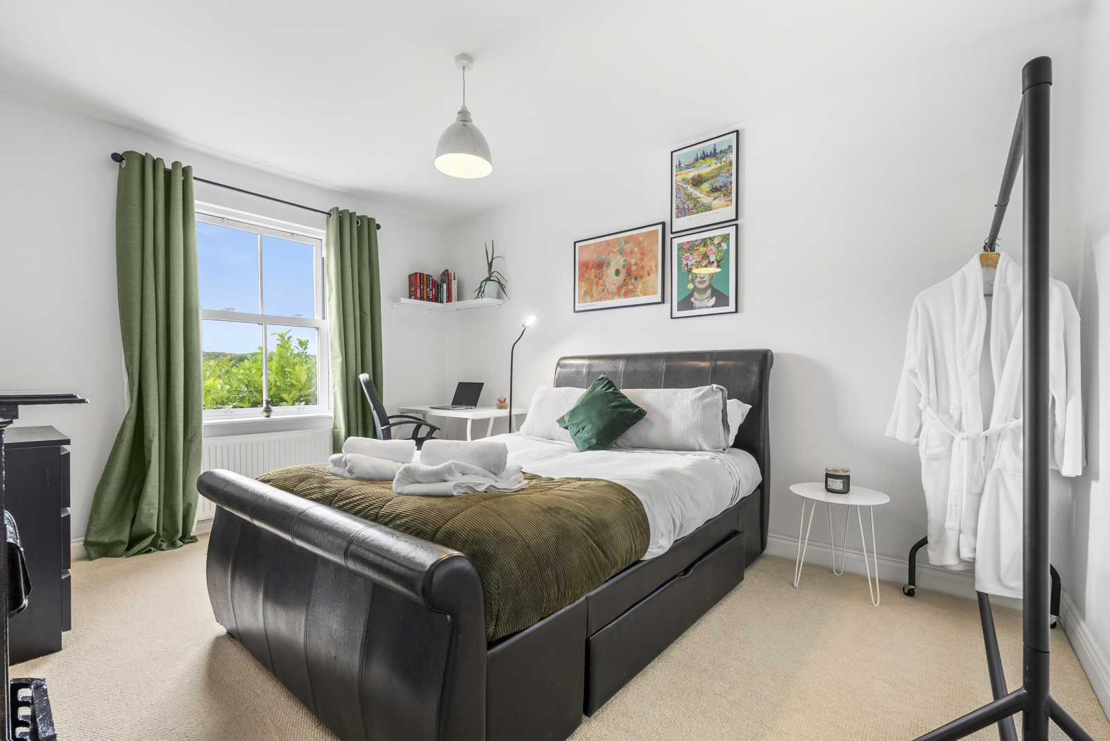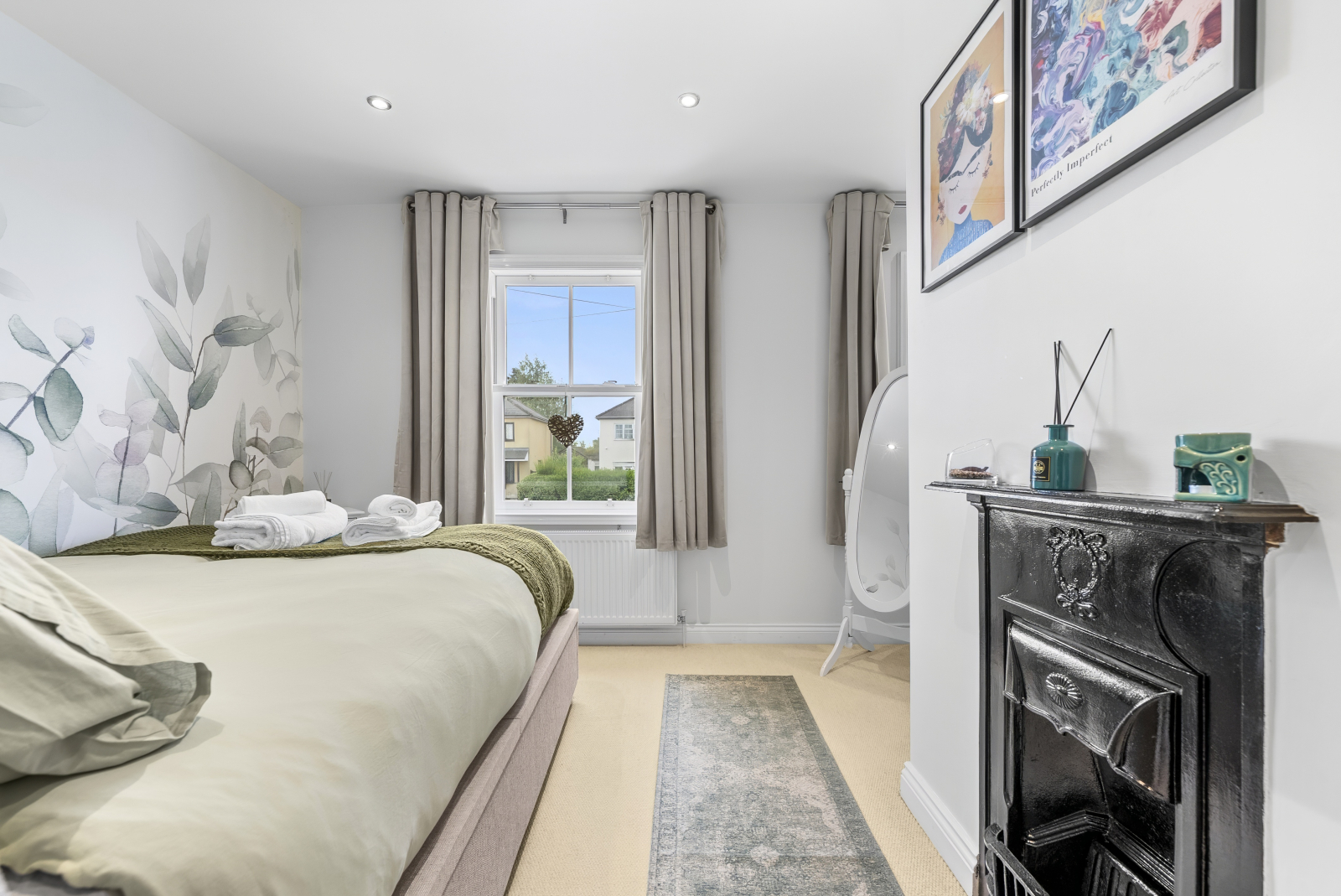 Um grande espaço com uma cama king-size otomana de luxo com qualidade de hotel de alta qualidade. Decorado com bom gosto usando uma paleta suave e inspirada na natureza, o quarto foi projetado para criar um espaço calmante e relaxante, com algumas estampas para trazer um pouco de cor ao quarto acima da lareira original de ferro fundido. As janelas de guilhotina frontais permitem muita luz natural durante o dia e oferecem uma vista agradável do bairro circundante.