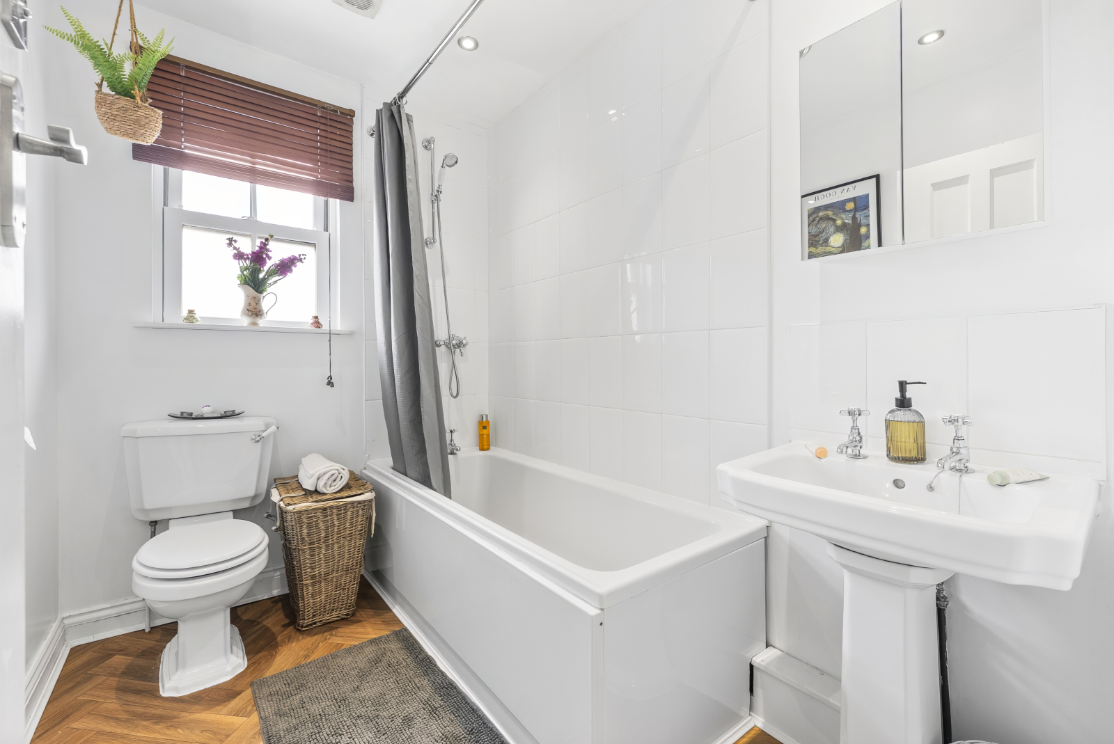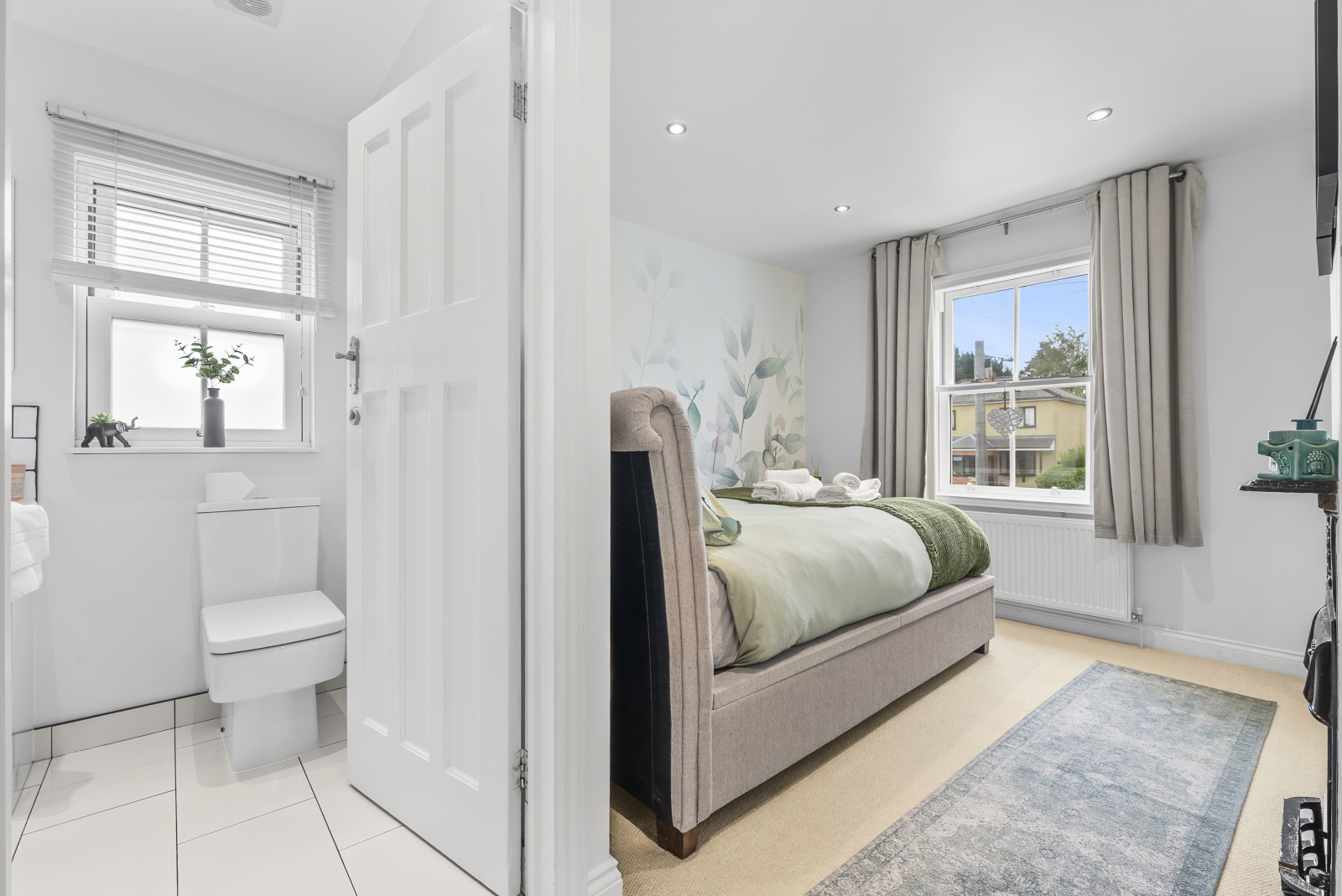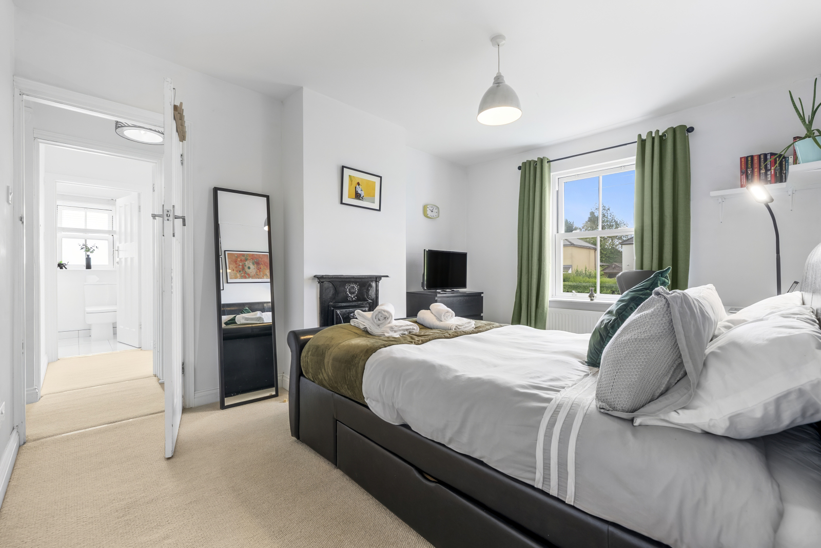 Um grande espaço com uma cama king-size otomana de luxo com qualidade de hotel de alta qualidade. Decorado com bom gosto usando uma paleta suave e inspirada na natureza, o quarto foi projetado para criar um espaço calmante e relaxante, com algumas estampas para trazer um pouco de cor ao quarto acima da lareira original de ferro fundido. As janelas de guilhotina frontais permitem muita luz natural durante o dia e oferecem uma vista agradável do bairro circundante.