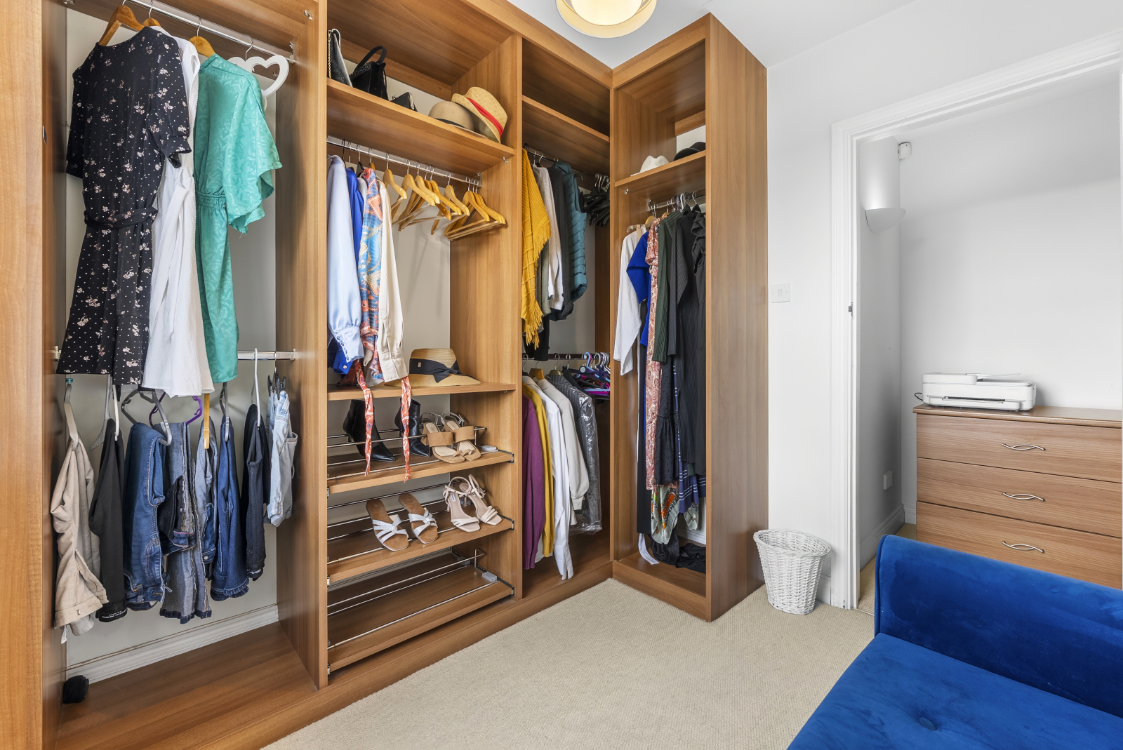 Adicionando um toque de luxo à sua estadia, este guarda-roupa elegante e cuidadosamente concebido oferece o espaço perfeito para manter as suas roupas, sapatos e acessórios bem organizados durante a sua estadia. Apresentando um grande guarda-roupa de madeira embutido com amplo espaço para pendurar, prateleiras abertas e sapateiras dedicadas.