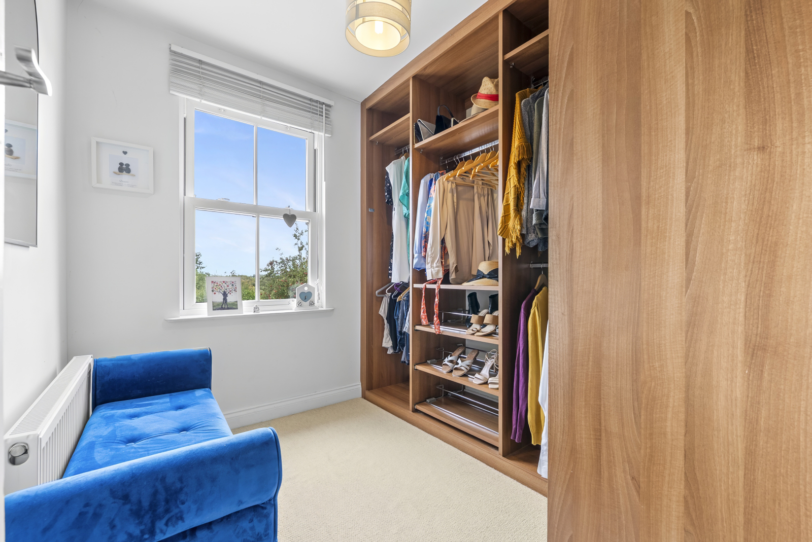 A luz natural inunda a sala através de uma janela de guilhotina, criando uma atmosfera luminosa e acolhedora. Um banco de veludo azul royal macio oferece um local confortável para se vestir ou simplesmente relaxar.