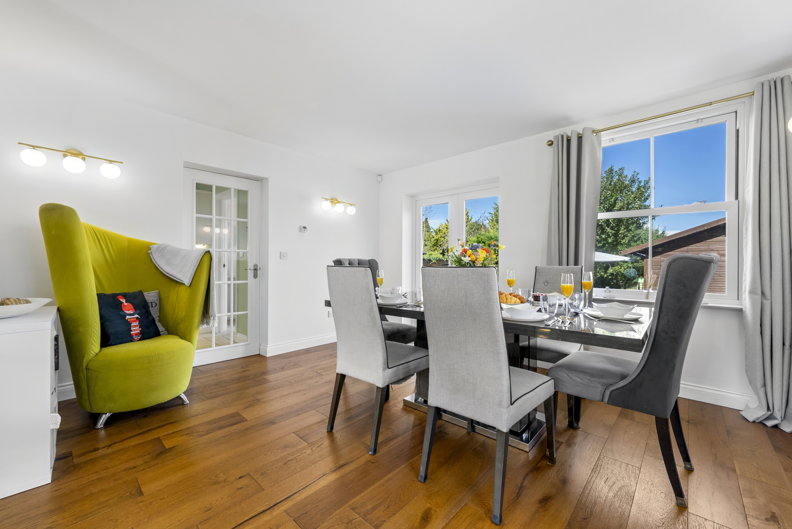 A sala de estar flui para uma área de jantar dedicada com uma mesa grande e assentos confortáveis com encosto alto para 6 pessoas. Grandes janelas e portas de vidro duplo francesas inundam a sala com luz natural e oferecem uma vista agradável do exterior.