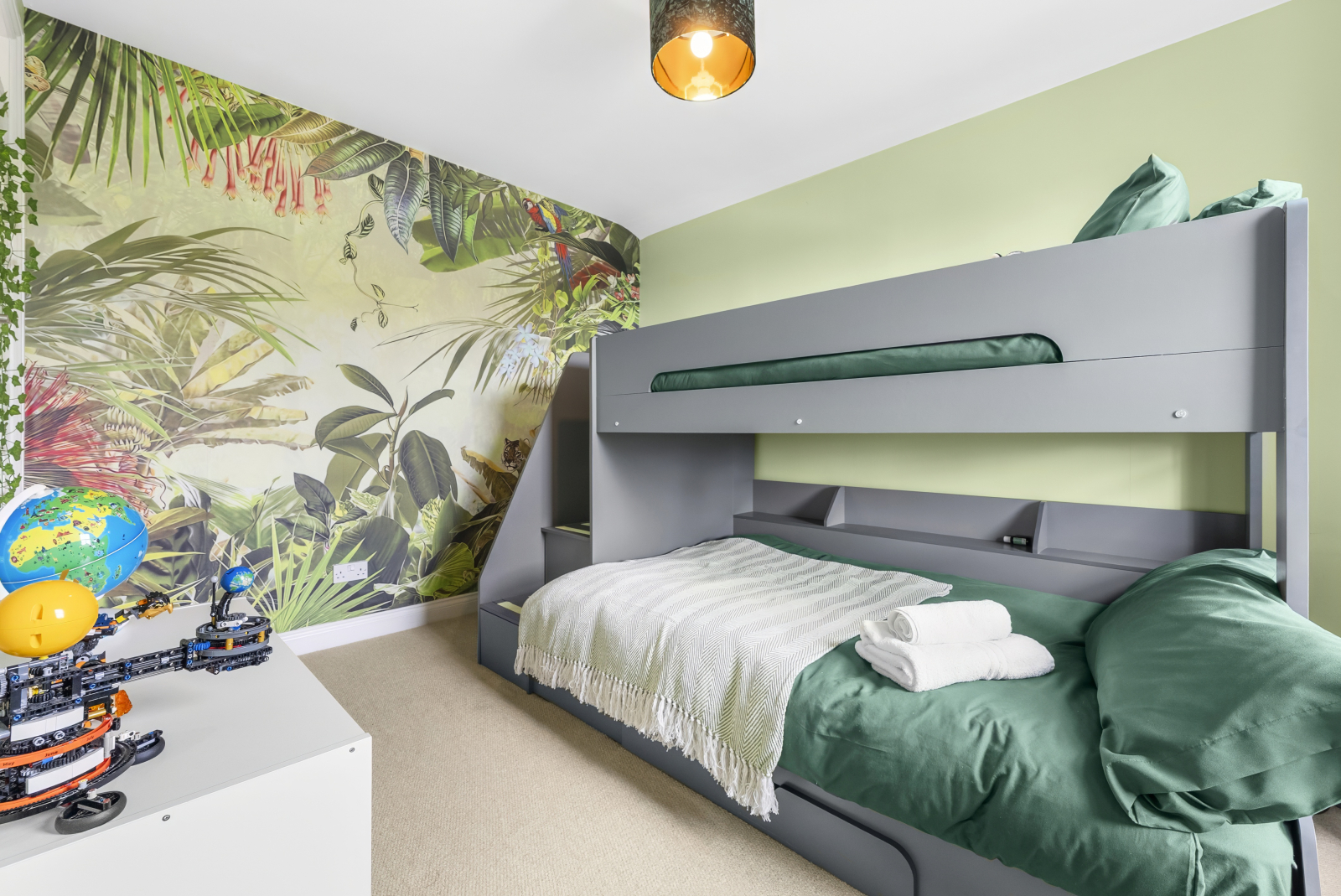 Um quarto vibrante e aconchegante projetado para despertar a imaginação e a curiosidade. Deixe seu pequeno explorador adormecer cercado por um impressionante mural de parede com tema de selva, repleto de verdes, vermelhos e amarelos exuberantes. A parede verde clara adjacente adiciona um equilíbrio calmante à energia lúdica da sala.