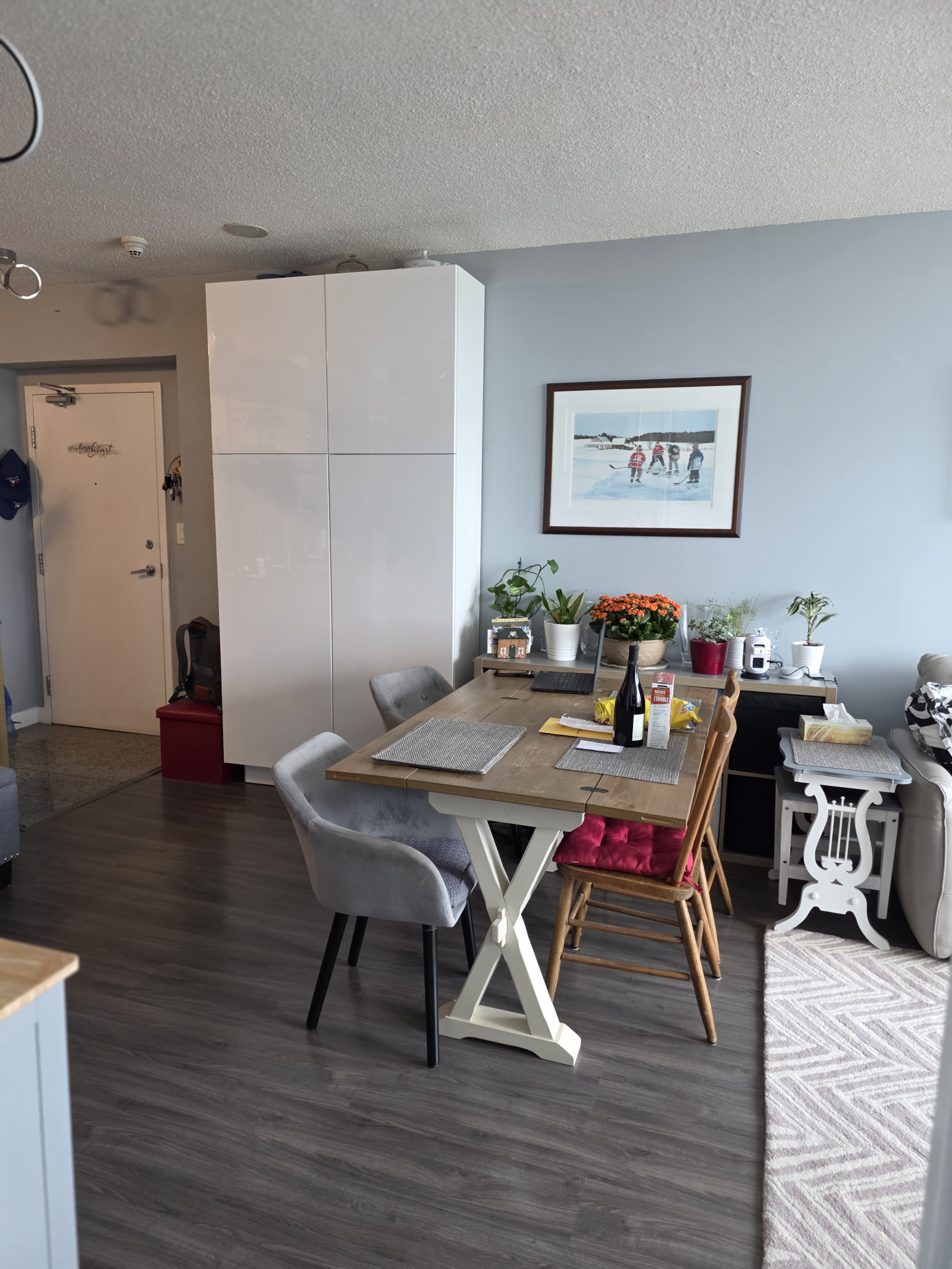 Nosso condomínio de 1 quarto com uma sala está totalmente equipado. Nossa sala tem uma 2ª cama queen size (cama Murphy), que funciona como minha estação de trabalho durante o dia, e uma cama dobrável à noite.