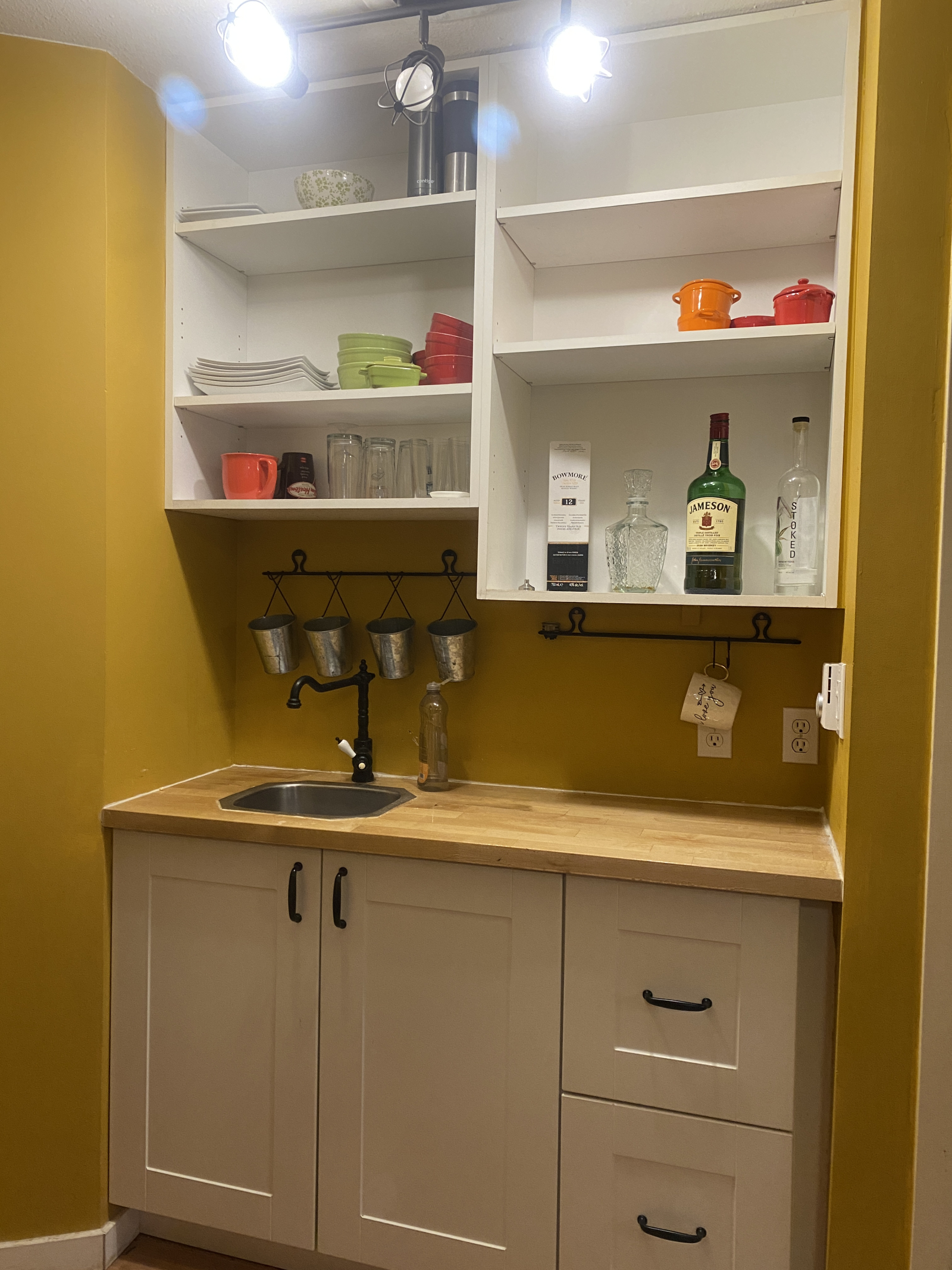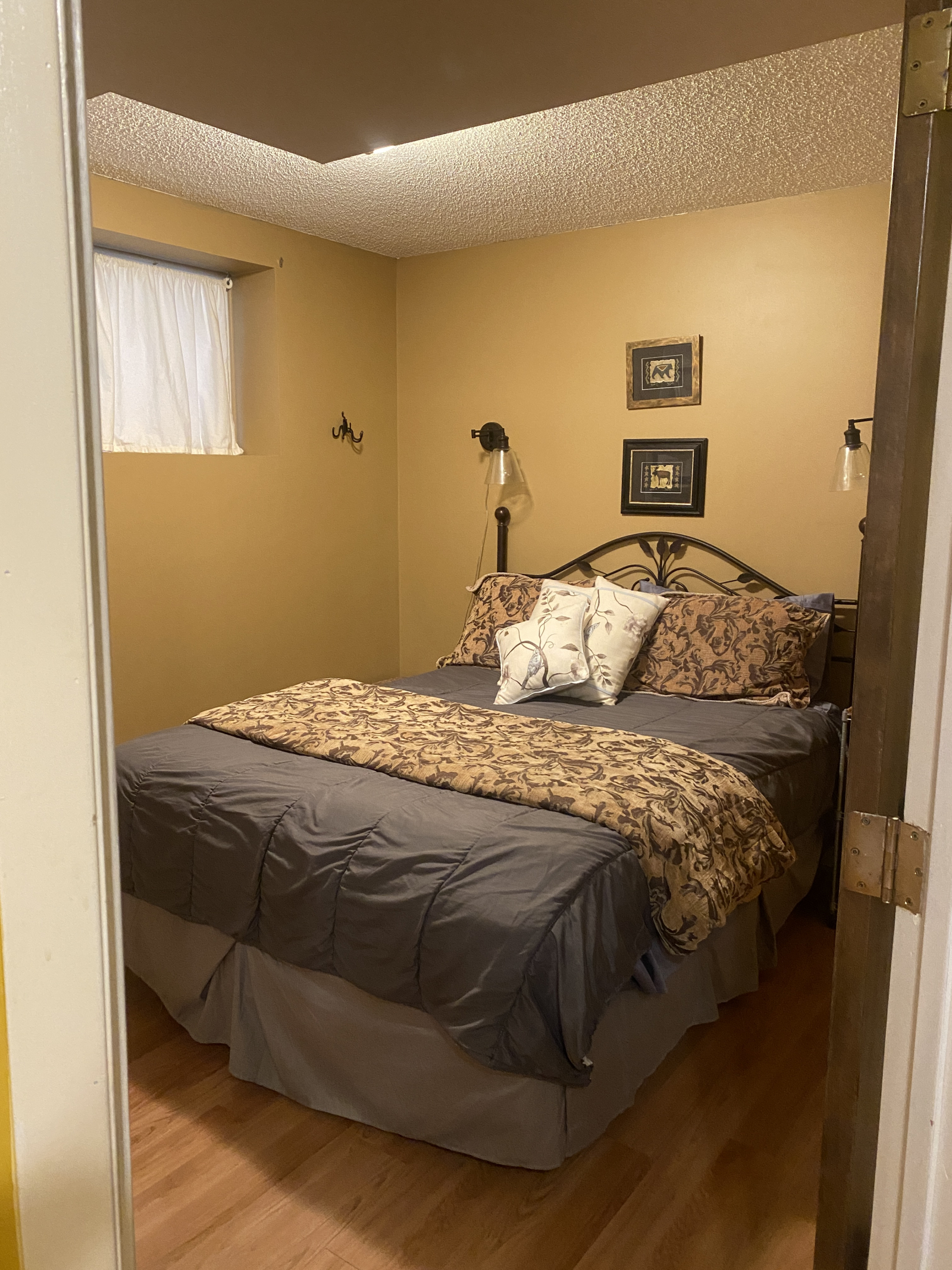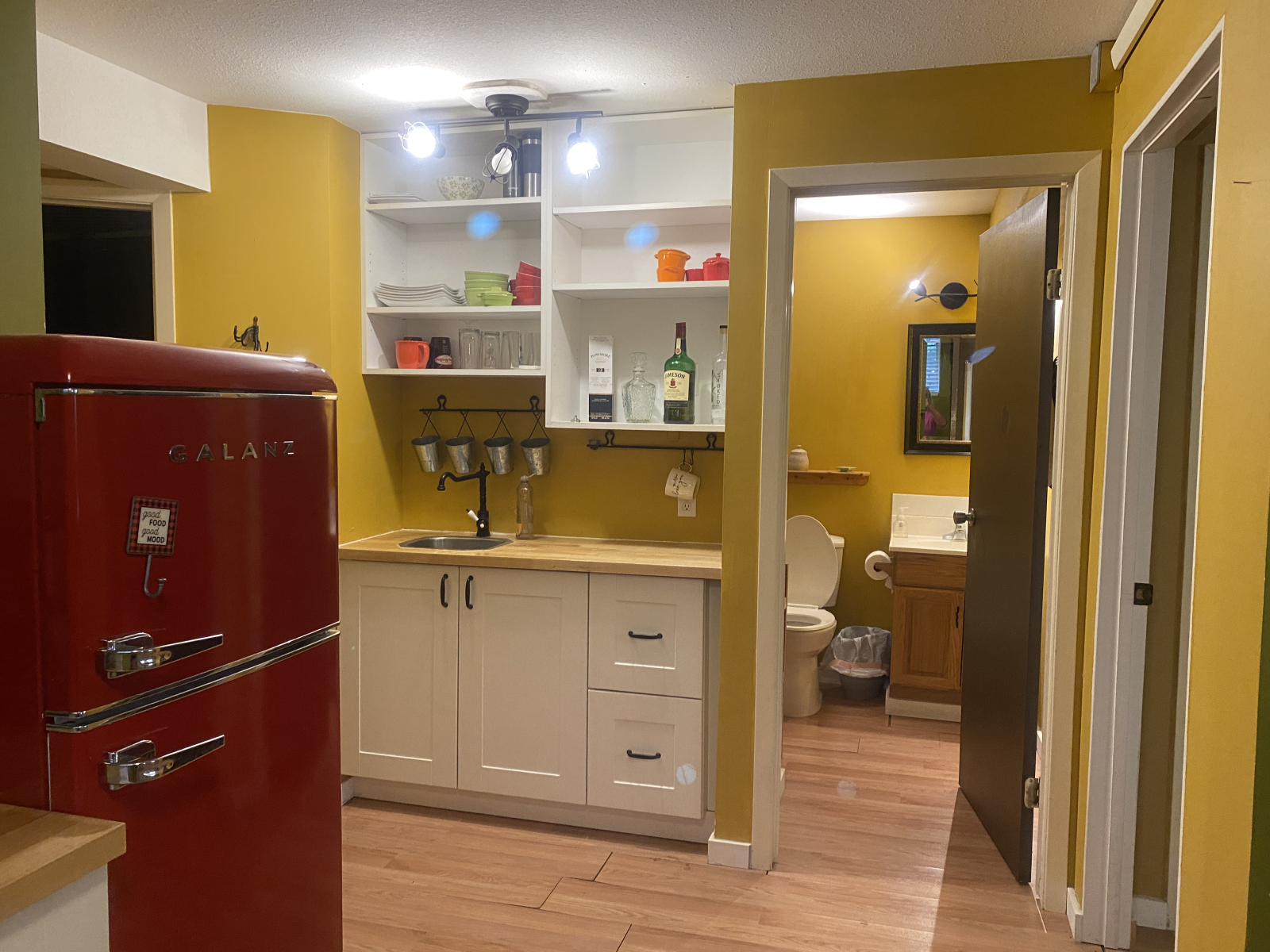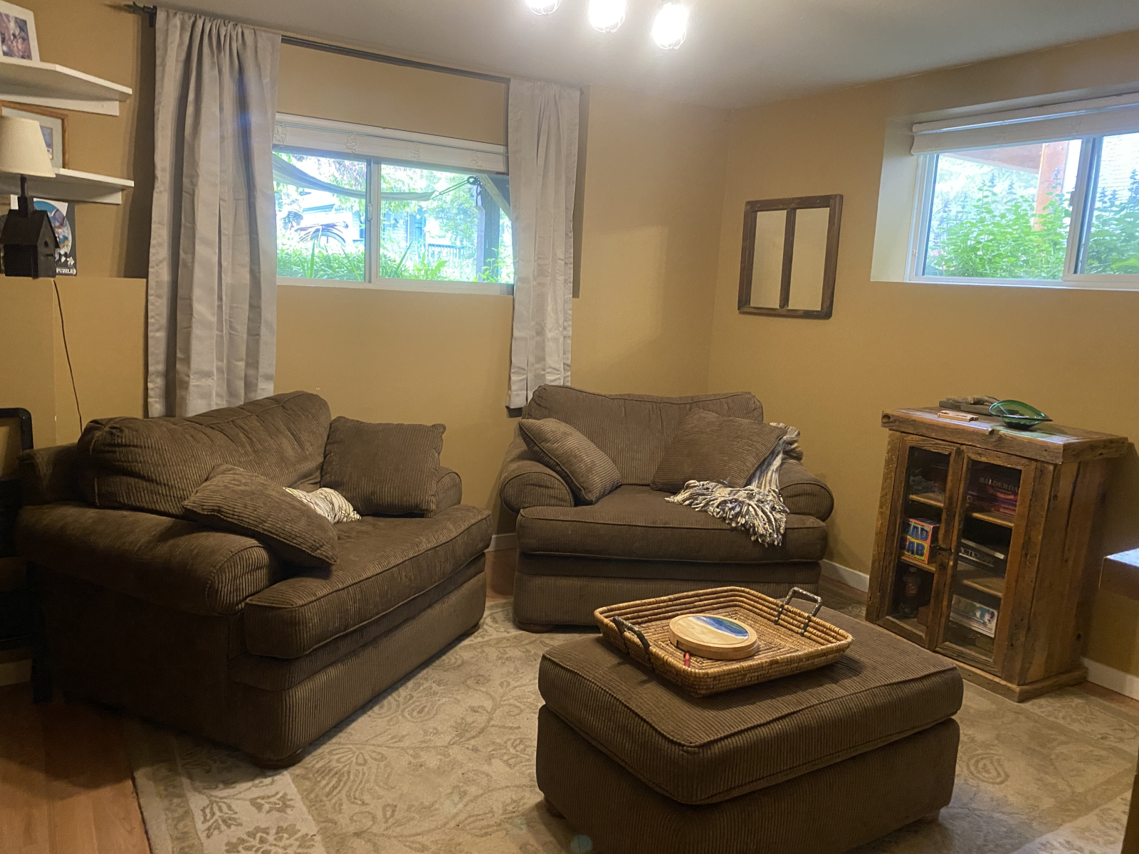 Isso pode funcionar para você se você não se importar com uma opção de hospitalidade enquanto ainda desfruta de sua privacidade. Nossa suíte de um quarto no porão é completamente independente, com entrada lateral, grandes janelas, sala de estar, cozinha, quarto, recanto extra para dormir, banheiro e lavanderia.