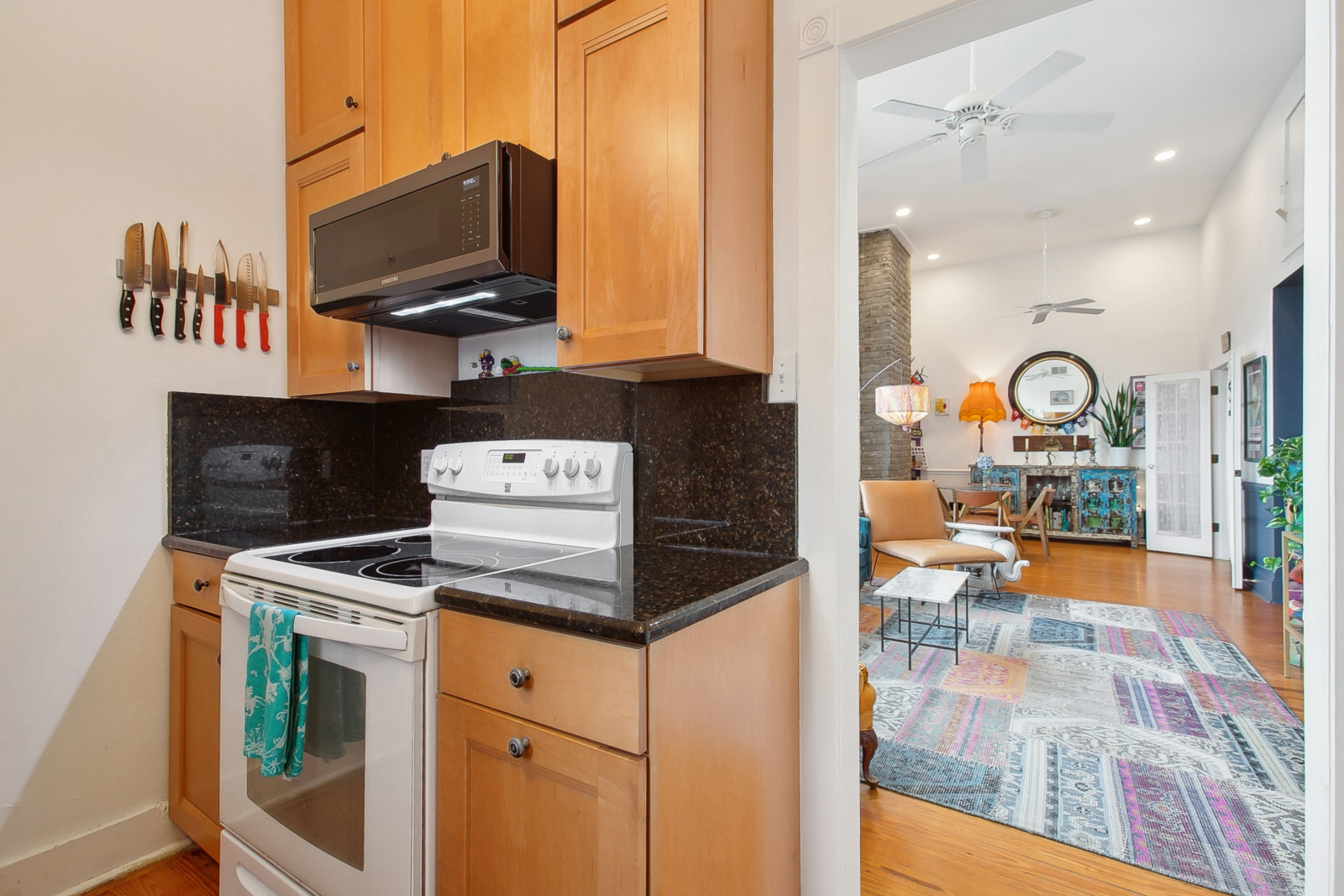 Maravilhosa sala de jantar e bar, bem como equipamento estéreo para girar discos ou tocar WWOZ.