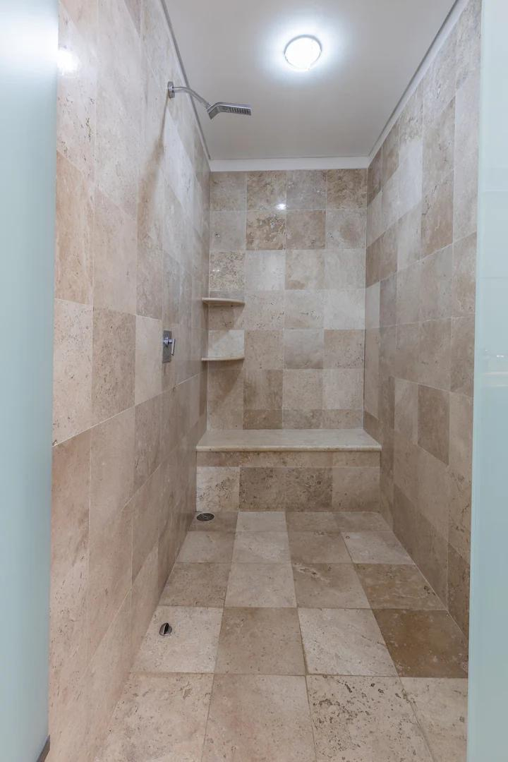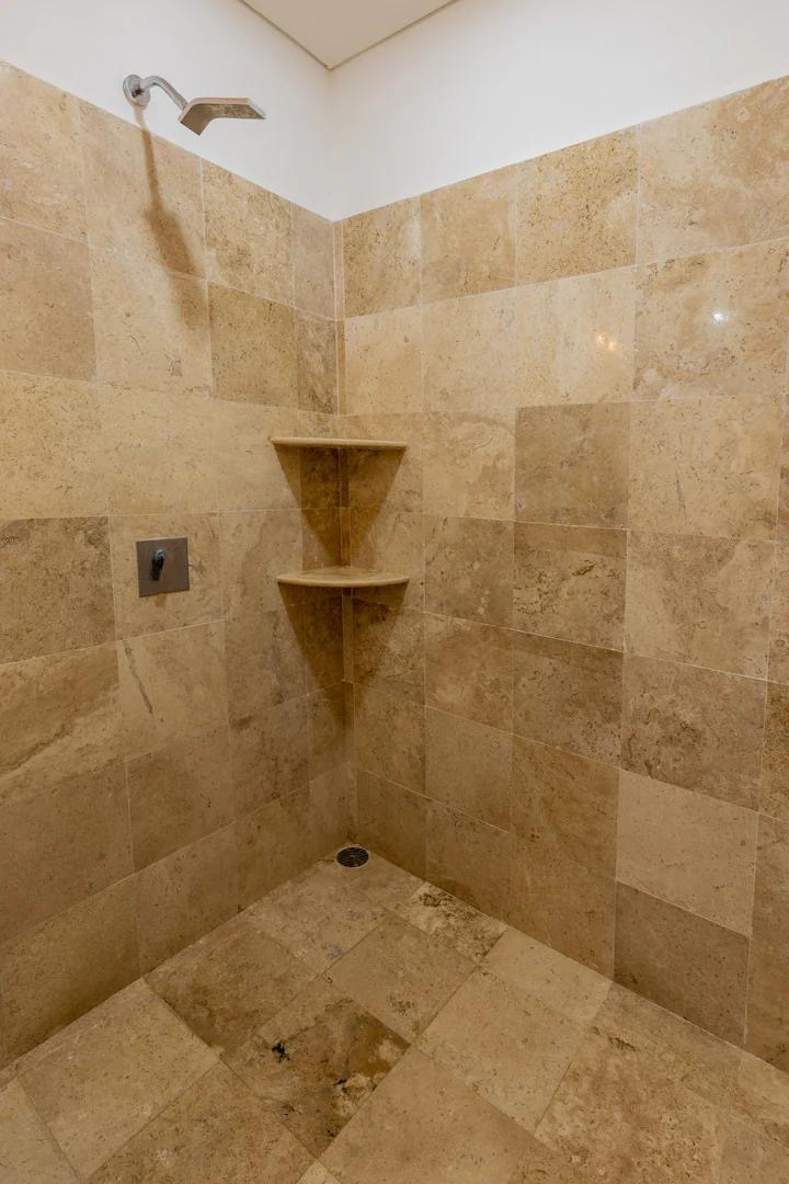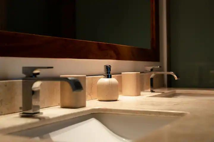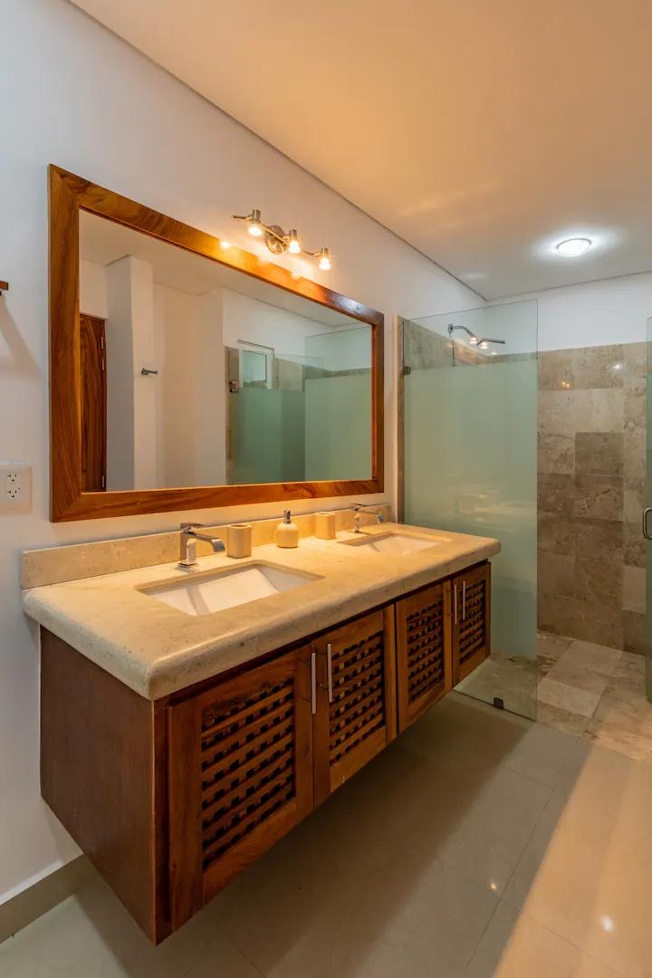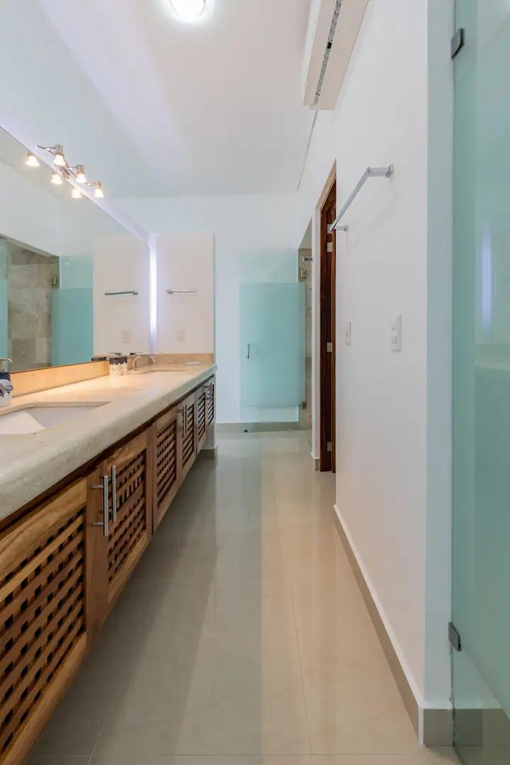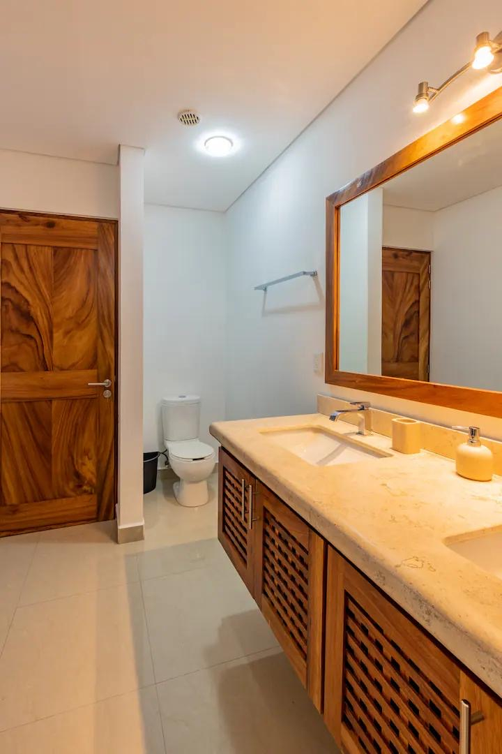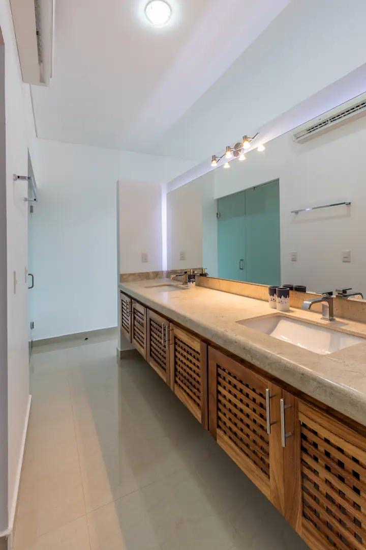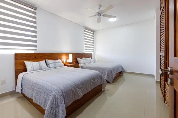 2 quartos, o master com uma bela vista para o mar, banheiro próprio e cama king size, o segundo quarto com 2 camas de casal e banheiro próprio.