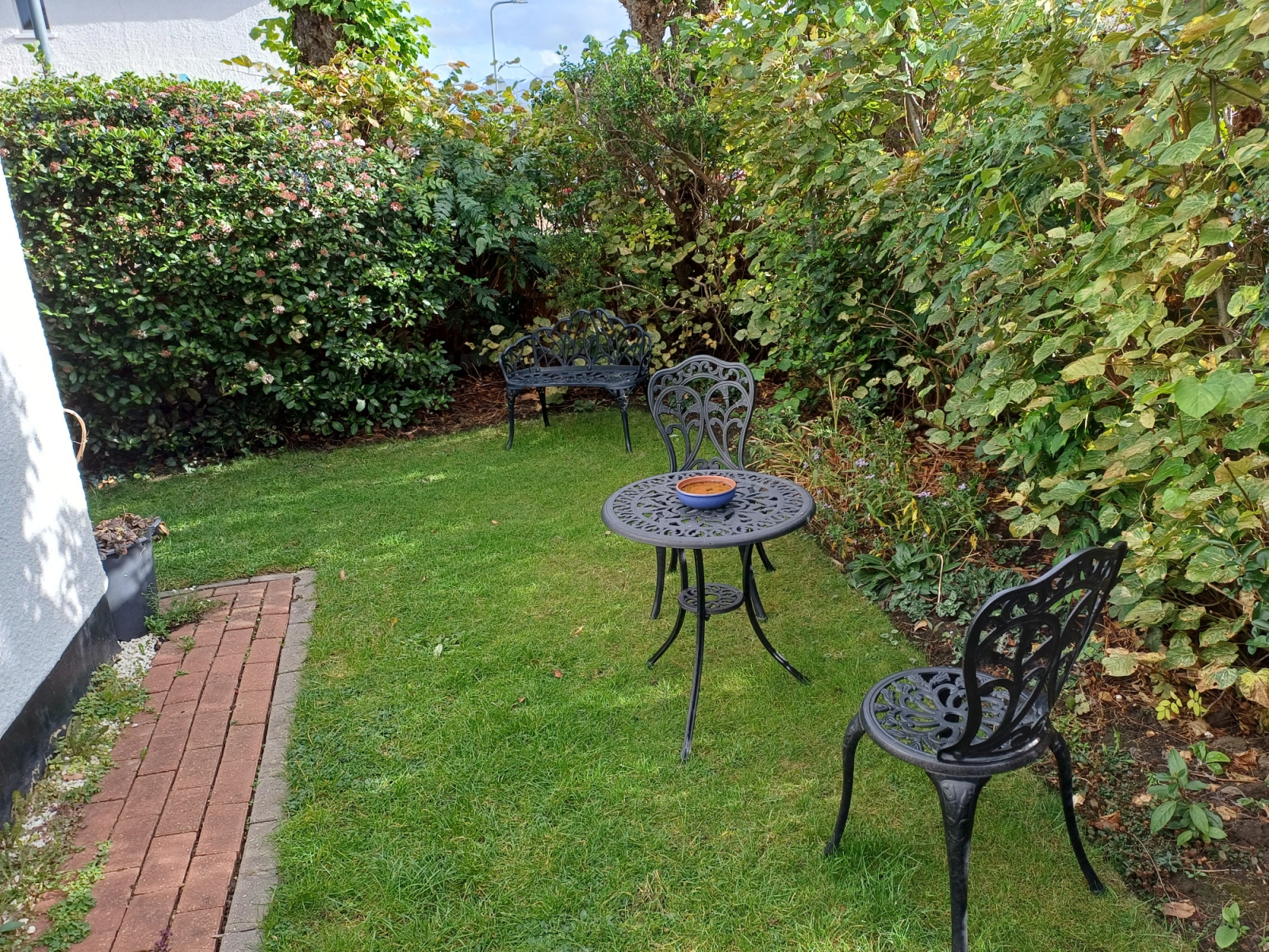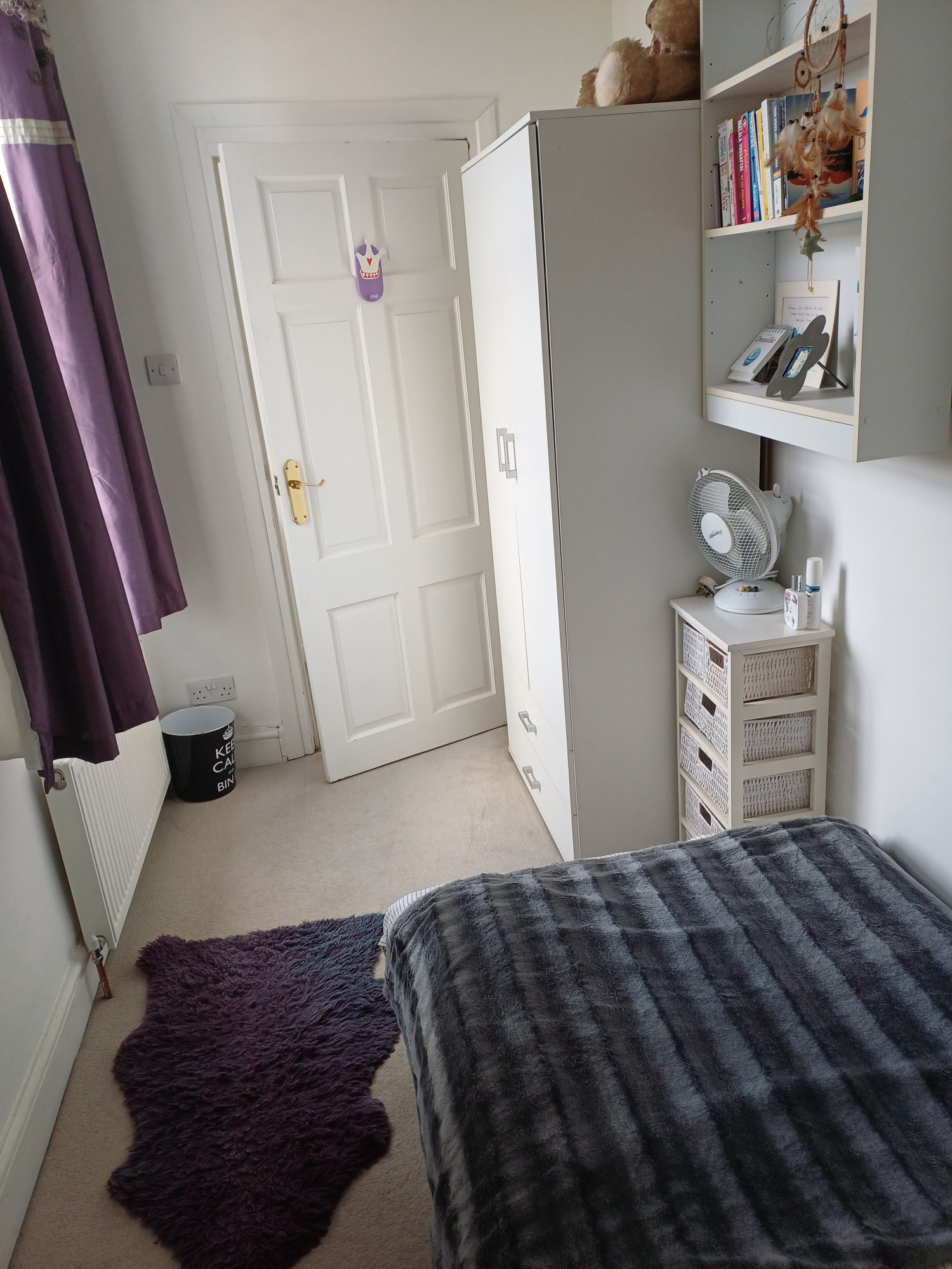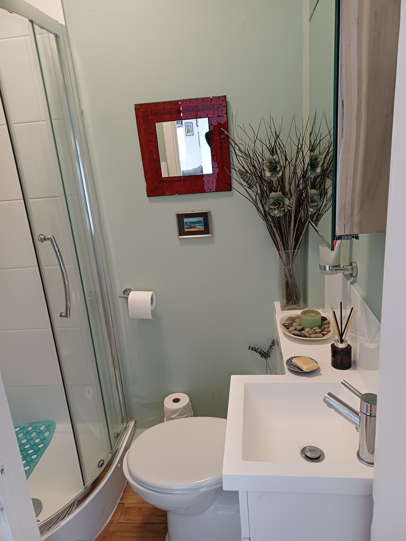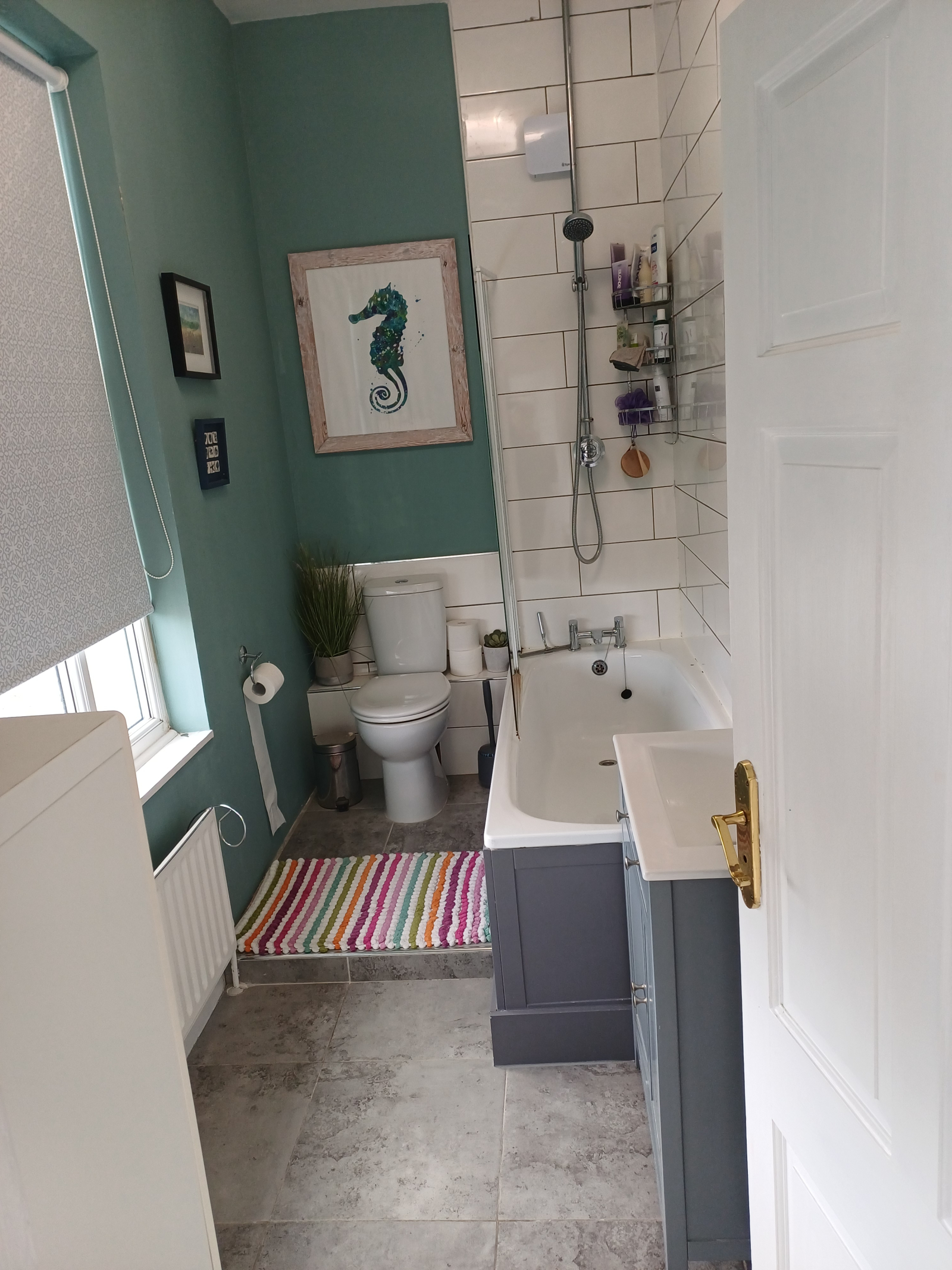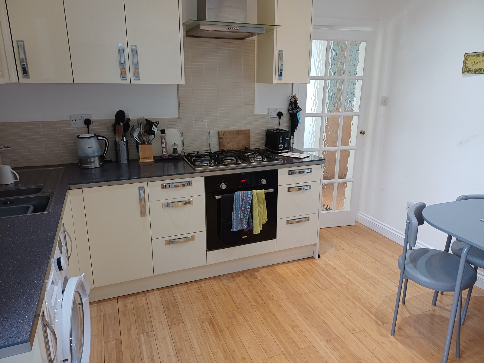 A cozinha tem todas as comodidades habituais, além de uma pequena mesa e cadeiras, e dá para o pátio. No andar de baixo há um pequeno chuveiro/banheiro. No andar de cima há 2 quartos duplos pequenos e um quarto de solteiro. Os quartos têm um pequeno guarda-roupa e gaveta além do meu. Os convidados podem usar meu quarto se preferirem, mas precisam saber que vai ter todas as minhas coisas lá dentro, então não tem espaço para o guarda-roupa. O banheiro principal também fica no andar de cima.