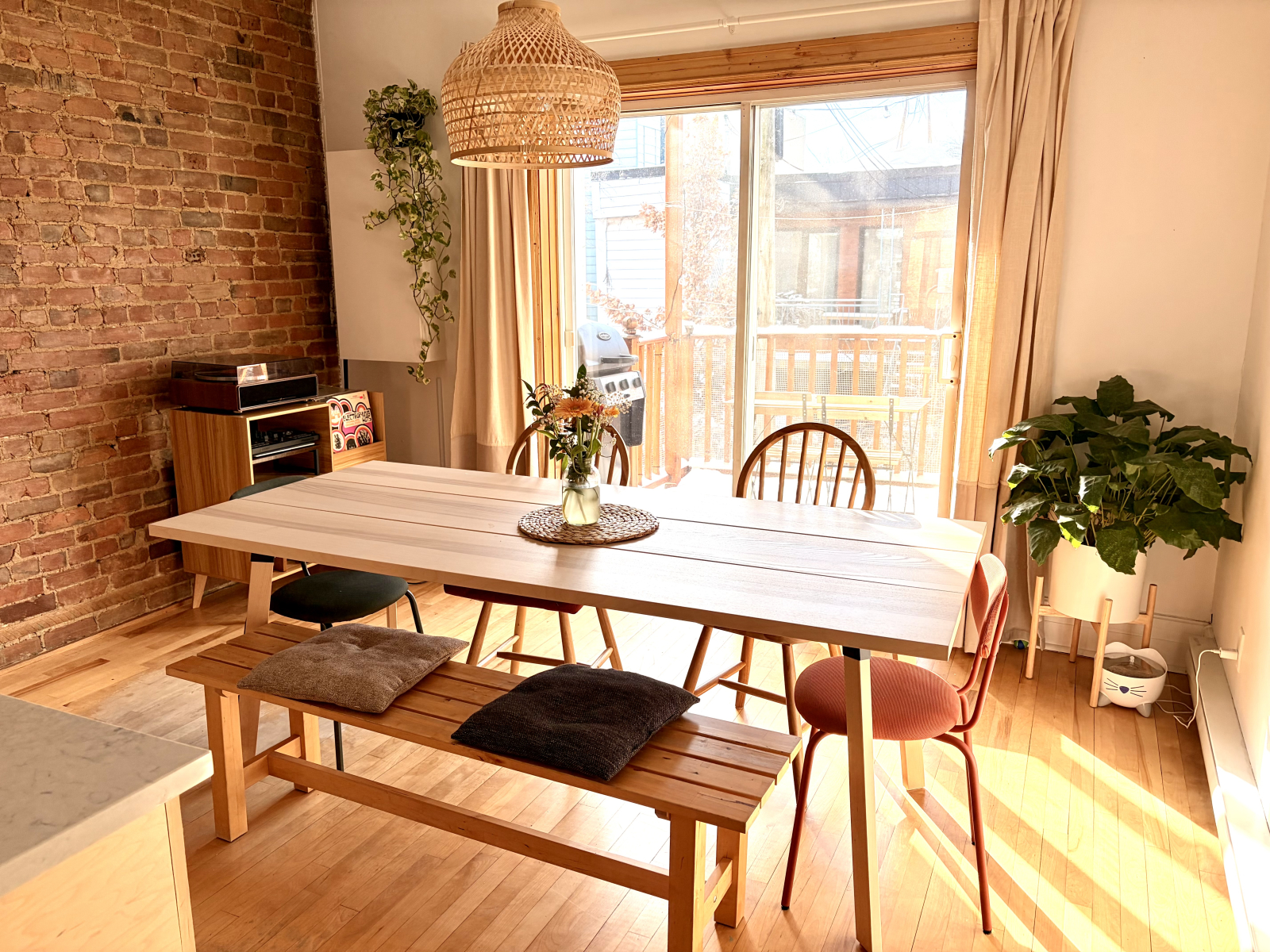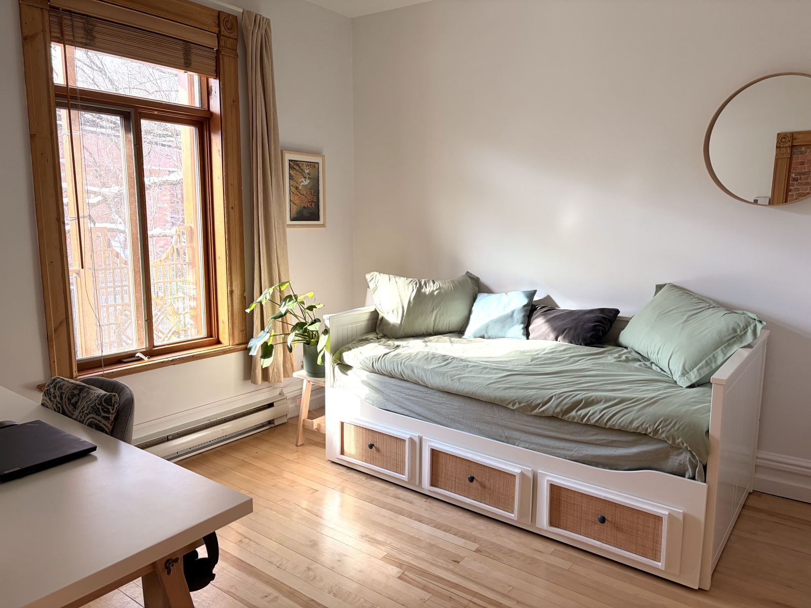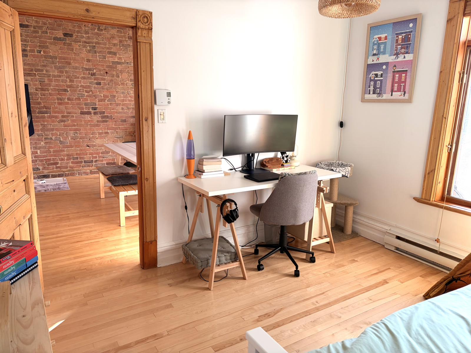 Lá dentro, você encontrará um espaço aberto e iluminado com belas paredes originais de tijolos expostos (muito típico de Montreal!). Adoramos como o espaço é calmo e acolhedor. É um apartamento de dois quartos, mas transformamos o segundo quarto em escritório/quarto de hóspedes, a cama de dia se transforma em cama para duas pessoas.