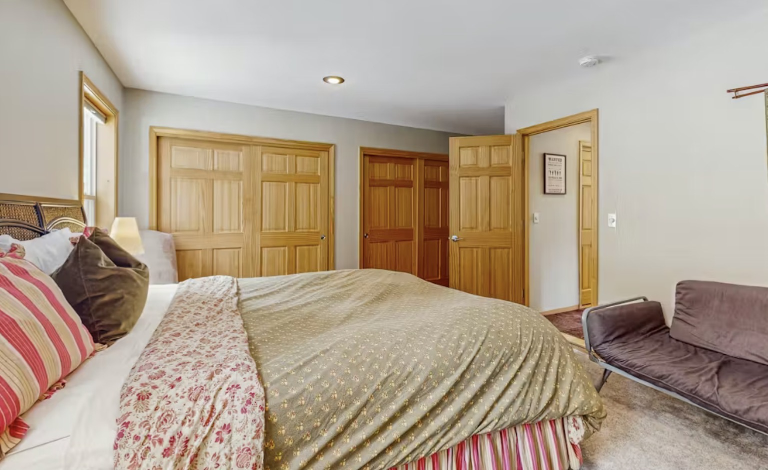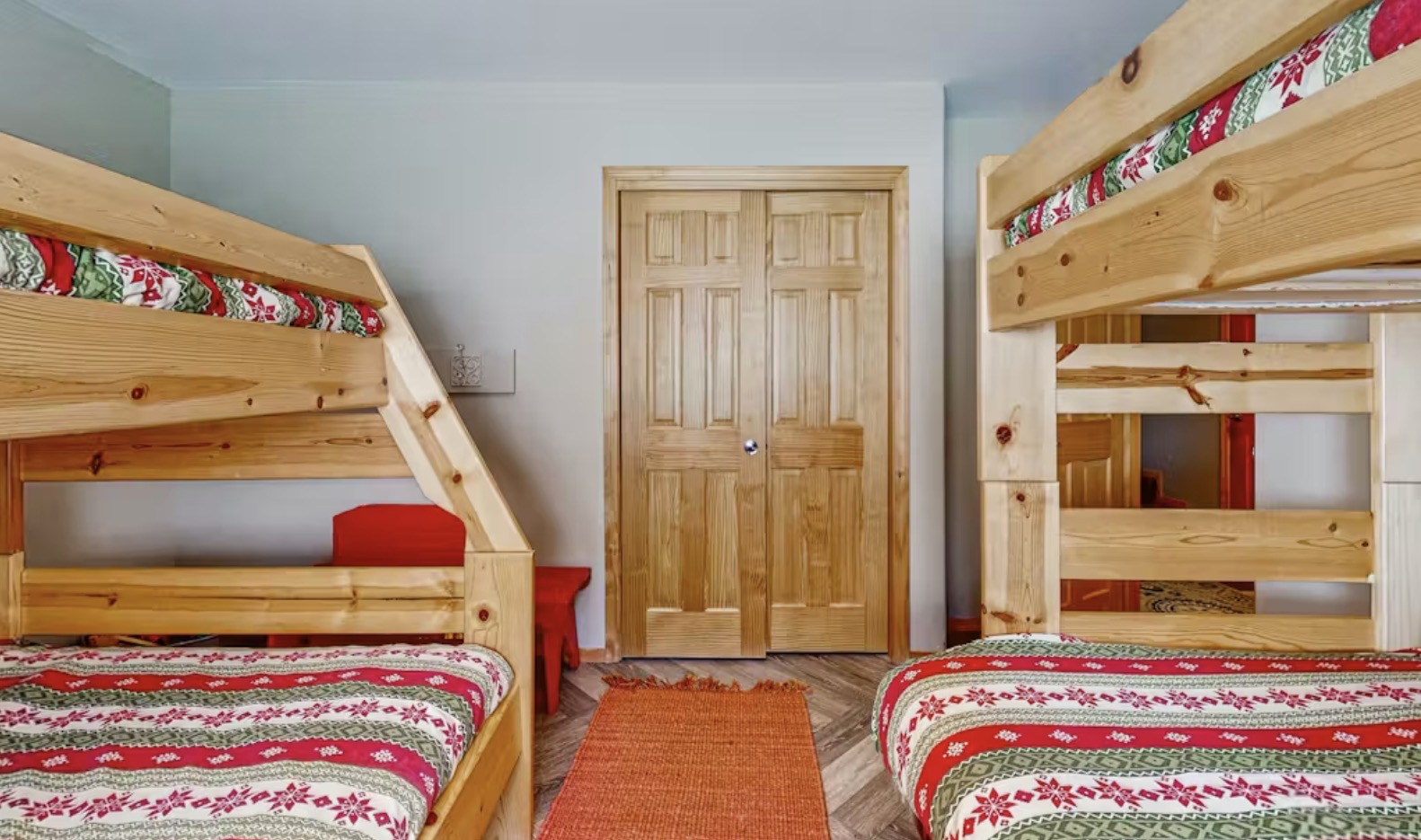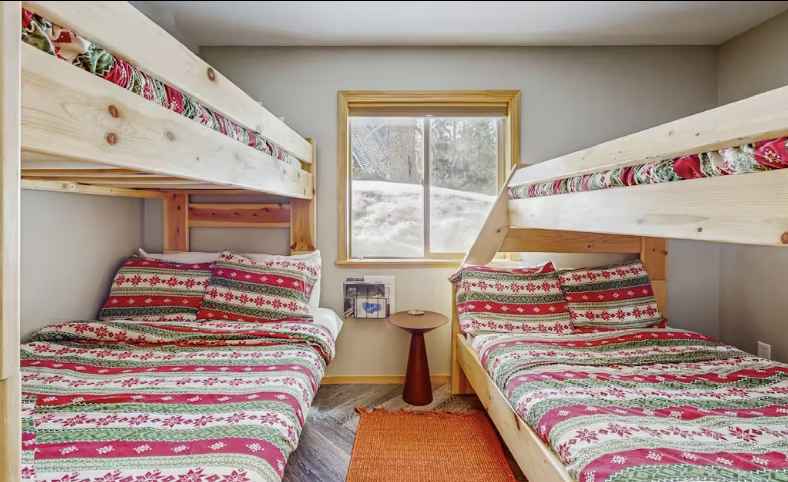 Três quartos; um com um California king, um com queen e um com dois beliches (de casal na parte de baixo e de solteiro em cima).
