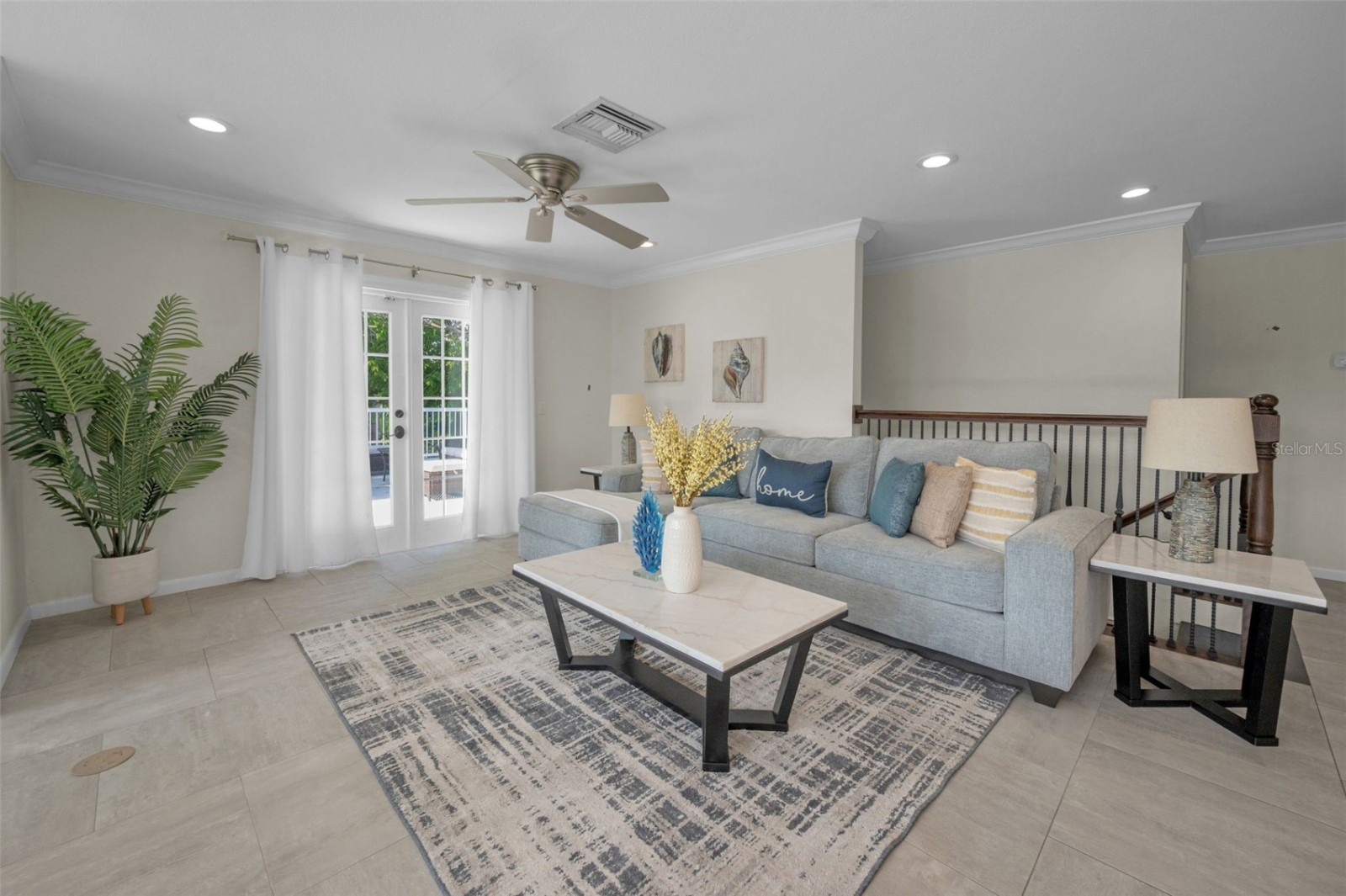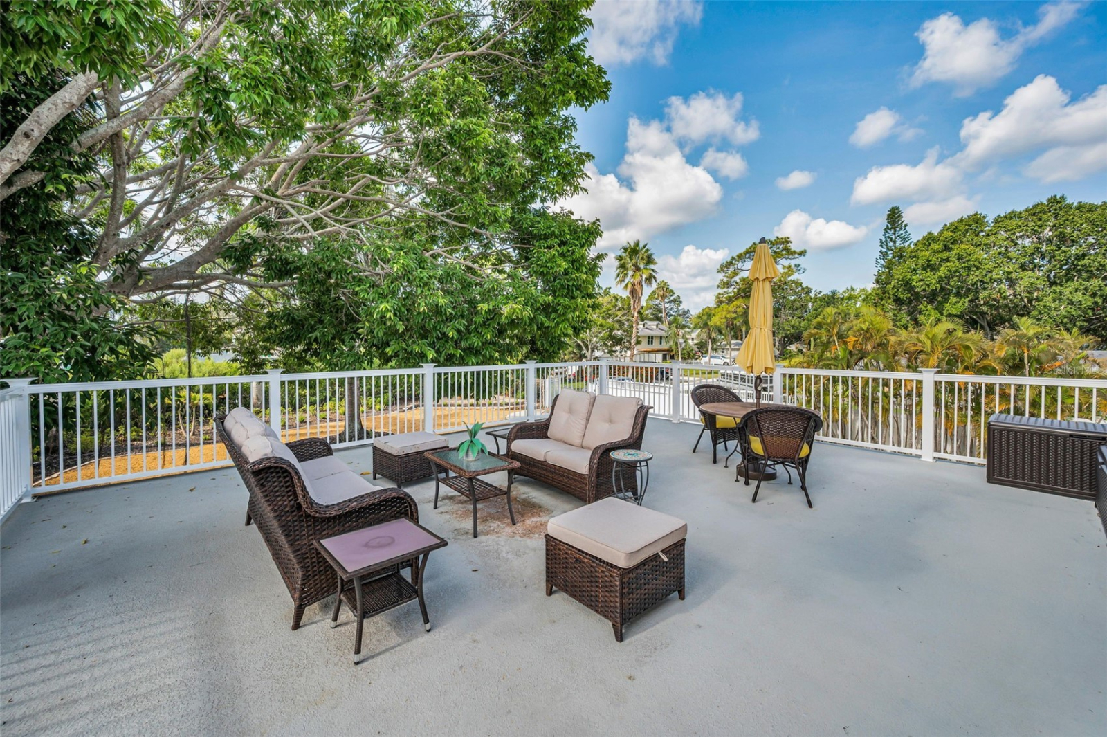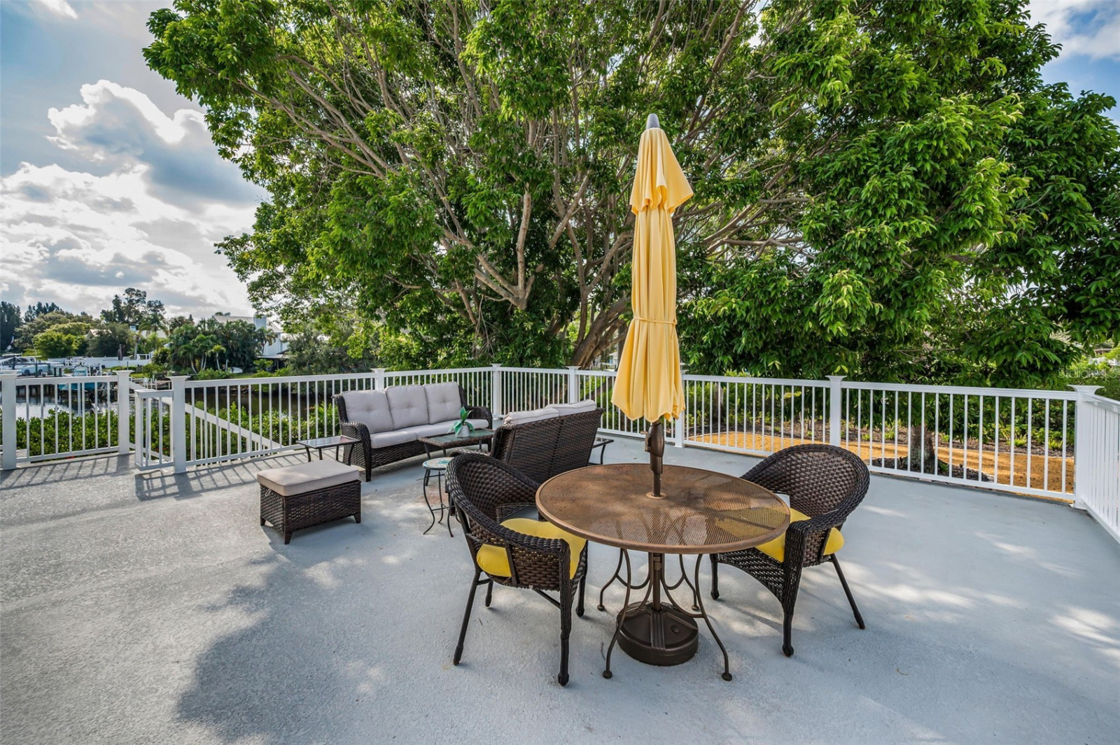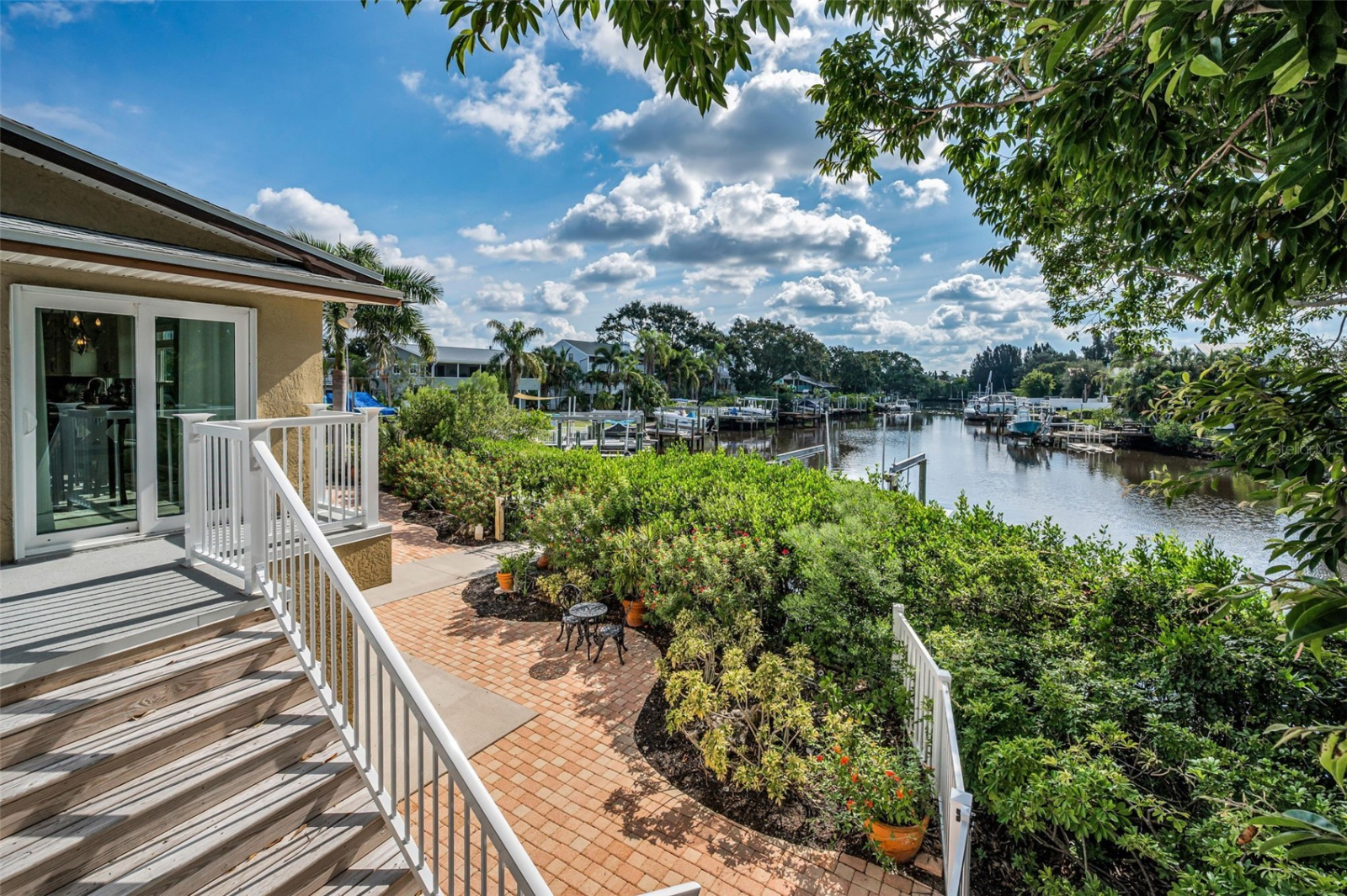 Portas francesas levam a uma enorme varanda com vista para a água e os jardins — o lugar perfeito para seu café da manhã ou vinho à noite