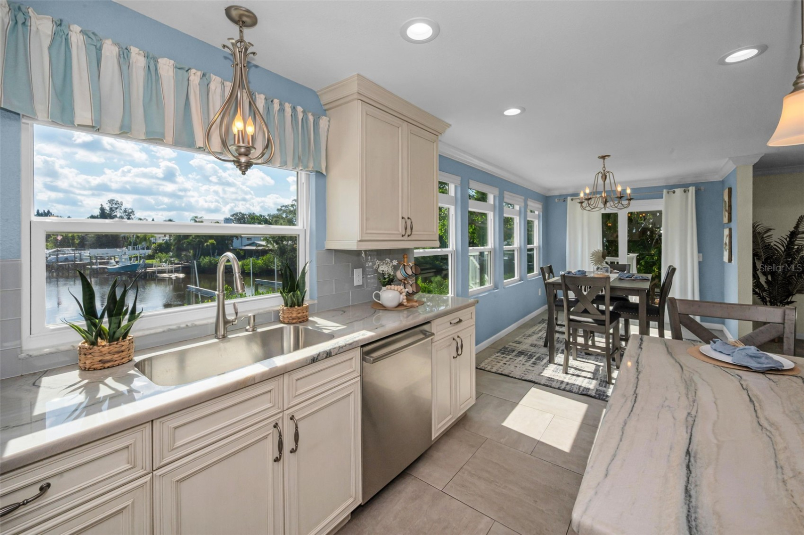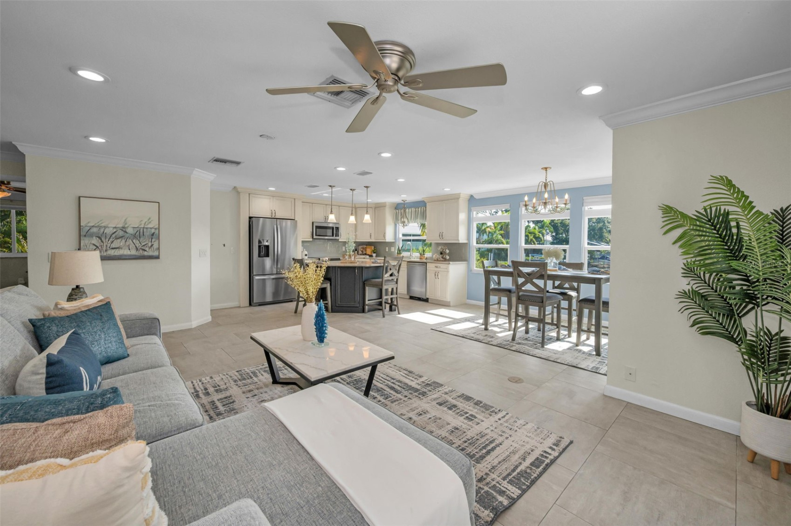 Sala grande de conceito aberto com piso de porcelana e belas vistas para a água