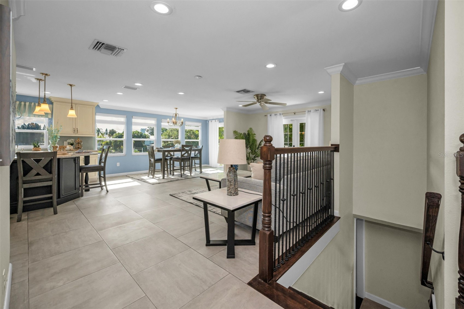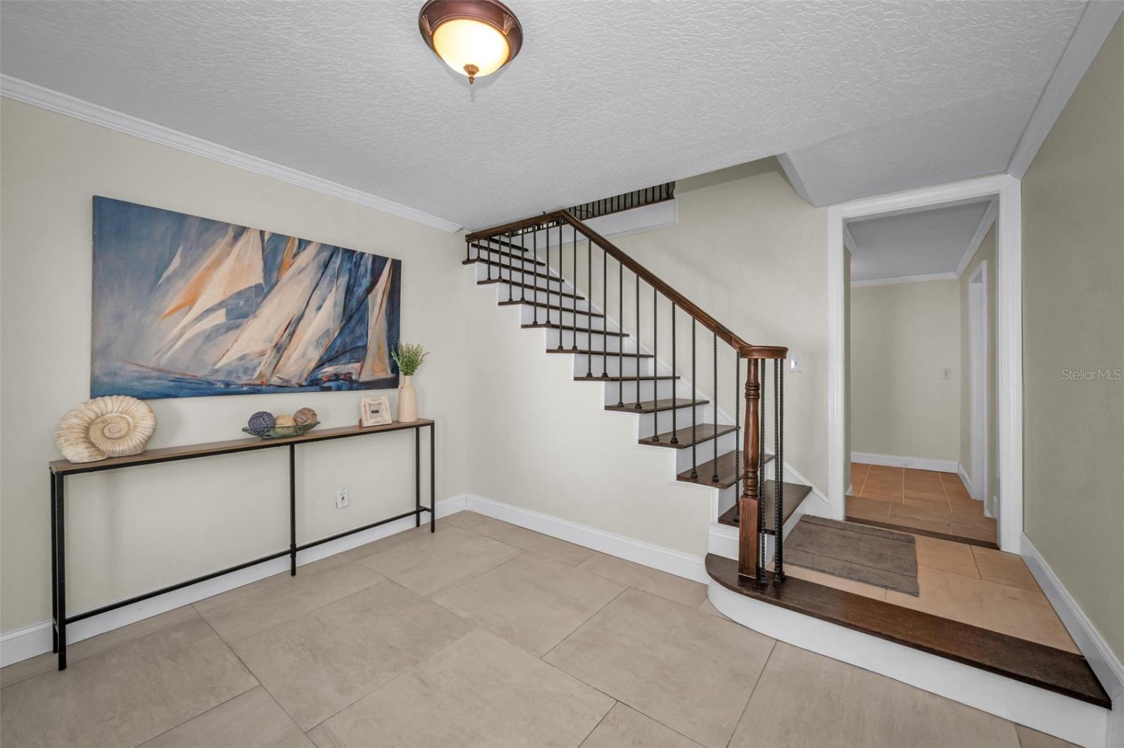Grande entrada de saguão com escada ampla e fusos metálicos personalizados