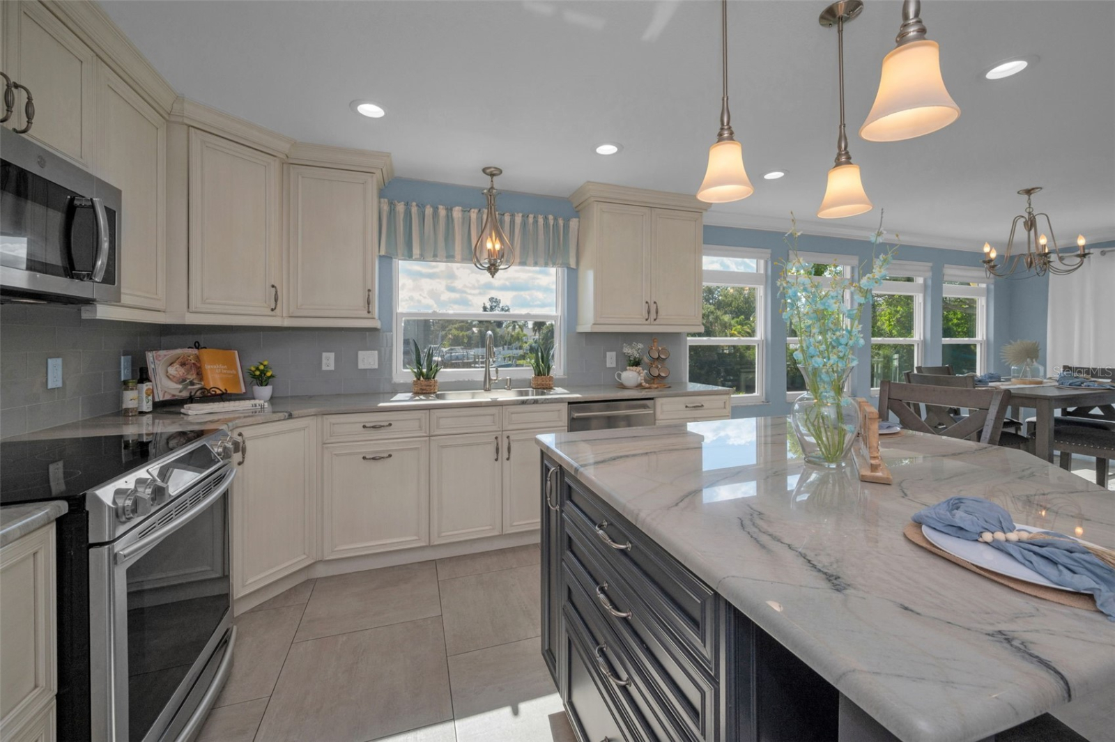 Cozinha dos sonhos do chef: armários de design em madeira maciça, bancadas de granito, eletrodomésticos de aço inoxidável e uma grande despensa com acesso
