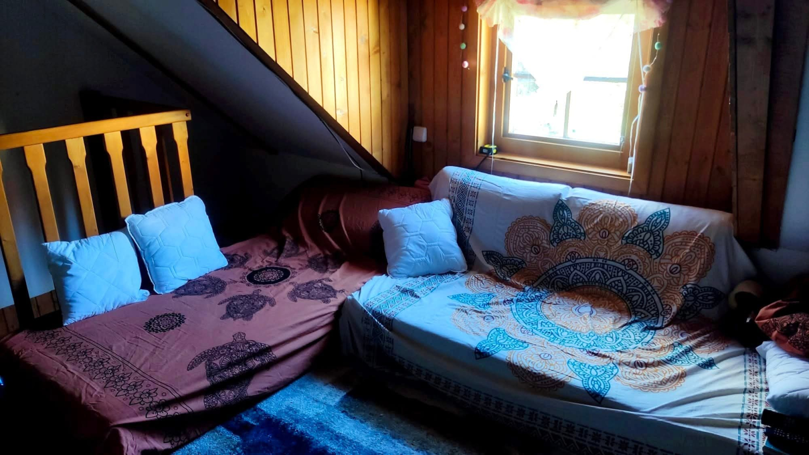 Alguns degraus acima, o andar superior oferece um espaço de convivência em planta aberta, um grande quarto com varanda e uma cama king size (180×200 cm), um segundo quarto com cama de casal (140×200 cm) e um pequeno quarto infantil com uma cama individual elevada (90×200 cm). Há também um banheiro separado neste andar.