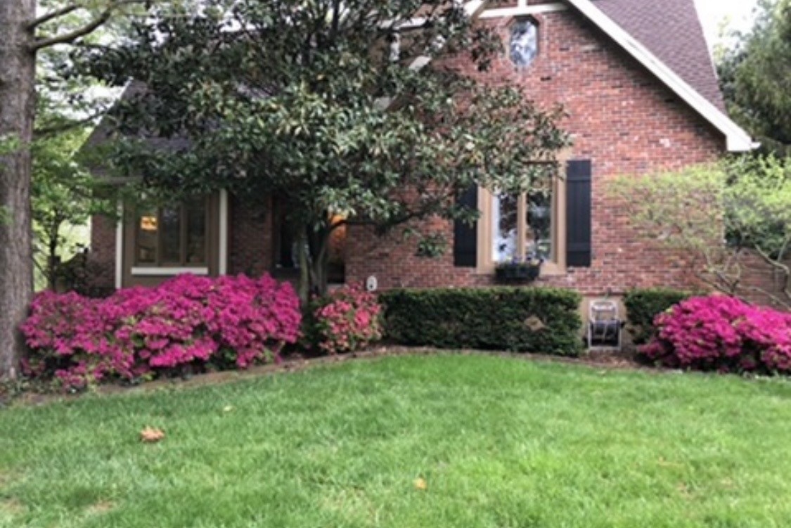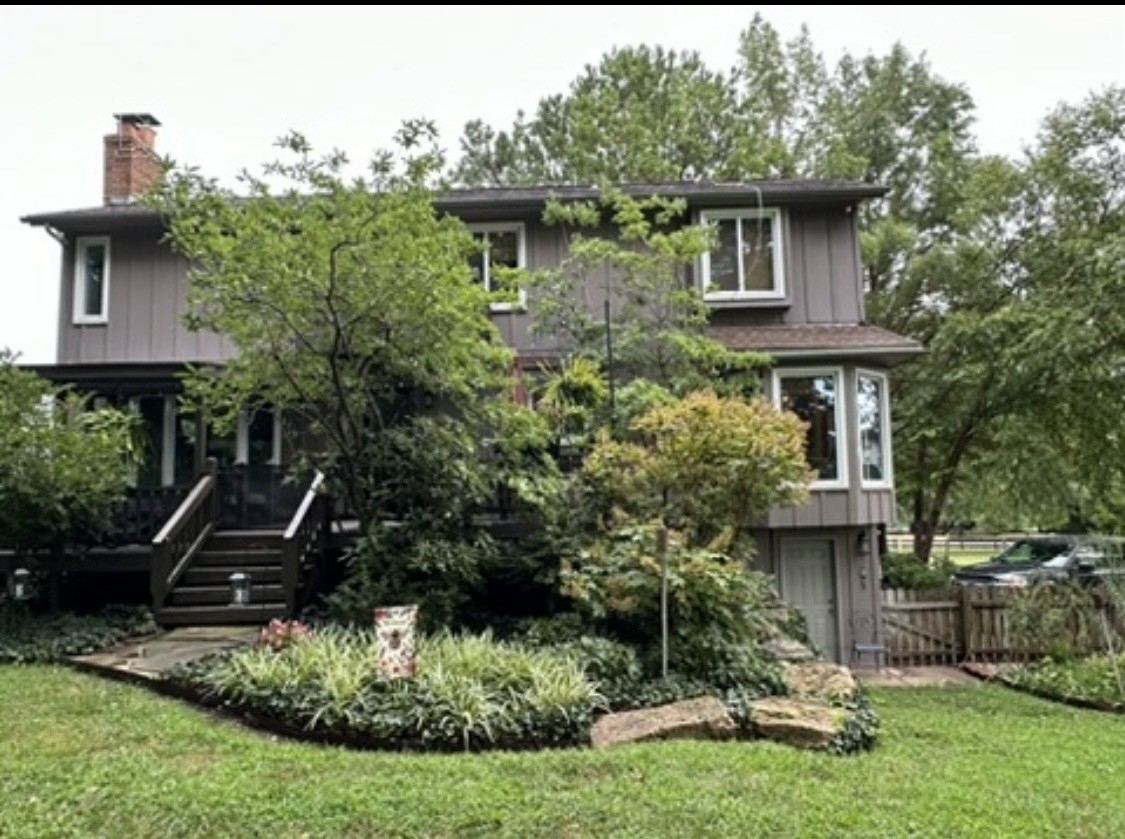 Nossa casa é uma clássica residência de dois andares, cercada por árvores maduras e jardins exuberantes. O quintal fica sombreado a maior parte do dia, tornando-se o local perfeito para refeições tranquilas ao ar livre no verão do Missouri.